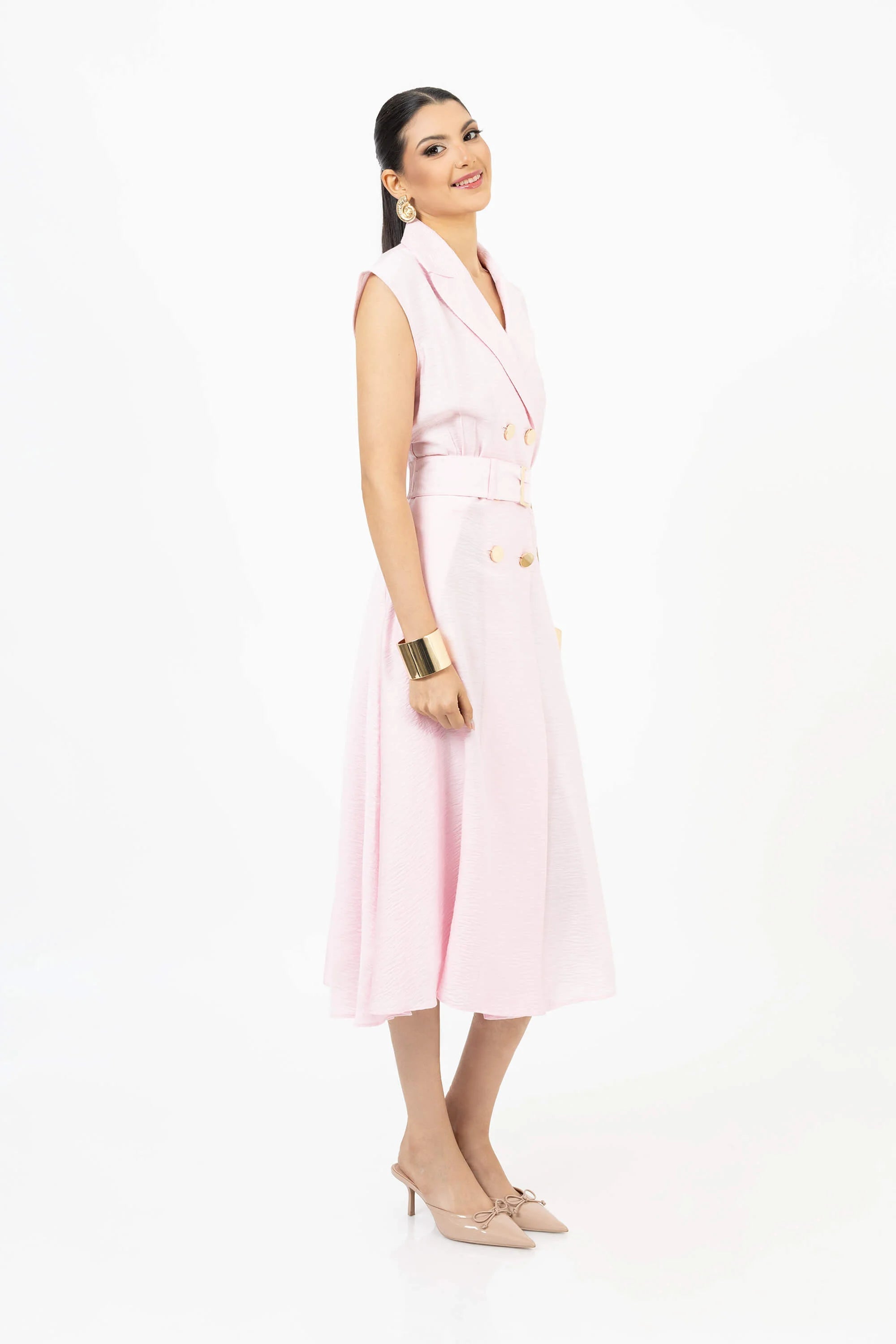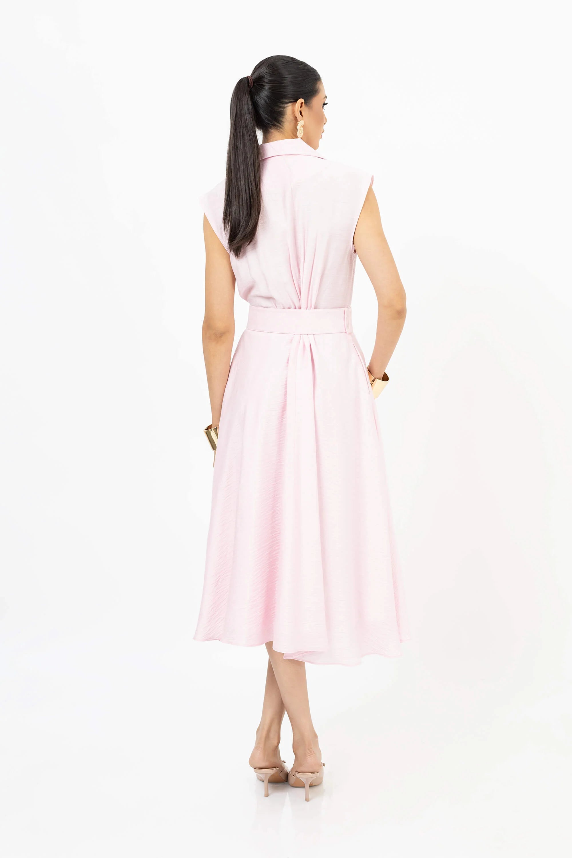 El vestido camisero con solapa y bolsas de costado combina el refinamiento clásico con un enfoque moderno y funcional. Su diseño estructurado sin mangas, evoca feminidad, frescura y poder silencioso.