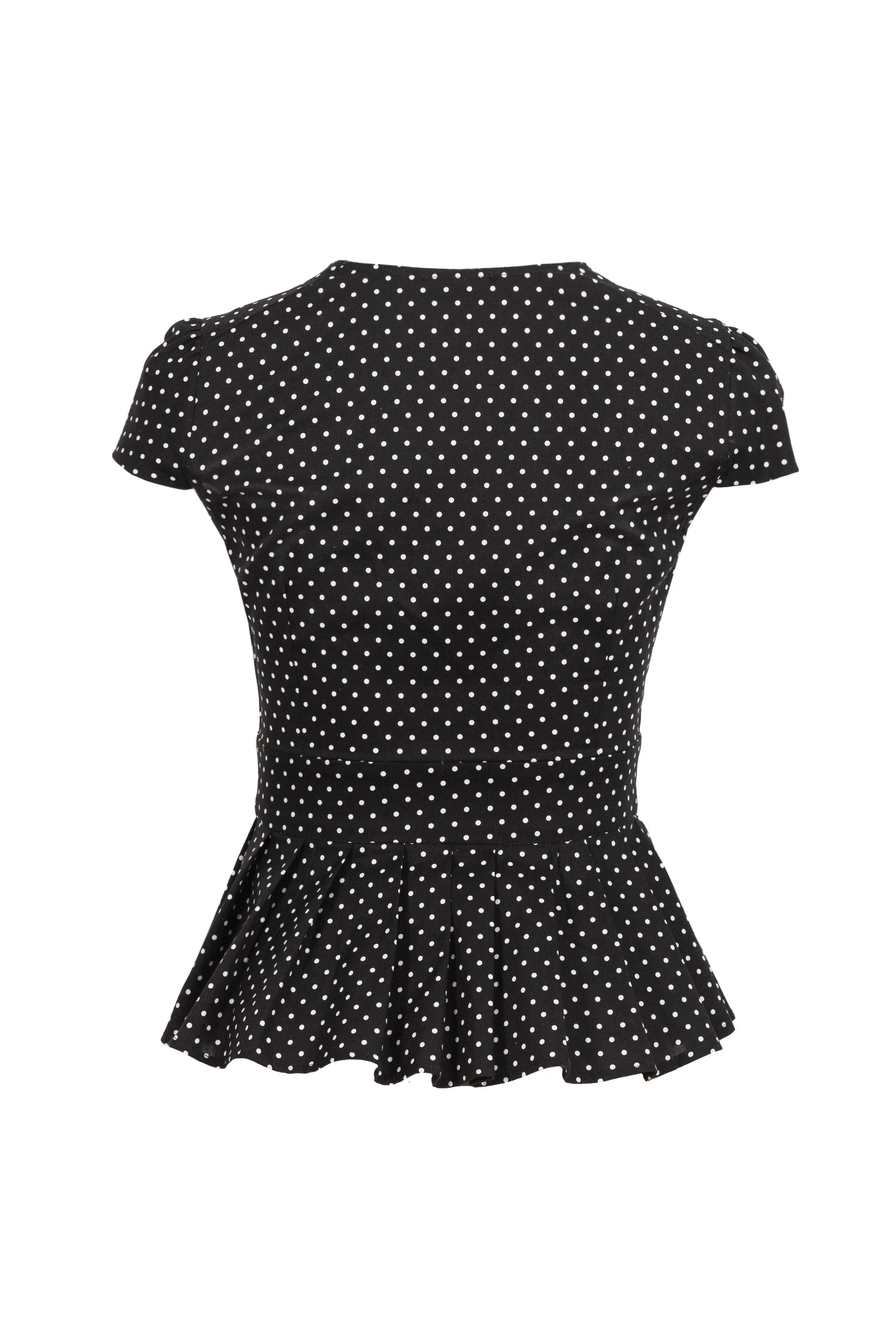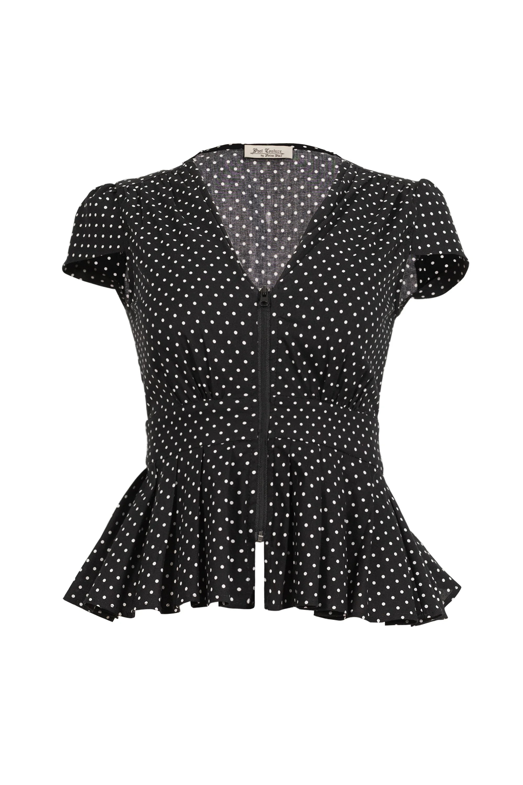 Blusa con peplum y cierre al frente color negro con lunares blanco.