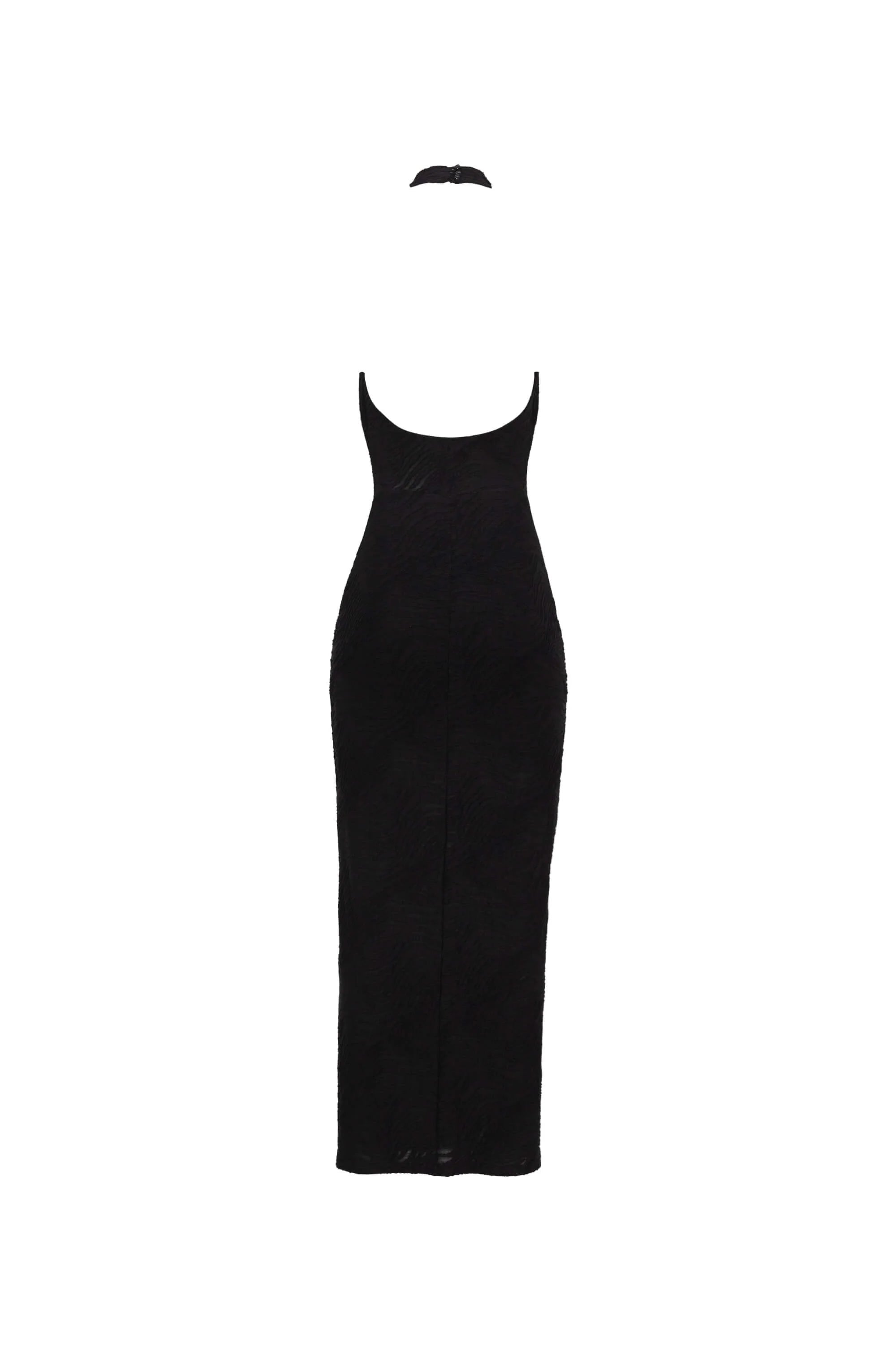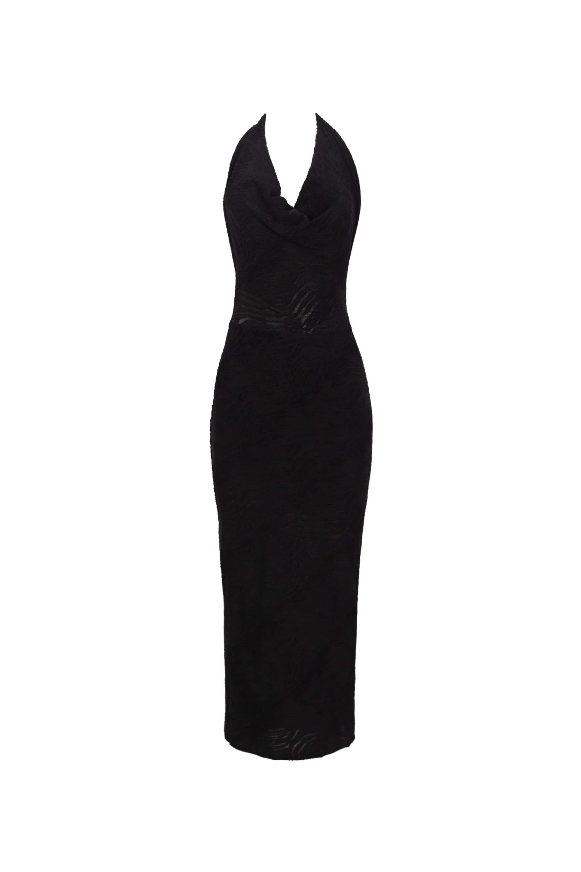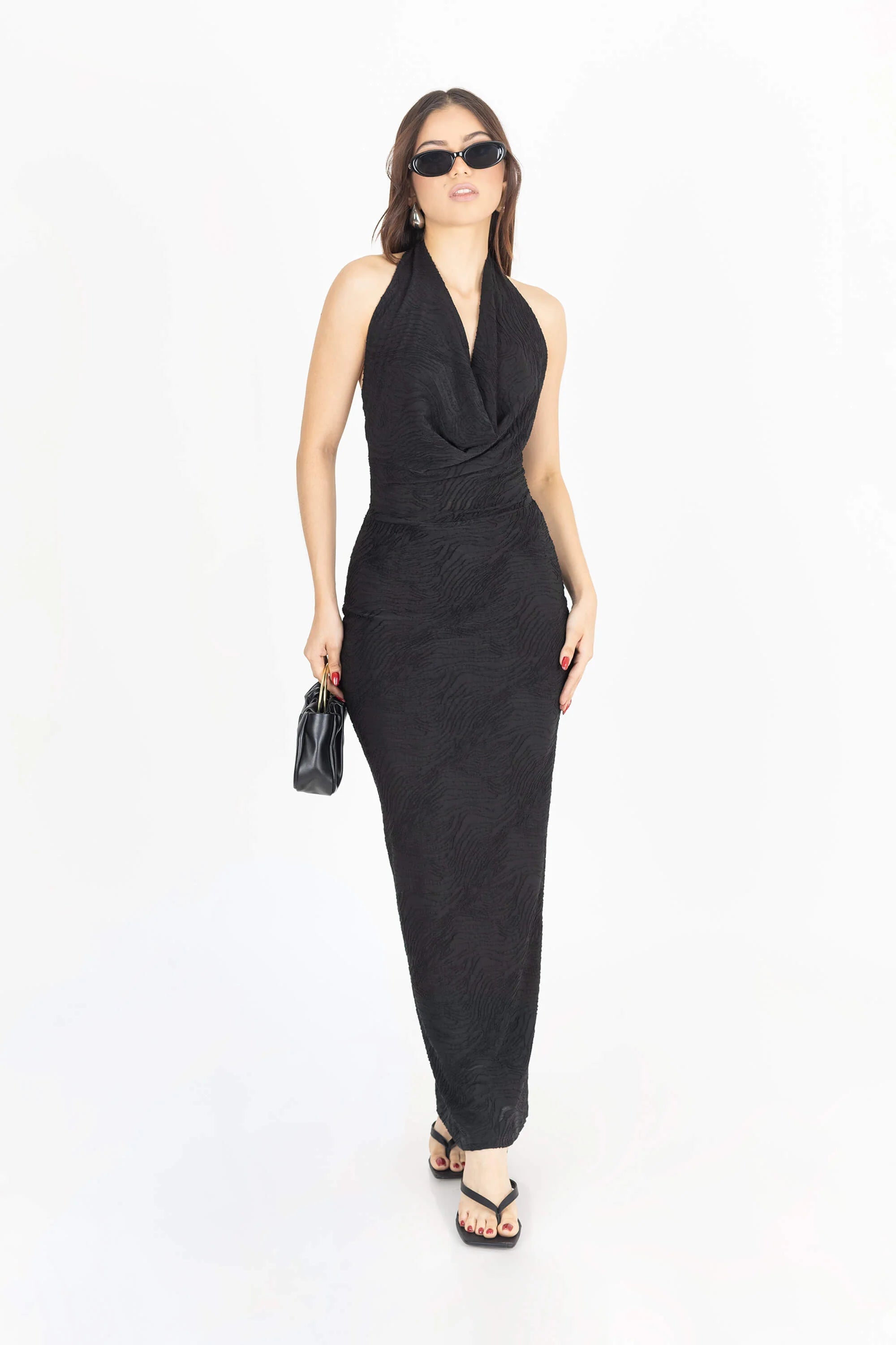 El vestido largo con escote columpio es una pieza que celebra la sensualidad discreta y el lujo artesanal. Confeccionado en un tejido negro con sutil textura orgánica, este diseño abraza la silueta con un corte ceñido que realza las curvas de manera sofisticada.