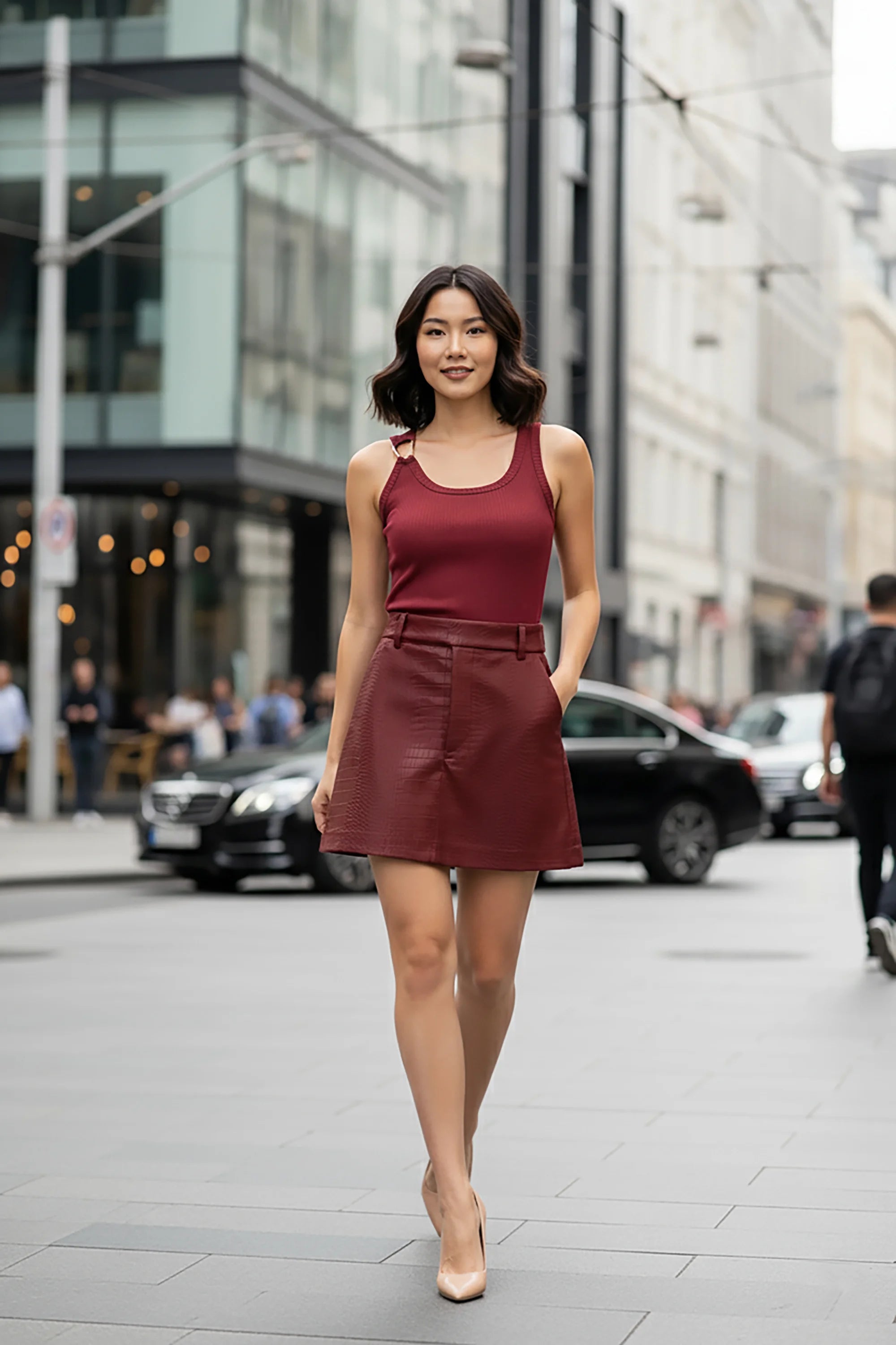 El herraje en el hombro añade un elemento moderno y visual, transformando una silueta básica en una pieza statement.