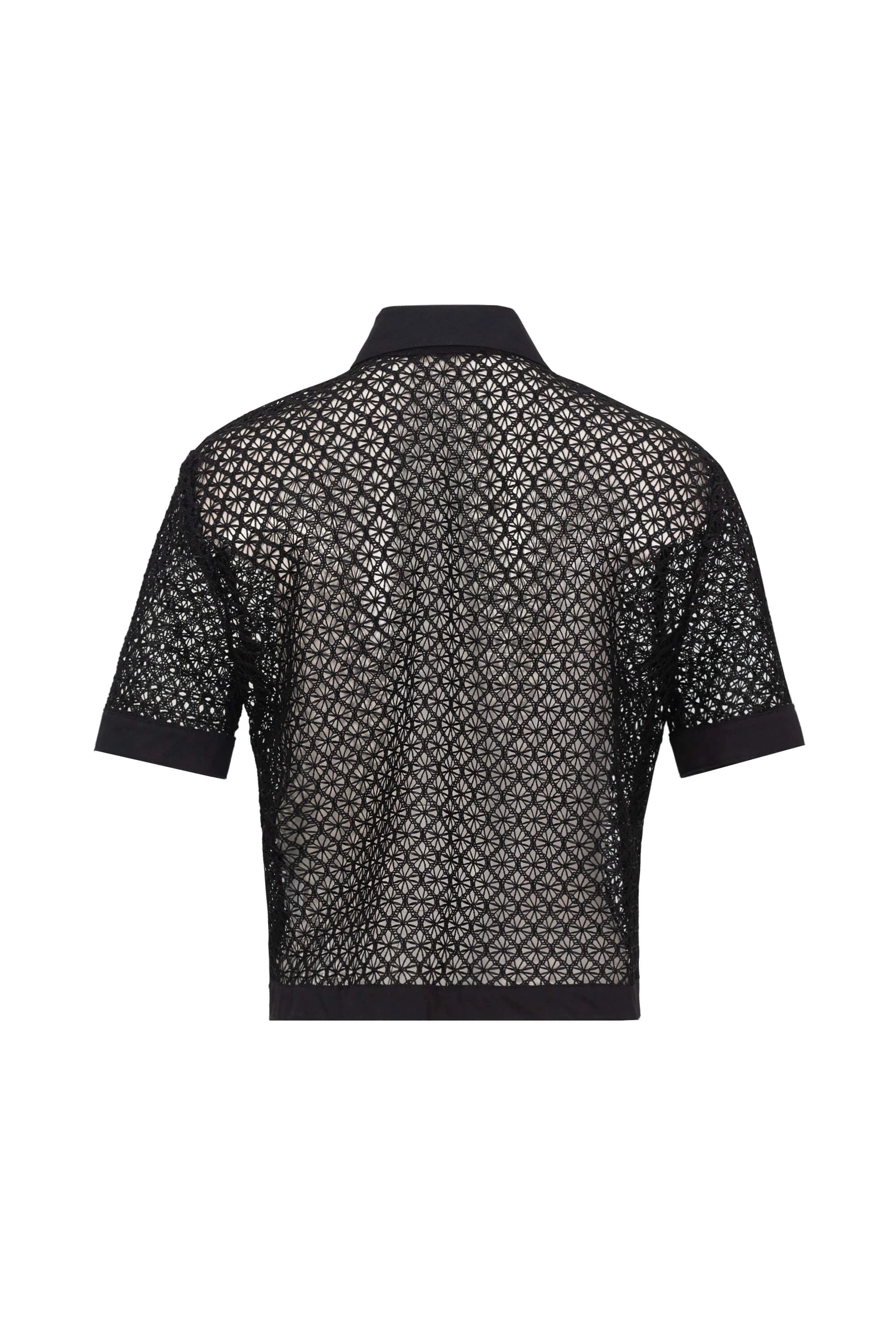 Esta blusa camisera de manga corta redefine el estilo clásico con un toque moderno. Su tejido semitransparente con patrón geométrico aporta textura visual y un aire vanguardista ideal para elevar cualquier outfit.