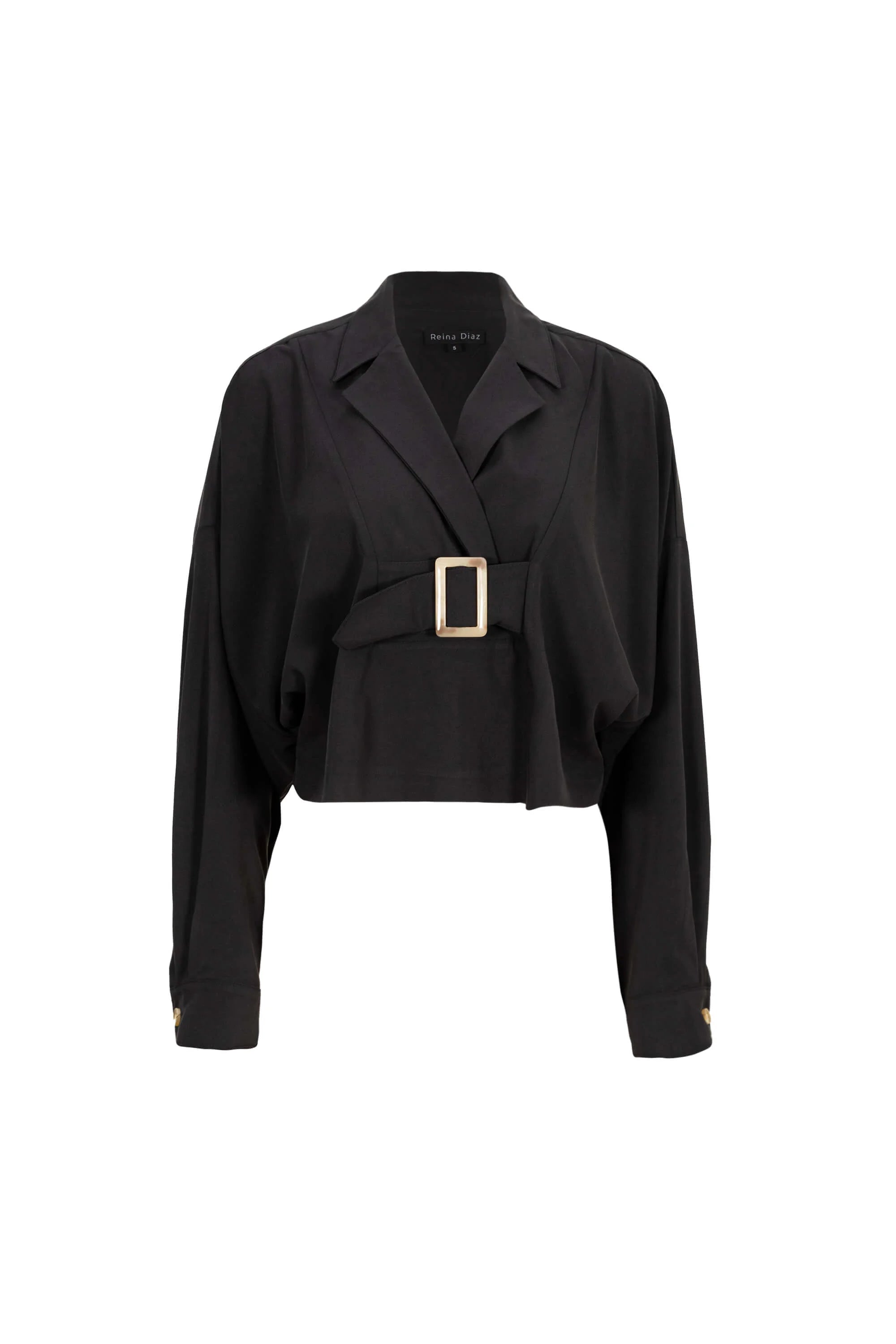 La chaqueta corta con manga dolman, puño y cinto con hebilla es una pieza que eleva cualquier look con su carácter arquitectónico y refinado. Su manga dolman aporta un aire contemporáneo y estructurado, mientras que el cinturón con hebilla central define la silueta y enmarca la cintura con distinción.