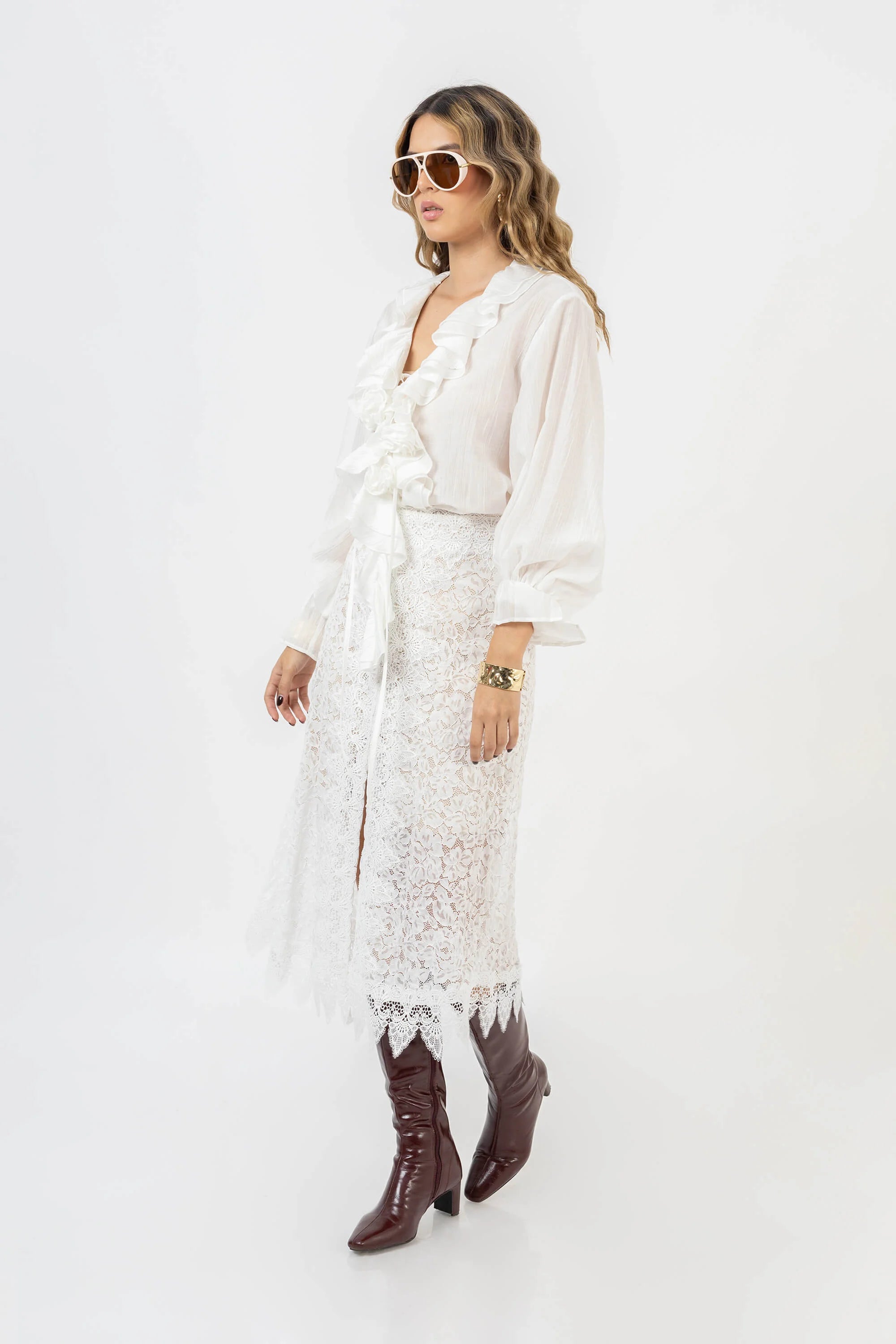 Confeccionada en fino encaje, esta falda captura la esencia del estilo clásico con un toque contemporáneo. Los avíos decorativos aportan distinción y modernidad al diseño. Una pieza versátil que refleja el ADN de la marca: elegancia, feminidad y atención a los detalles. Perfecta para combinar con blusas satinadas o tops estructurados.