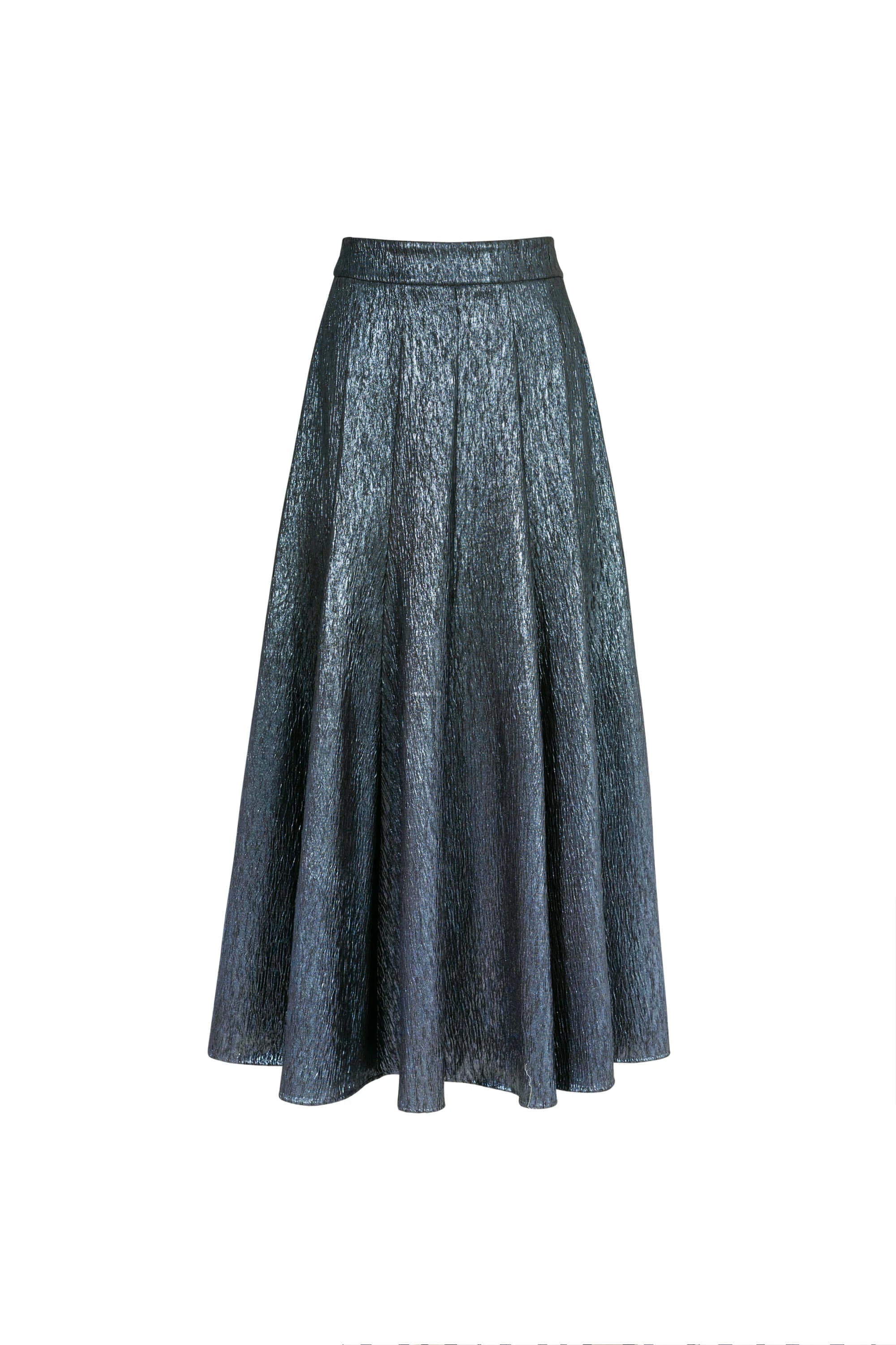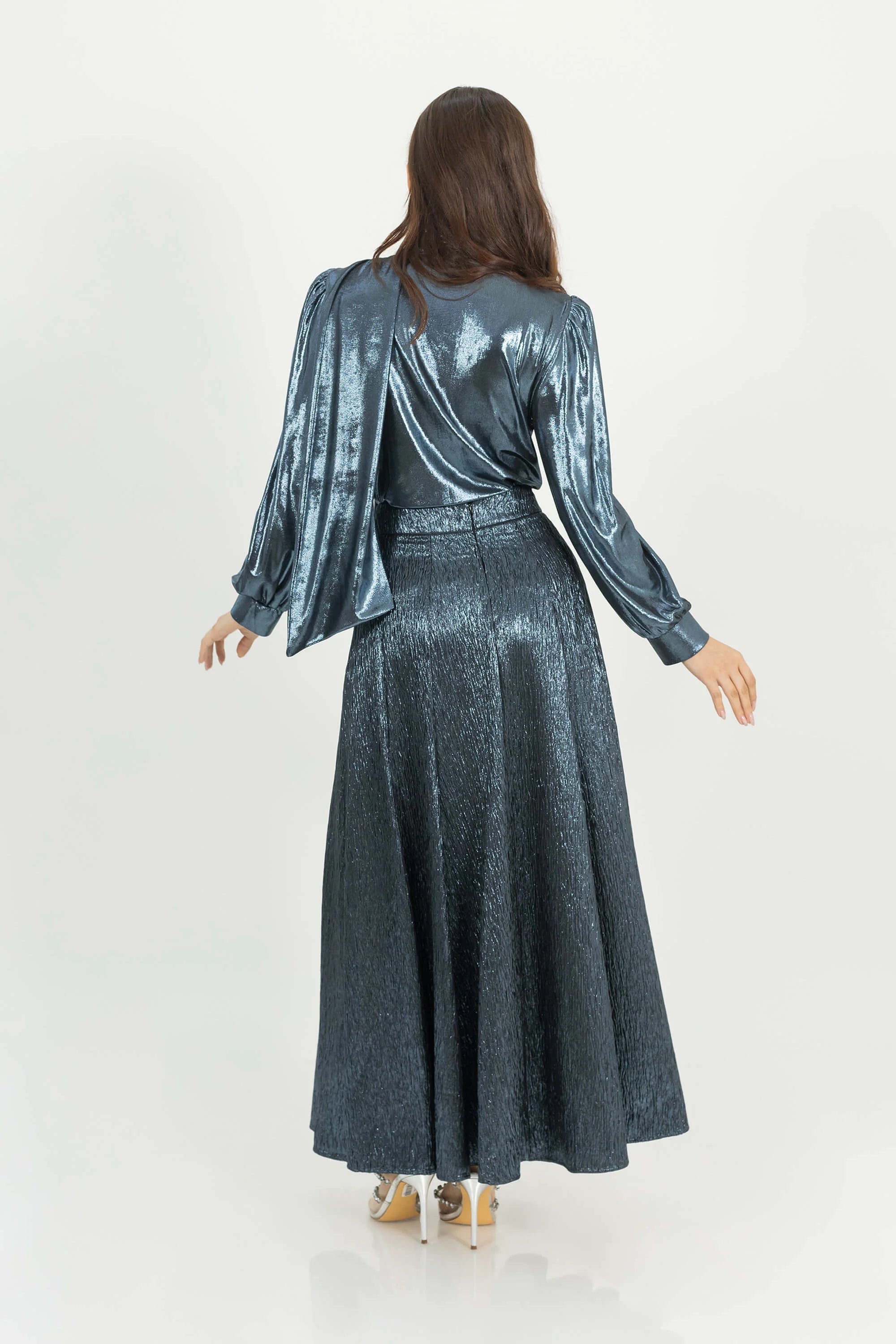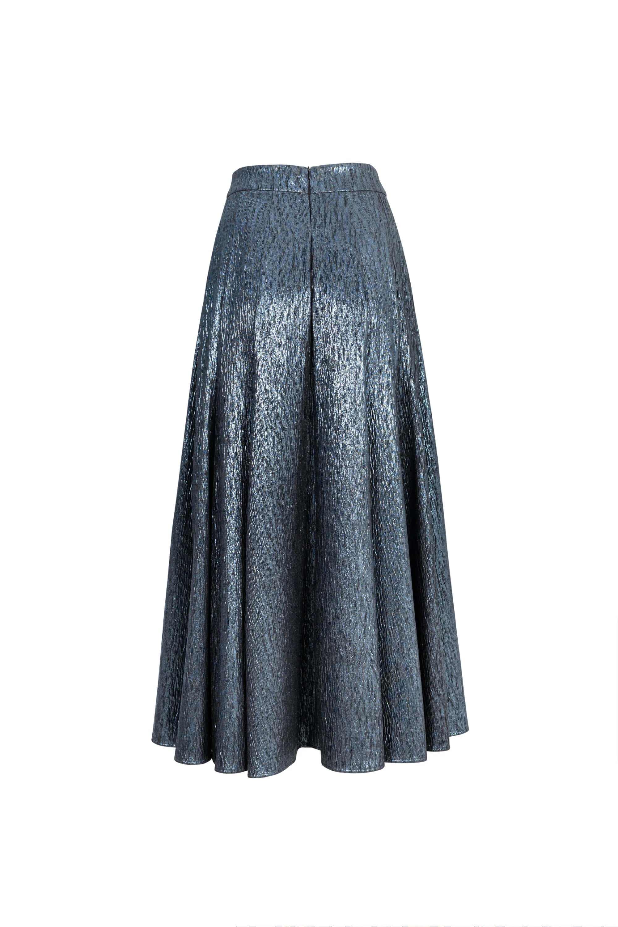 La falda larga de cuchillas es una pieza que captura la esencia del lujo artesanal con un diseño que estiliza y aporta movimiento a cada paso. Confeccionada en un tejido con sutil brillo metálico, esta falda fluye con naturalidad, creando un efecto visual impactante y sofisticado.
