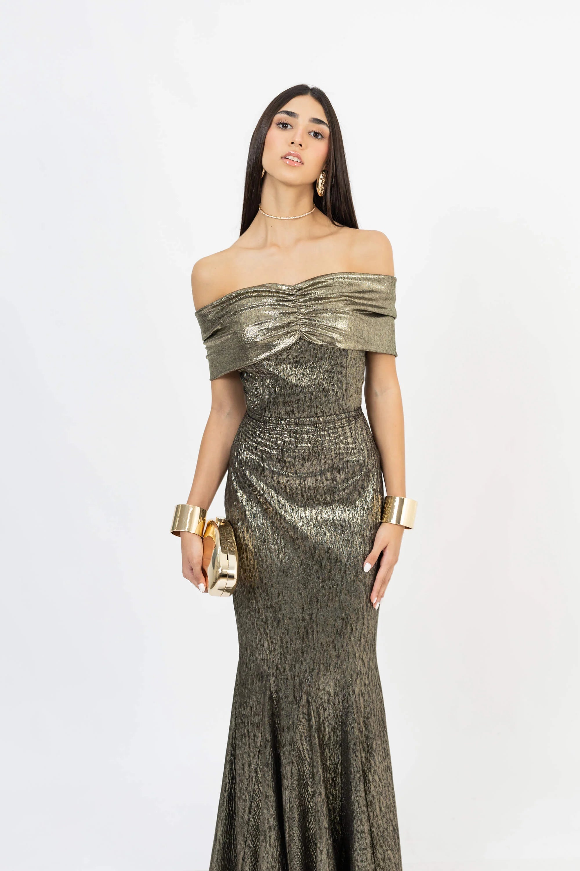 El vestido strapless metálico con franja en escote y detalle de cuchillas es la definición de alta costura contemporánea. Esta creación, confeccionada en un textil de efecto metalizado que captura la luz con un brillo sutil y refinado, es una prenda que transforma cualquier ocasión en un evento memorable.