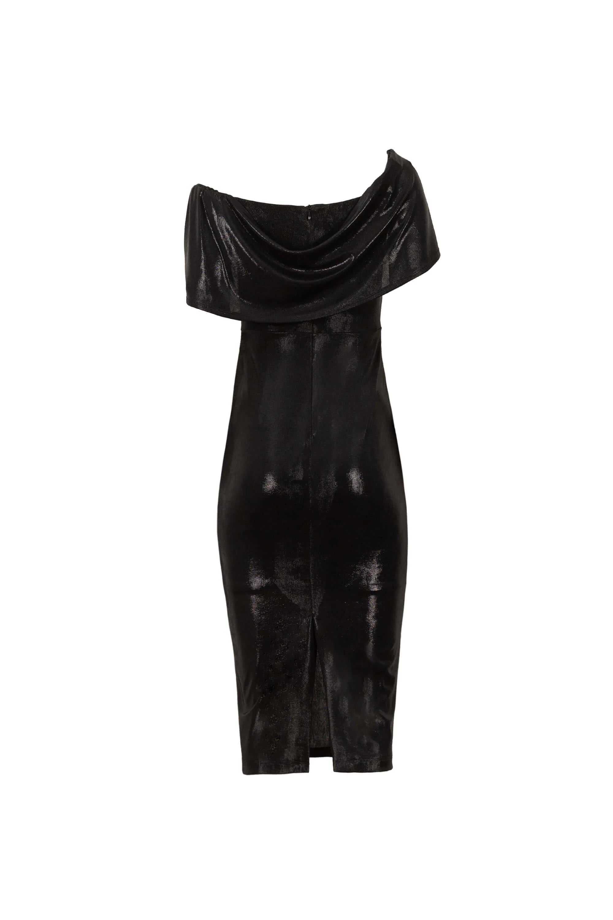 El vestido midi asimétrico negro con tira en escote es una oda a la elegancia atemporal. Confeccionado en un textil de acabado satinado con un sutil efecto de brillo, esta pieza envuelve la silueta con un corte impecable que celebra la sofisticación y el carácter de quien lo porta.