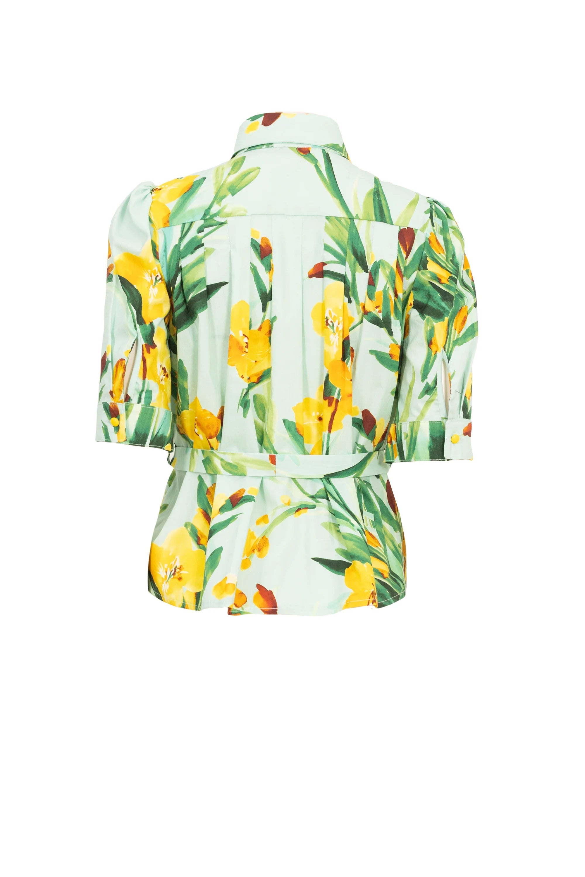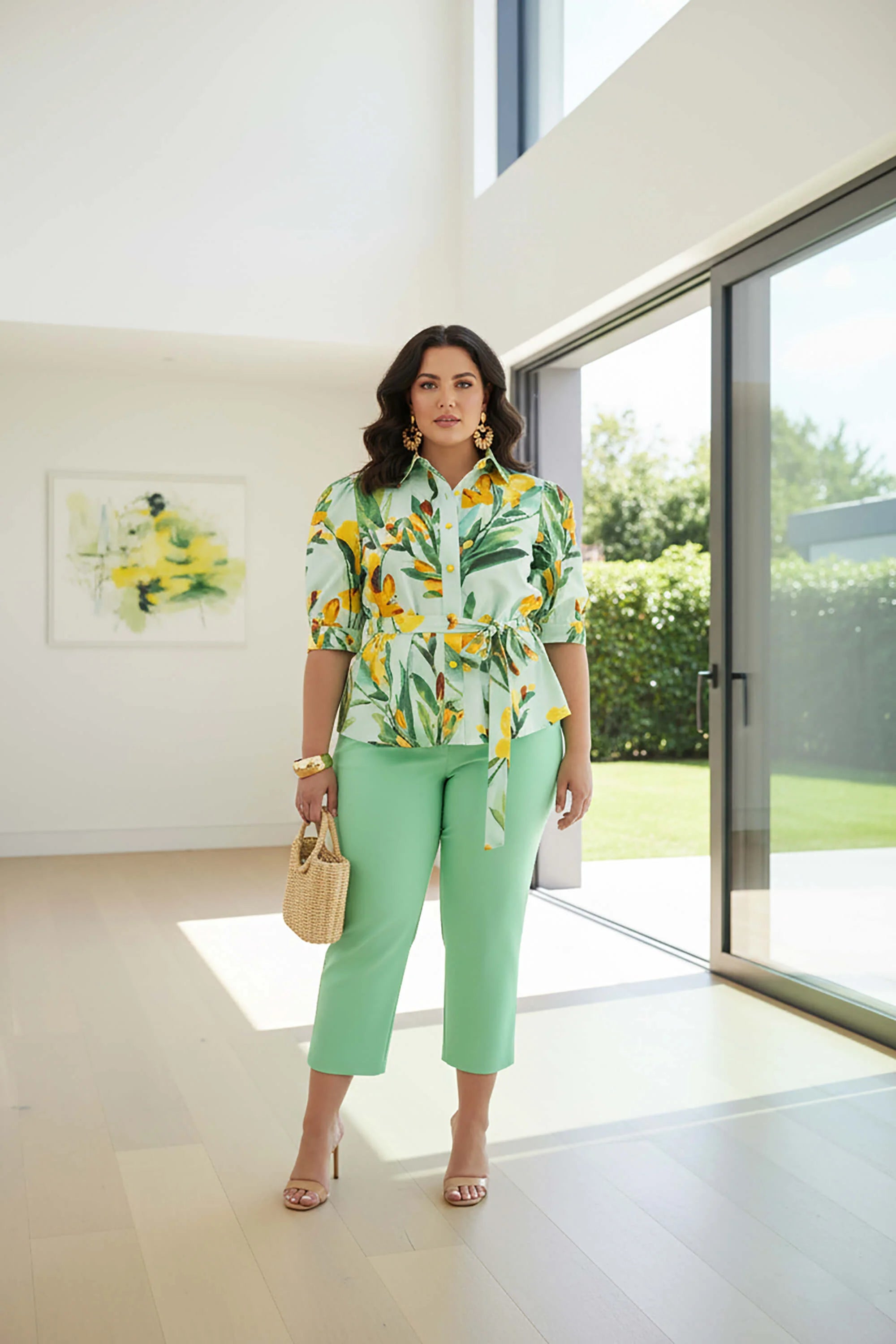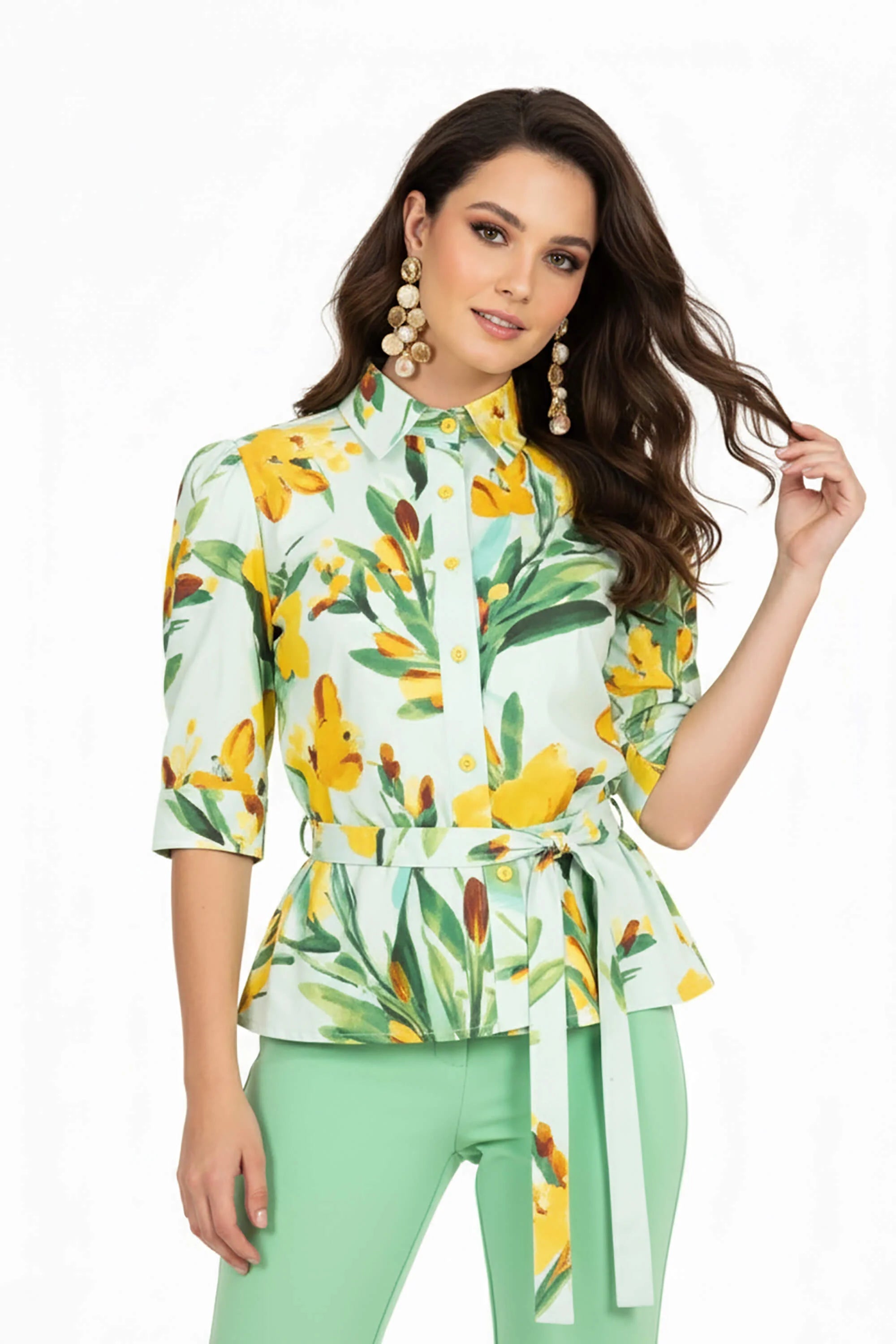 Blusa camisera con pliegues en los hombros y estampado floral. Diseño femenino, estructurado y Frescura, estructura y feminidad se encuentran en esta blusa camisera con pliegues en los hombros, una pieza que transforma lo cotidiano en elegante. Confeccionada en un textil ligero con fondo menta y un exuberante estampado floral en tonos amarillo y verde, esta blusa irradia vitalidad sofisticada.