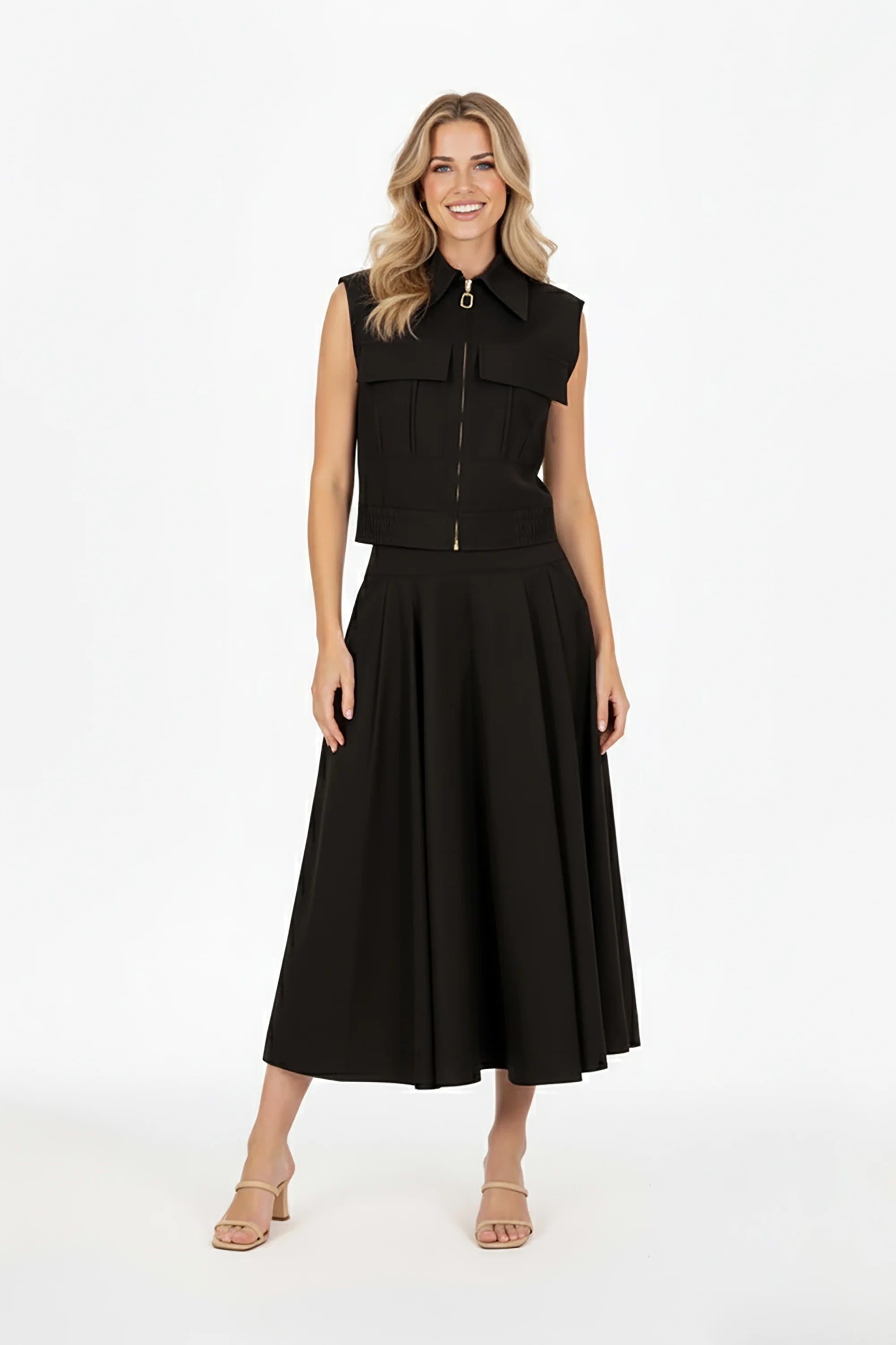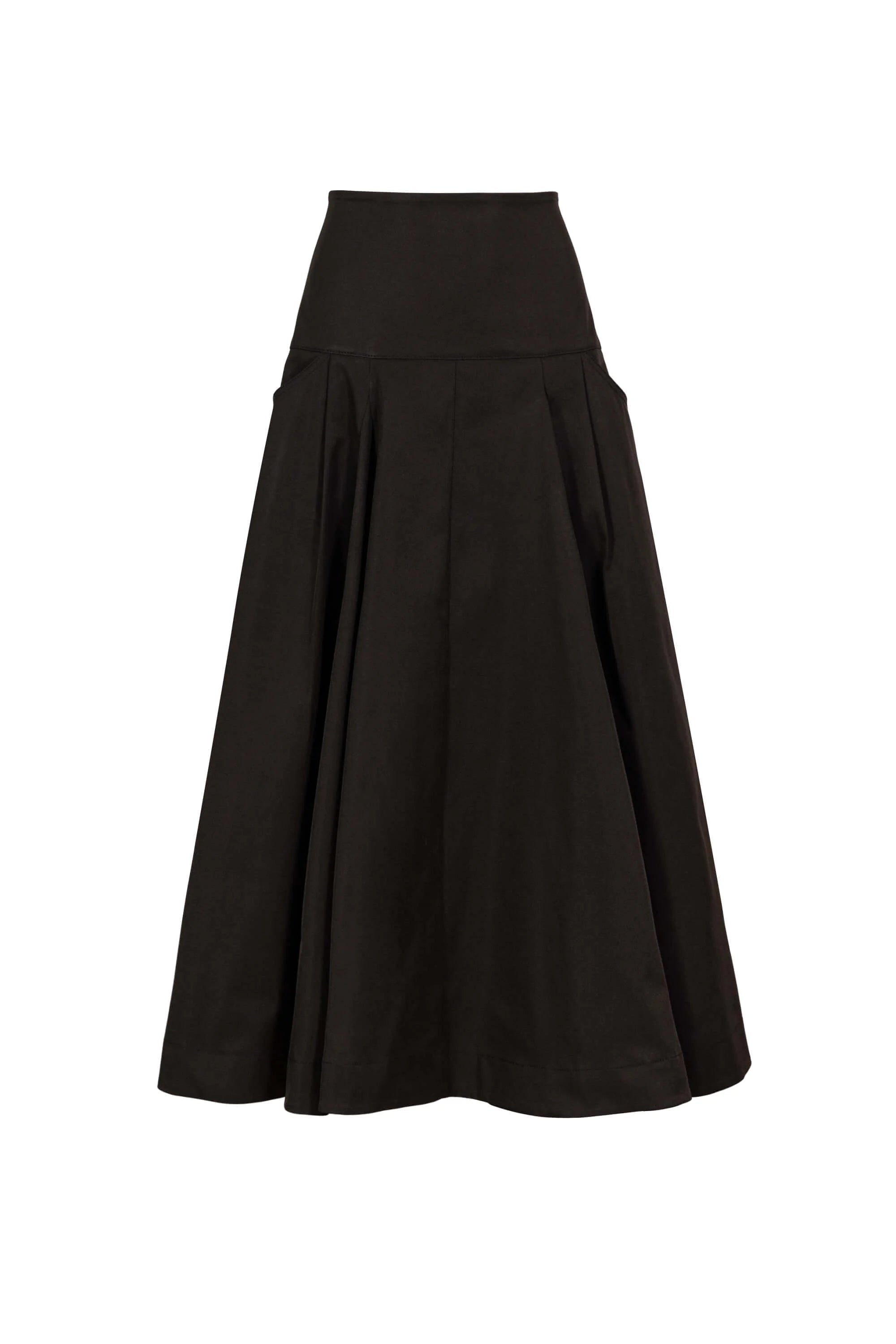 La falda midi amplia es un homenaje a la feminidad sofisticada y al movimiento elegante. Su silueta generosa crea un efecto fluido y etéreo, aportando dinamismo y comodidad sin perder el porte refinado que distingue a la marca.