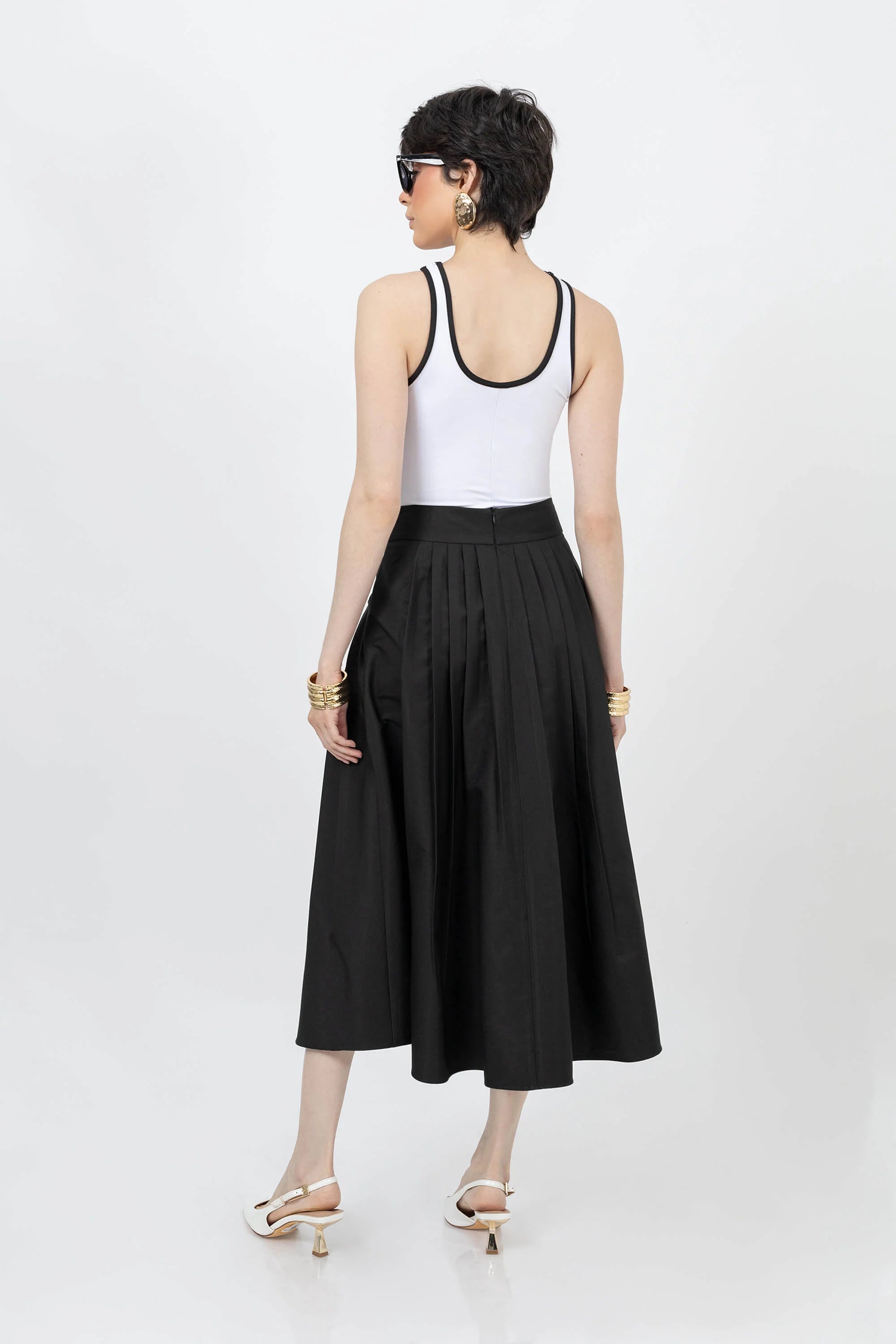 La Falda midi amplia con pliegues de Poet Couture es una prenda esencial que redefine la elegancia cotidiana. Confeccionada en un tejido suave con cuerpo, presenta una silueta amplia que brinda movimiento natural y sofisticación. Su diseño con pretina estructurada y pliegues frontales aporta un efecto visual favorecedor que estiliza la figura. Ideal para combinar con camisas ligeras o blusas de lino para un look moderno y refinado.