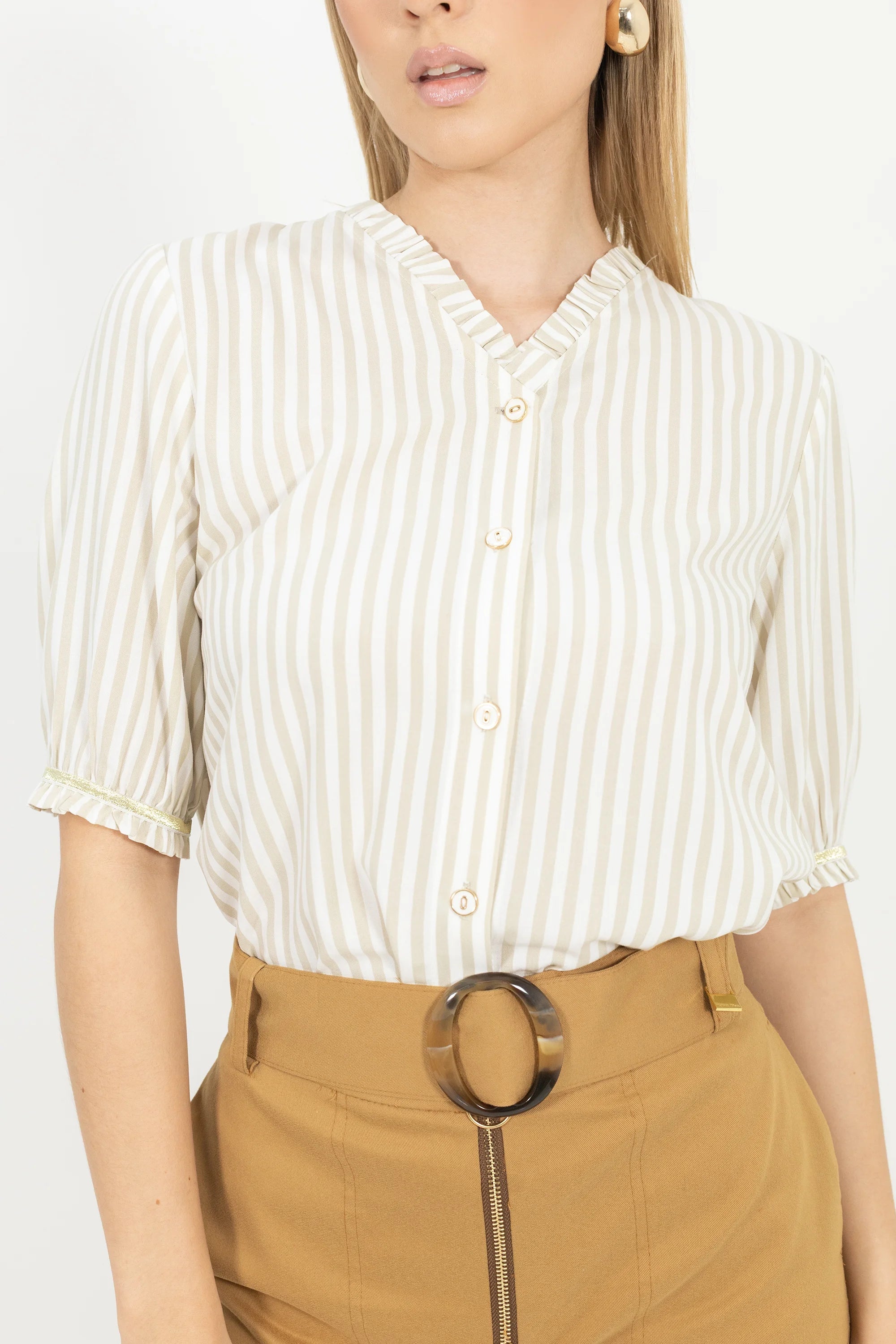 Pantalón caramelo con cortes marcados y bolsas cargo.