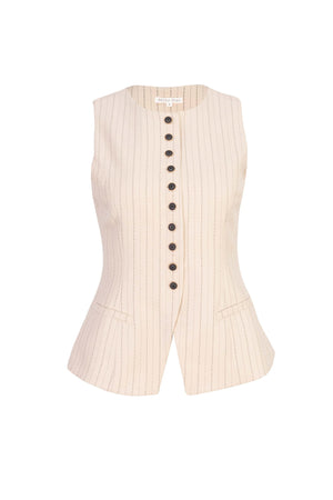 Saco color beige sin mangas, silueta entallada y vivos contrastantes.