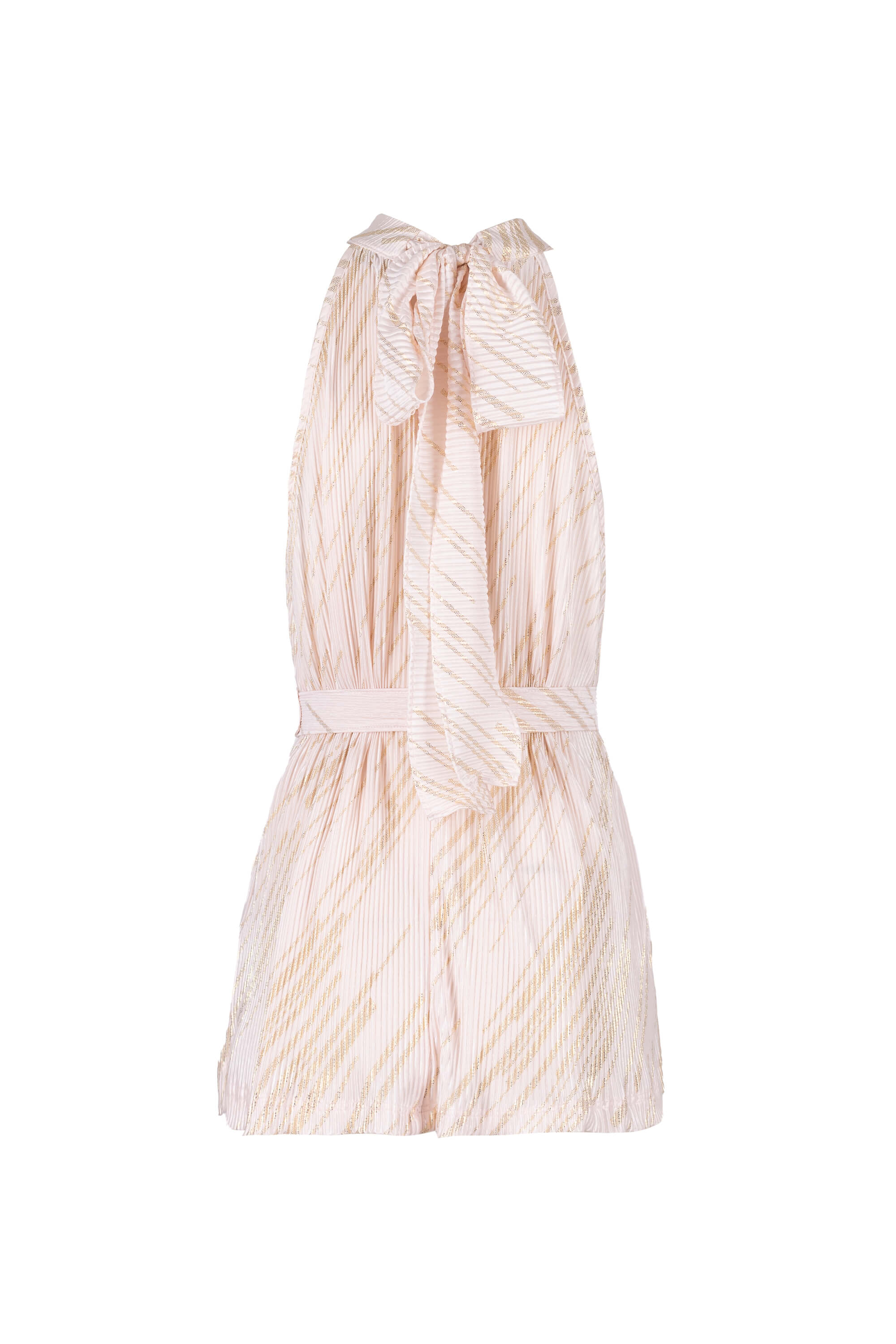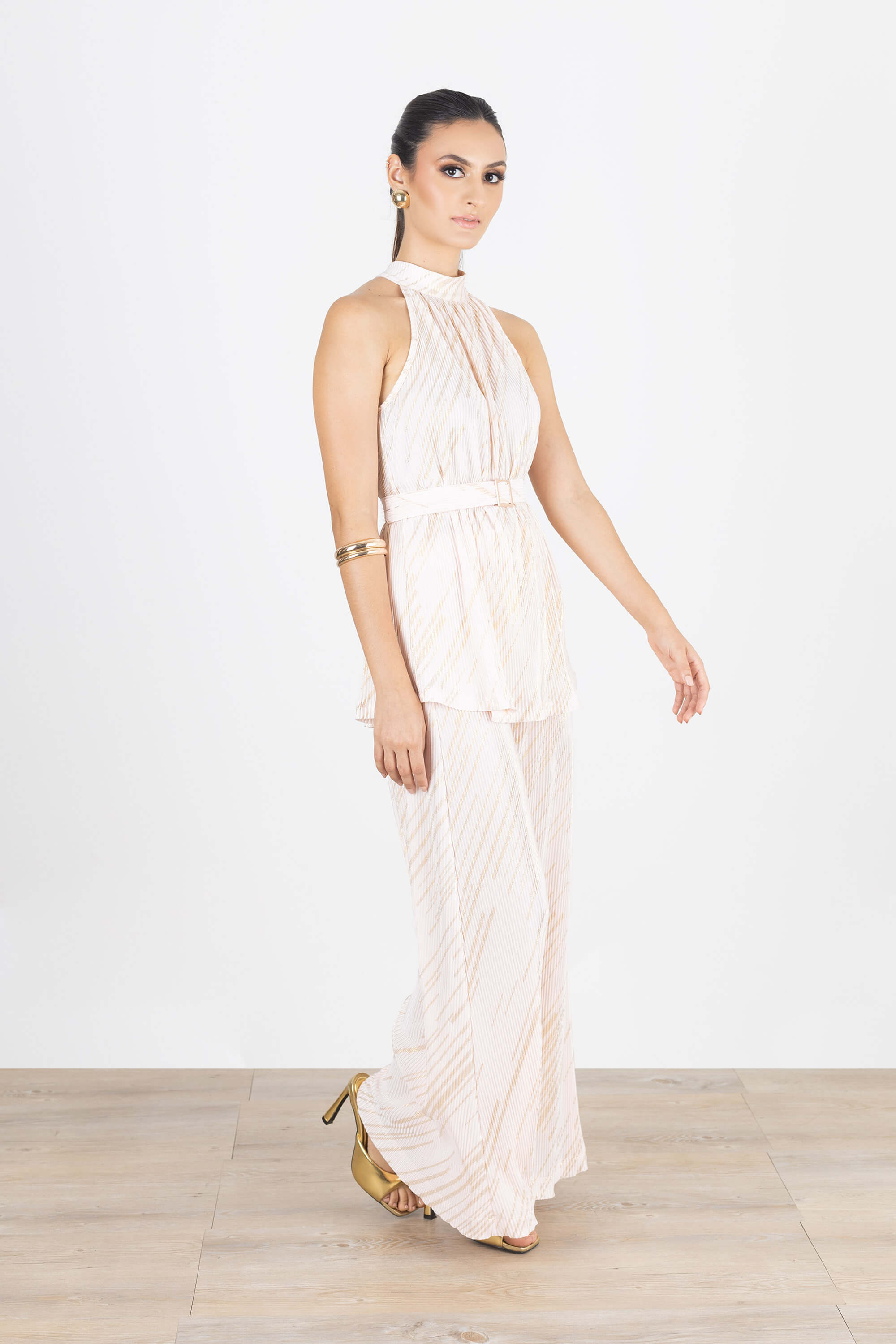 Blusa jersey pleat cuello alto lazo trasero, sin mangas y cinto con hebilla.