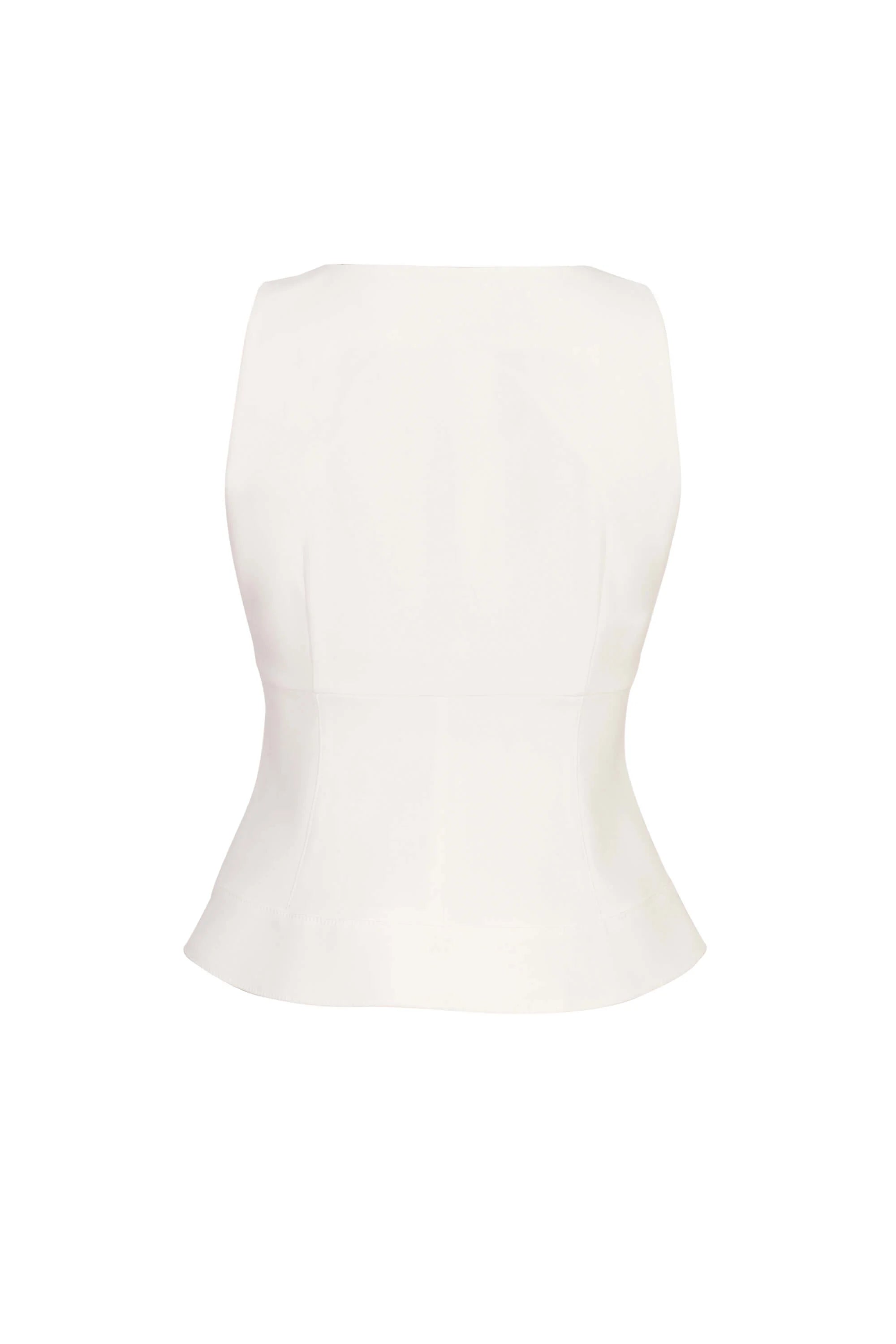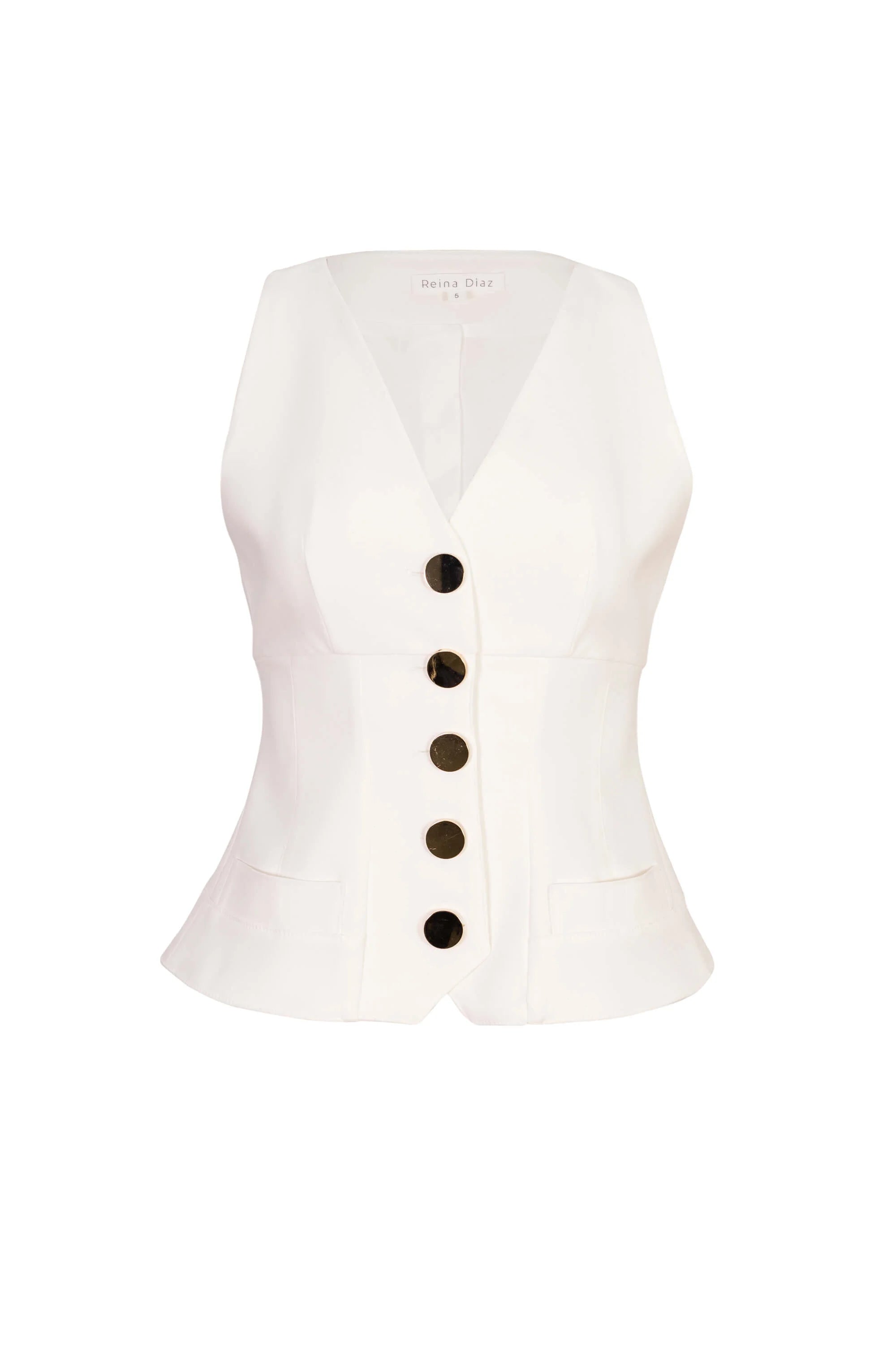 Este chaleco sin mangas de Reina Díaz es una declaración de estilo sobrio y refinado. Su corte alargado y entallado en la cintura realza la figura con sutileza, mientras que el escote redondo y la abertura inferior brindan un equilibrio perfecto entre estructura y ligereza.