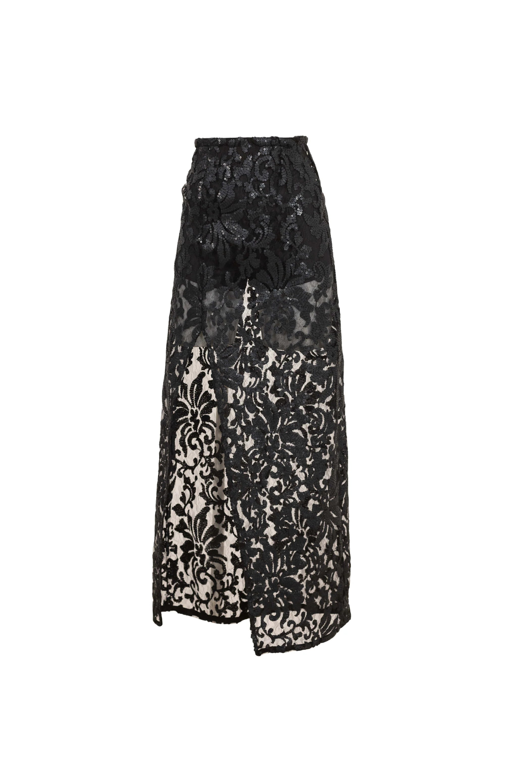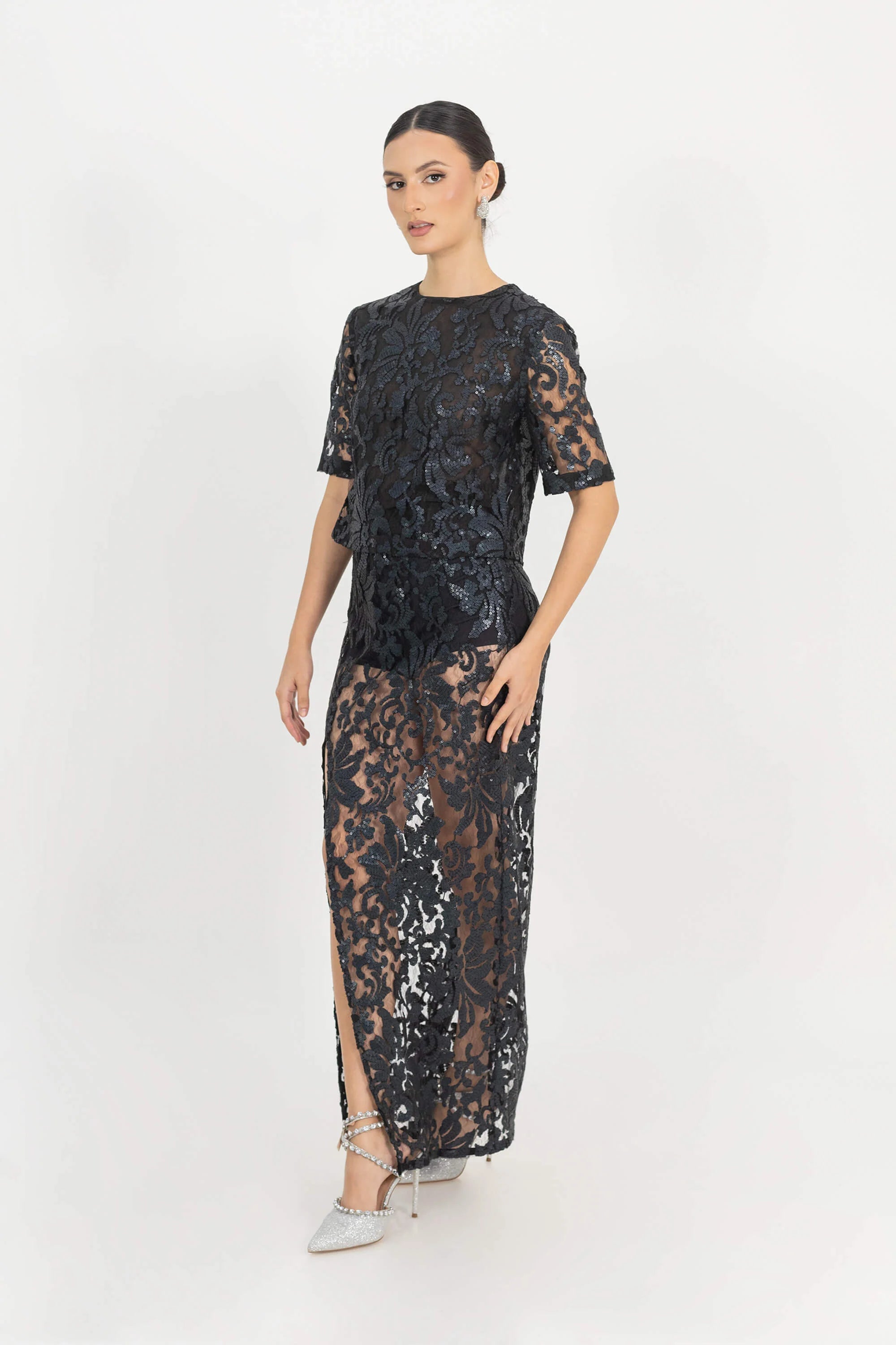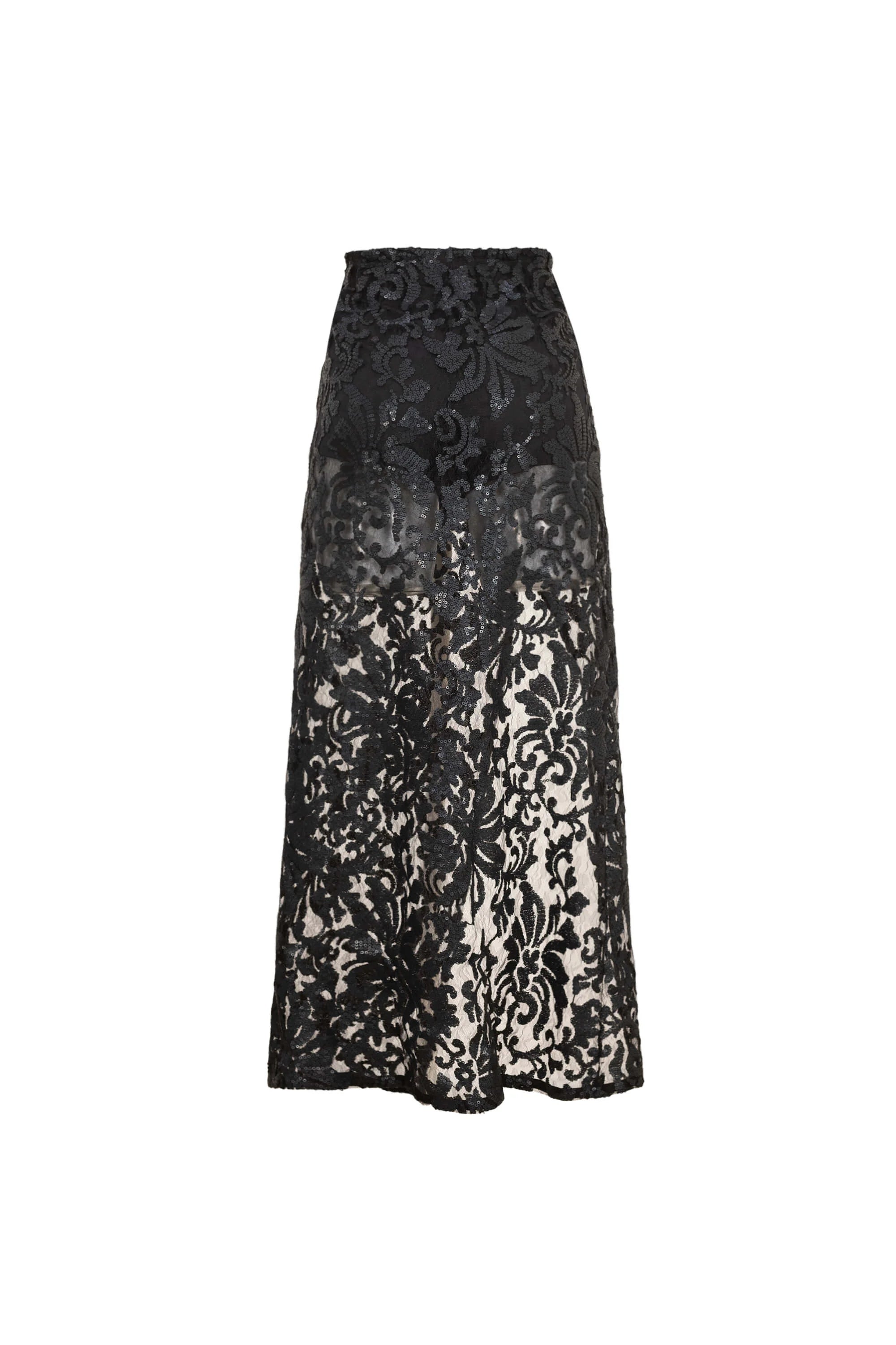 Diseñada para destacar con elegancia y sofisticación, esta falda recta con abertura en el costado derecho es una expresión de feminidad moderna. Su caída precisa estiliza la silueta mientras que el encaje delicado aporta un juego sutil de transparencias que insinúa sin revelar.