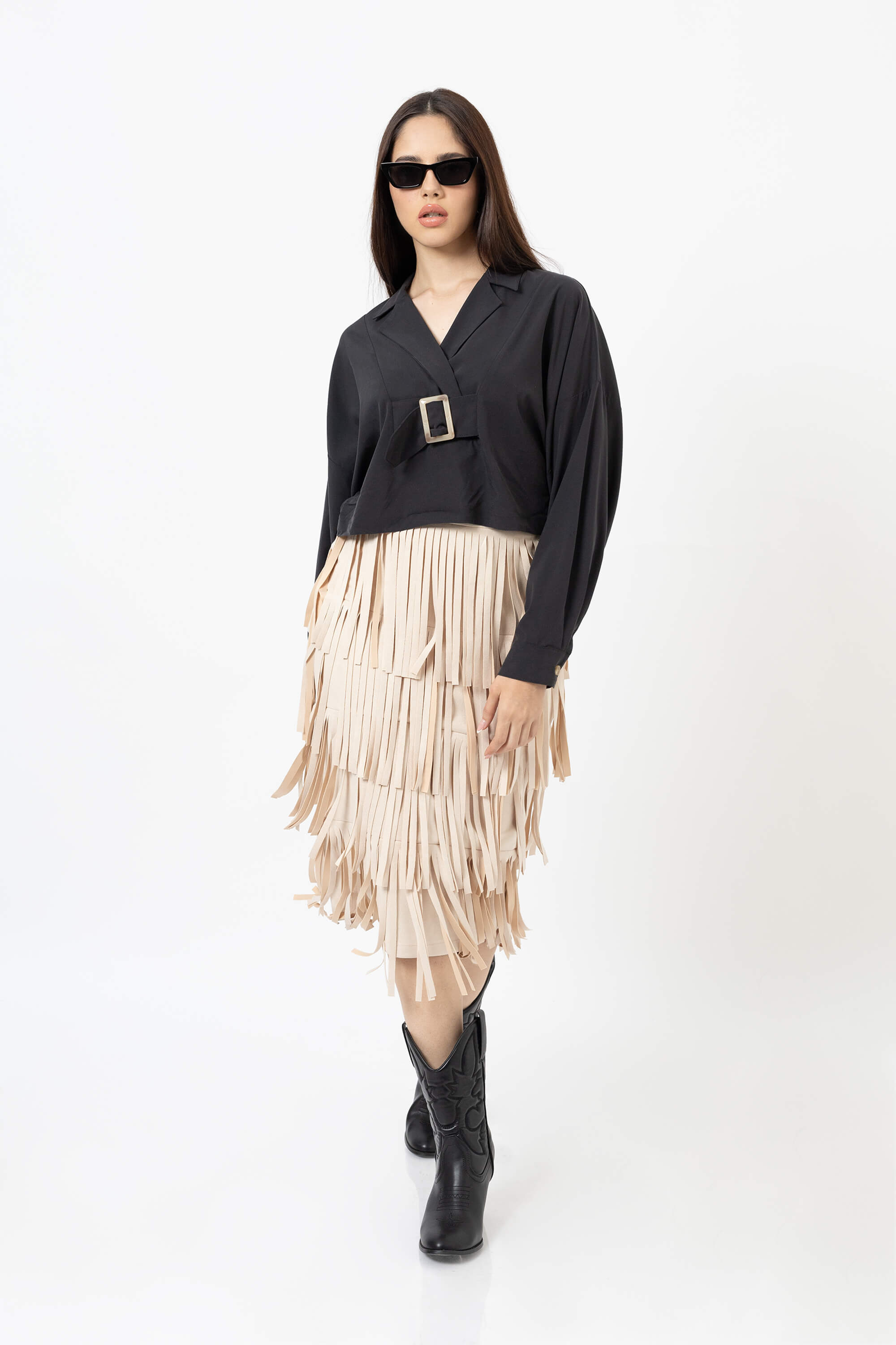 Esta falda midi fusiona estructura y dinamismo con un diseño de tiras largas tipo flecos dispuestos en niveles escalonados. La prenda ideal para mujeres que desean proyectar confianza, autenticidad y estilo contemporáneo.