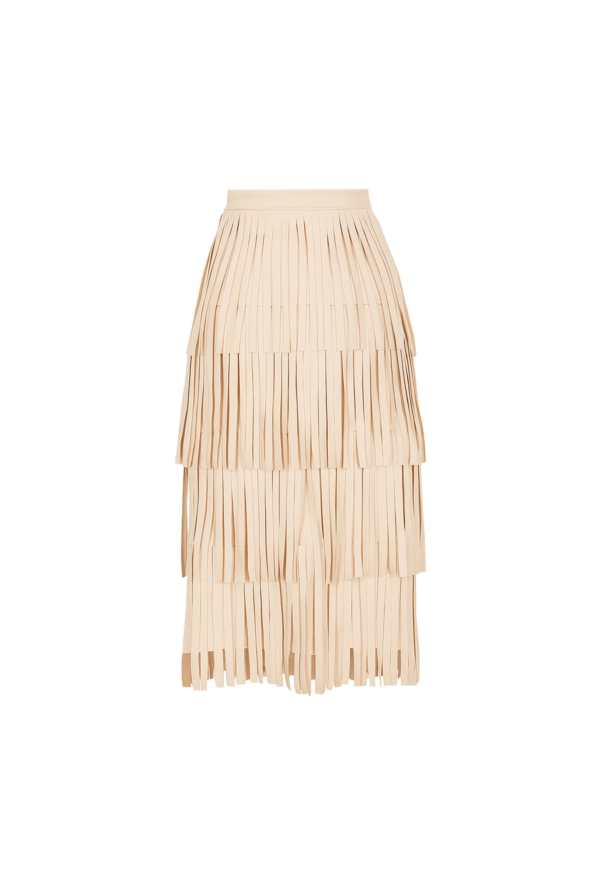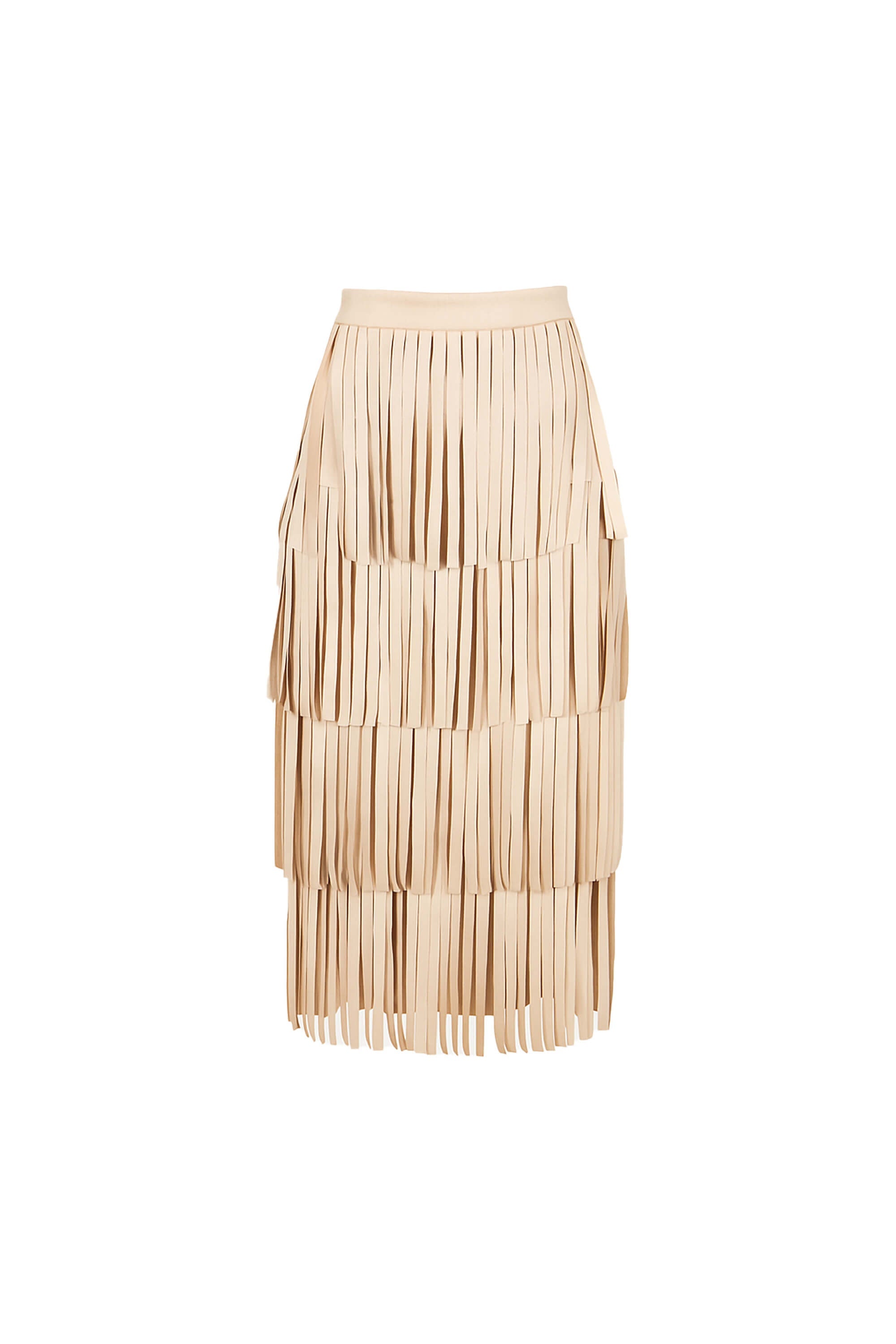 Falda midi beige con tiras largas tipo flecos en diseño escalonado.