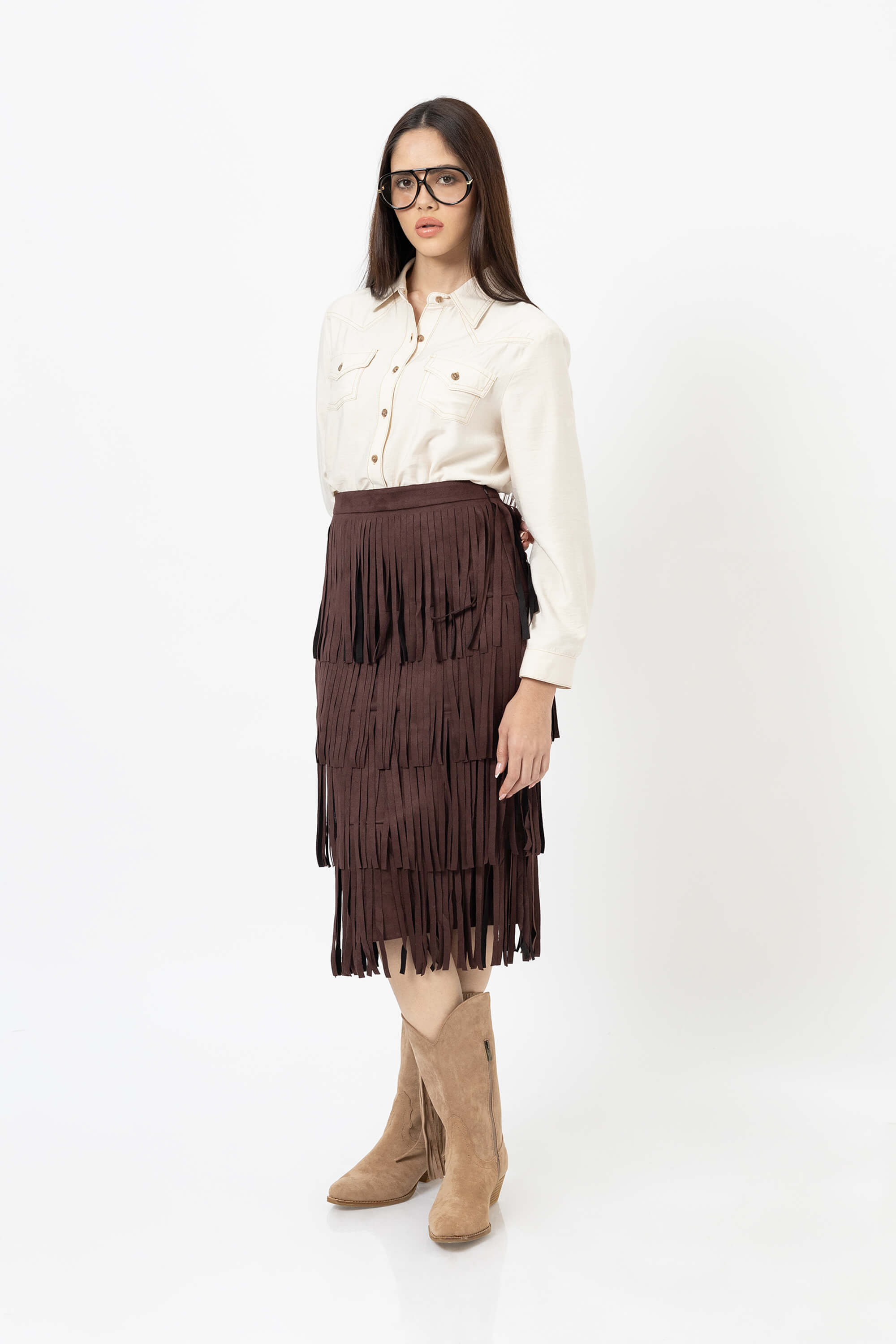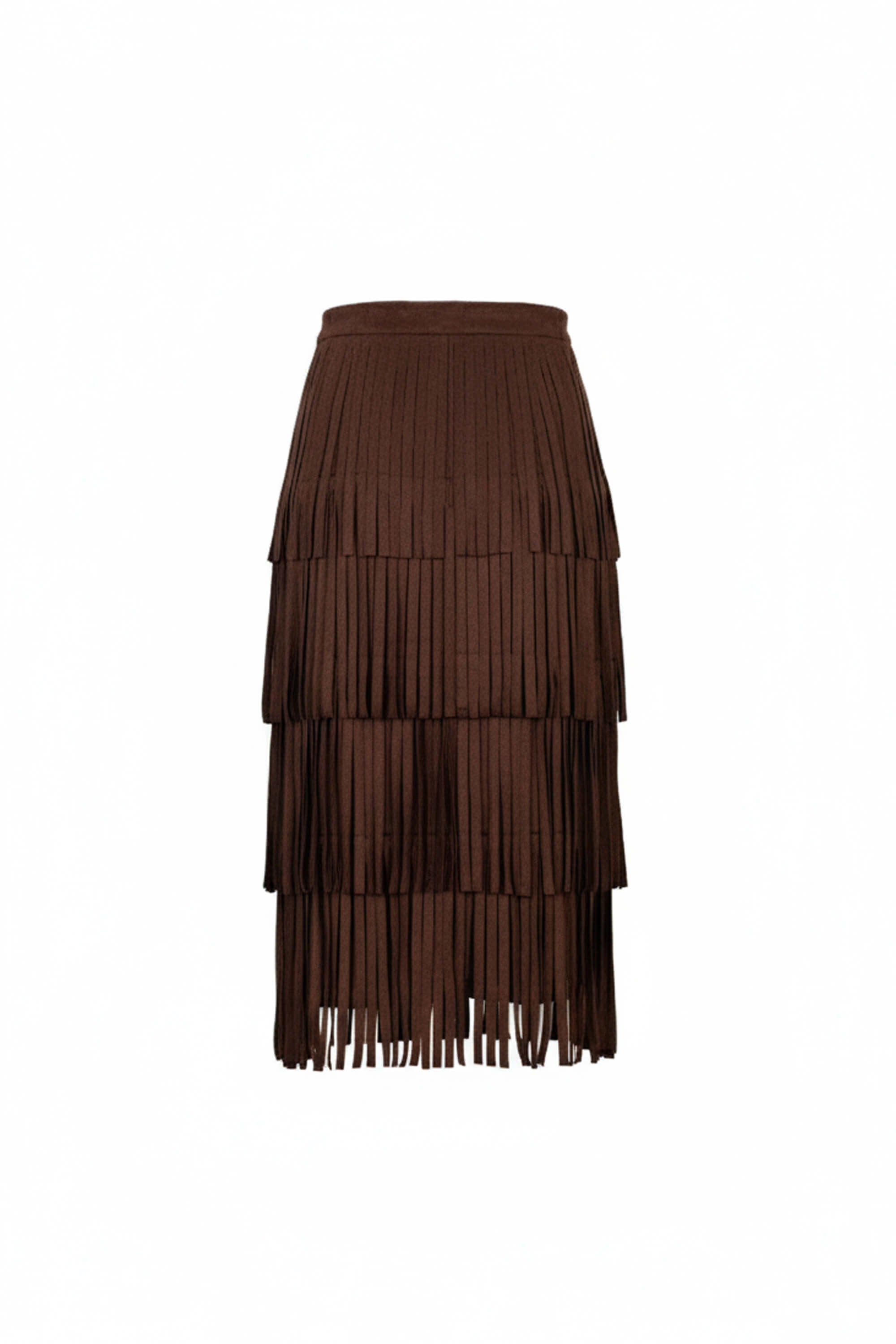 Falda midi beige con tiras largas tipo flecos en diseño escalonado.