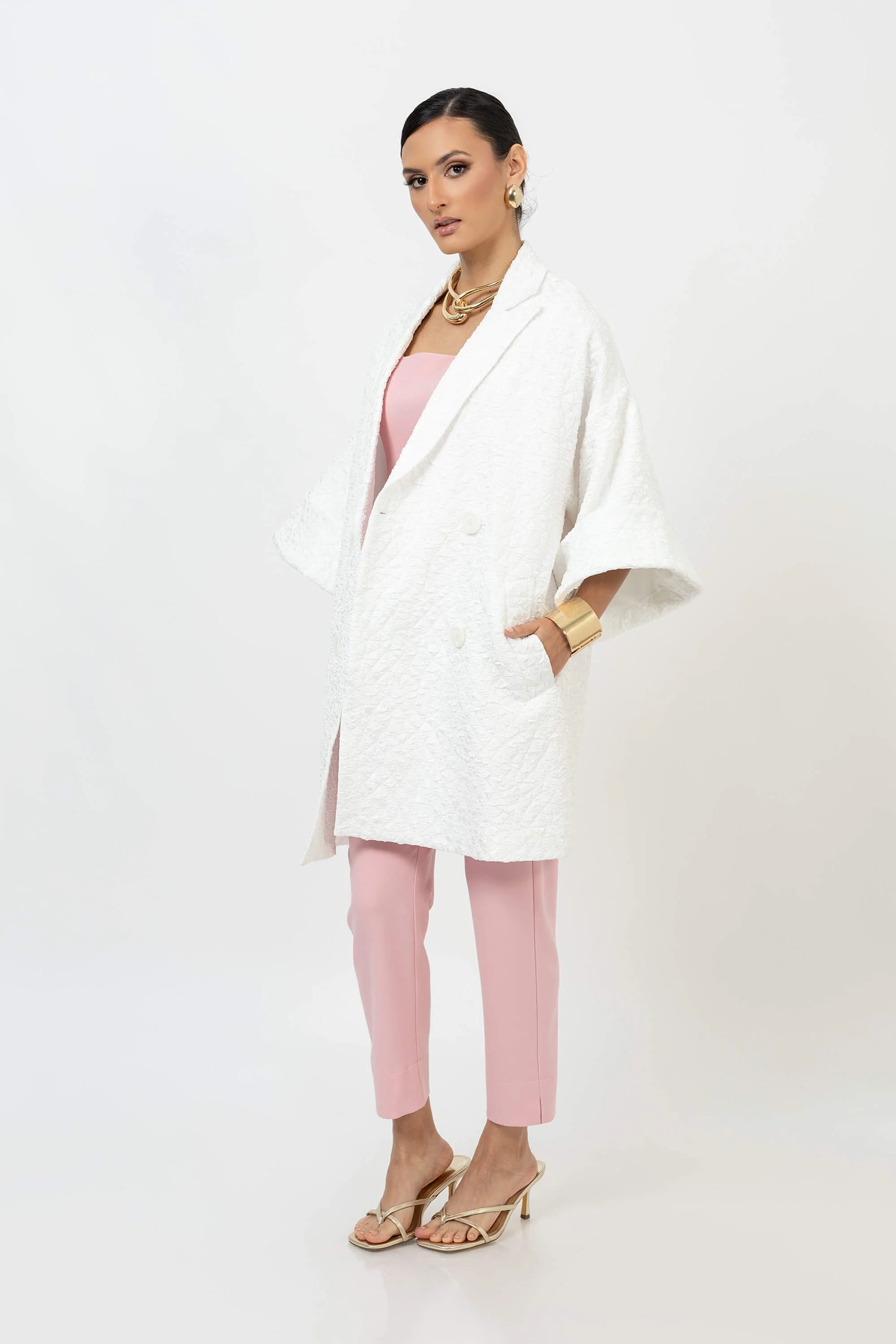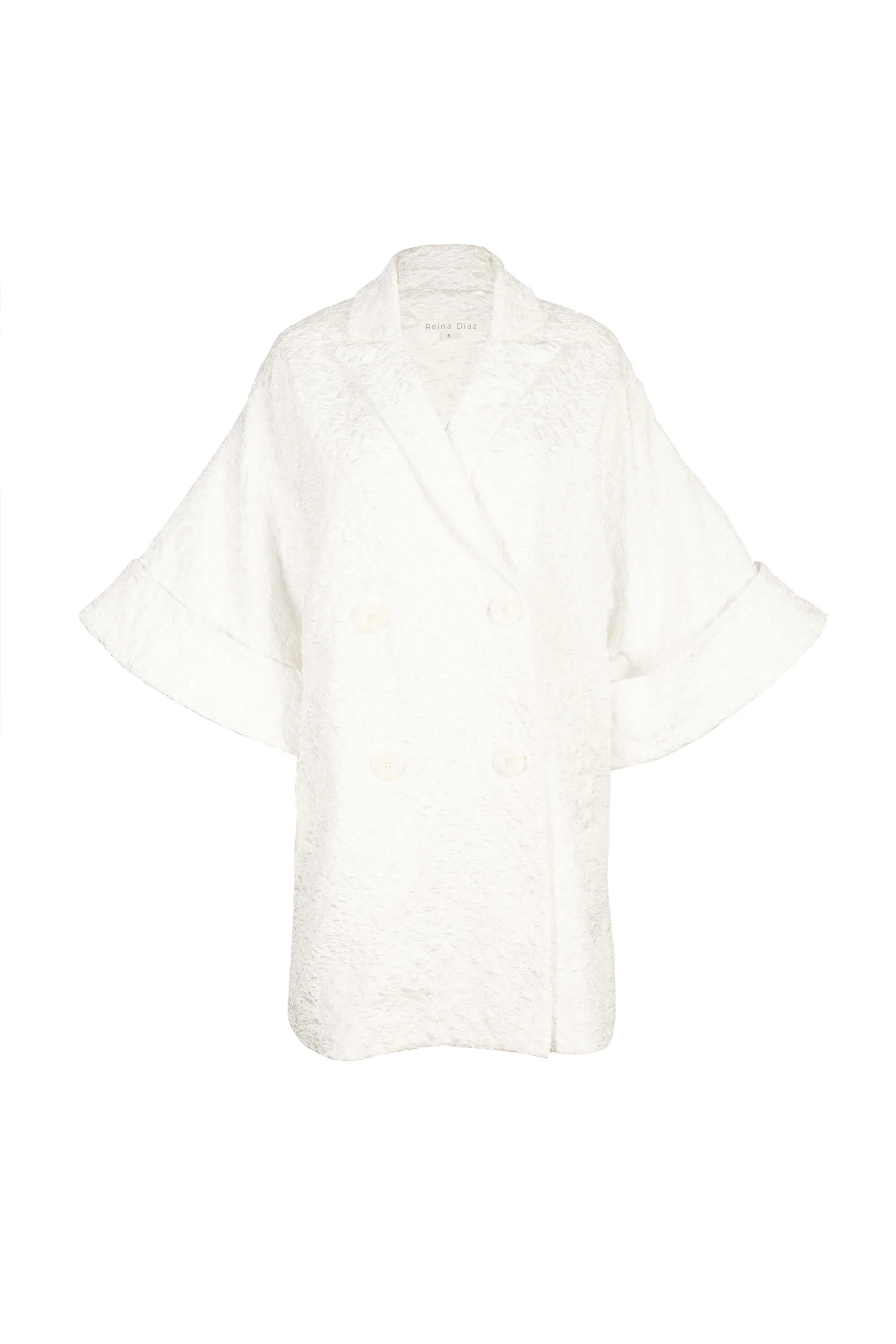 Esta gabardina redefine la elegancia con su corte amplio, textura sofisticada y detalle de vivos que realzan el diseño.