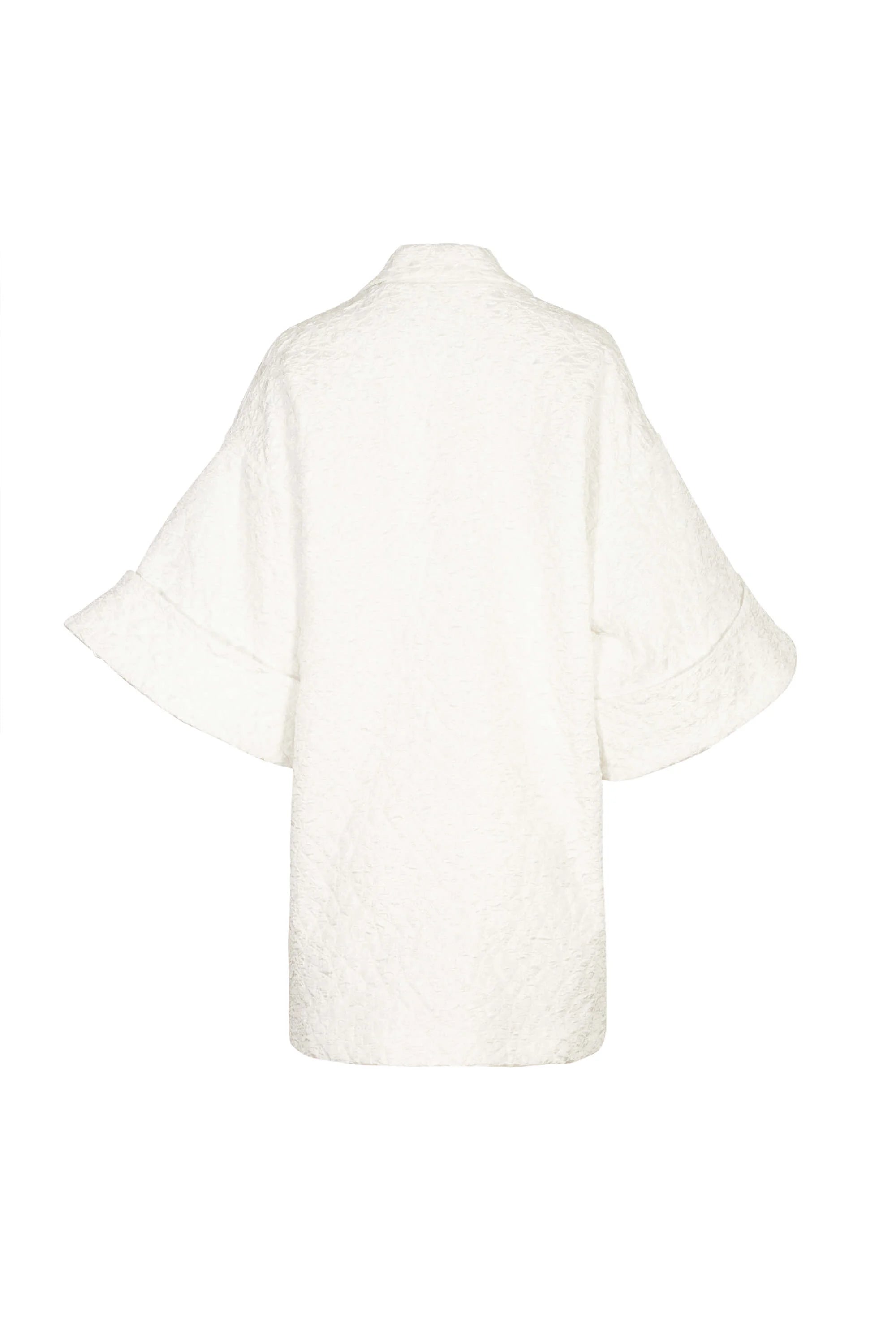Gabardina de manga amplia con vivos decorativos en patrón abstracto.