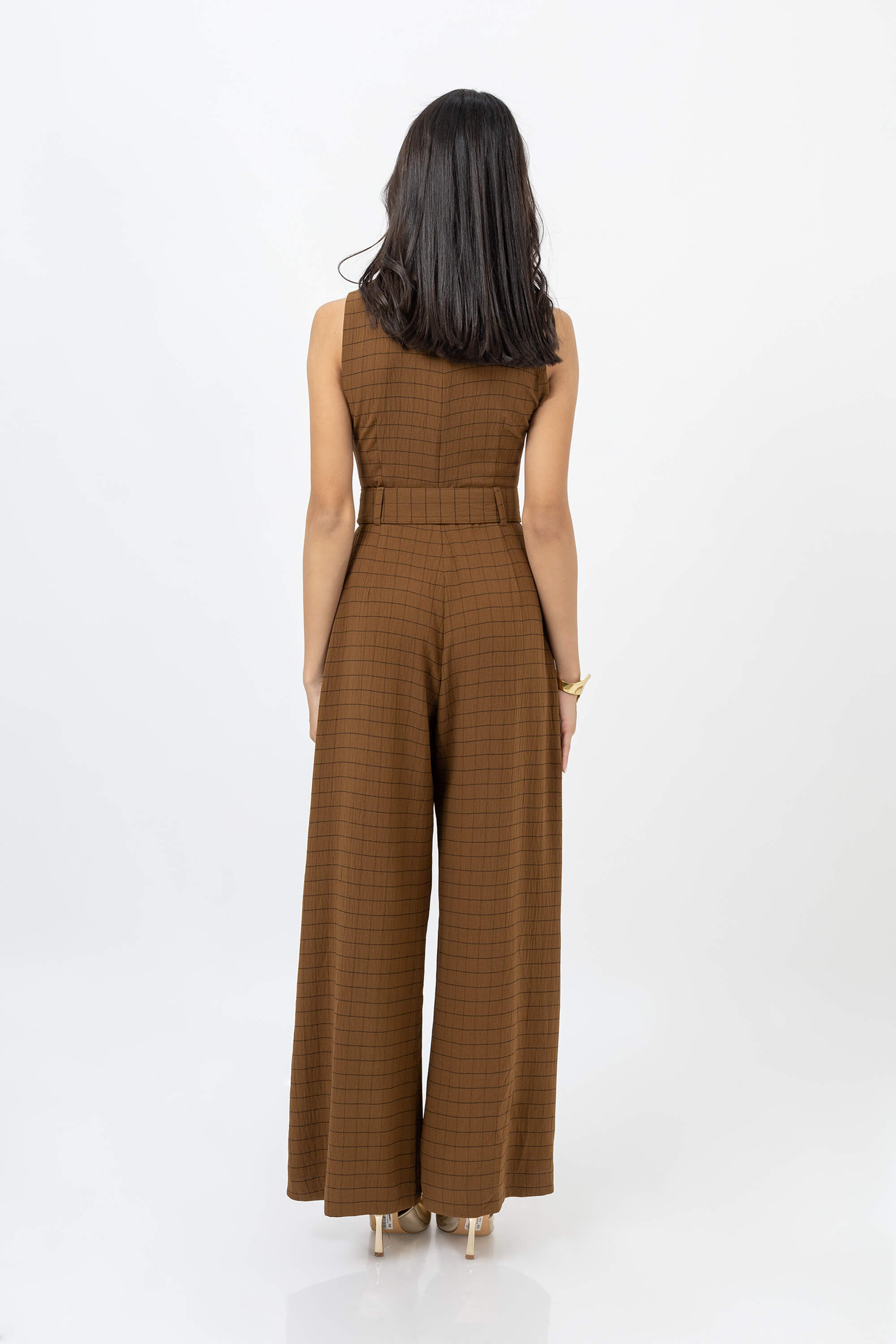 El pantsuit wide leg sin manga con escote básico y cinto de Poet Couture combina minimalismo y sofisticación. Su silueta estructurada con corte amplio en pierna y cinturón a tono resalta la figura con equilibrio y elegancia, ideal para looks contemporáneos de día o noche.