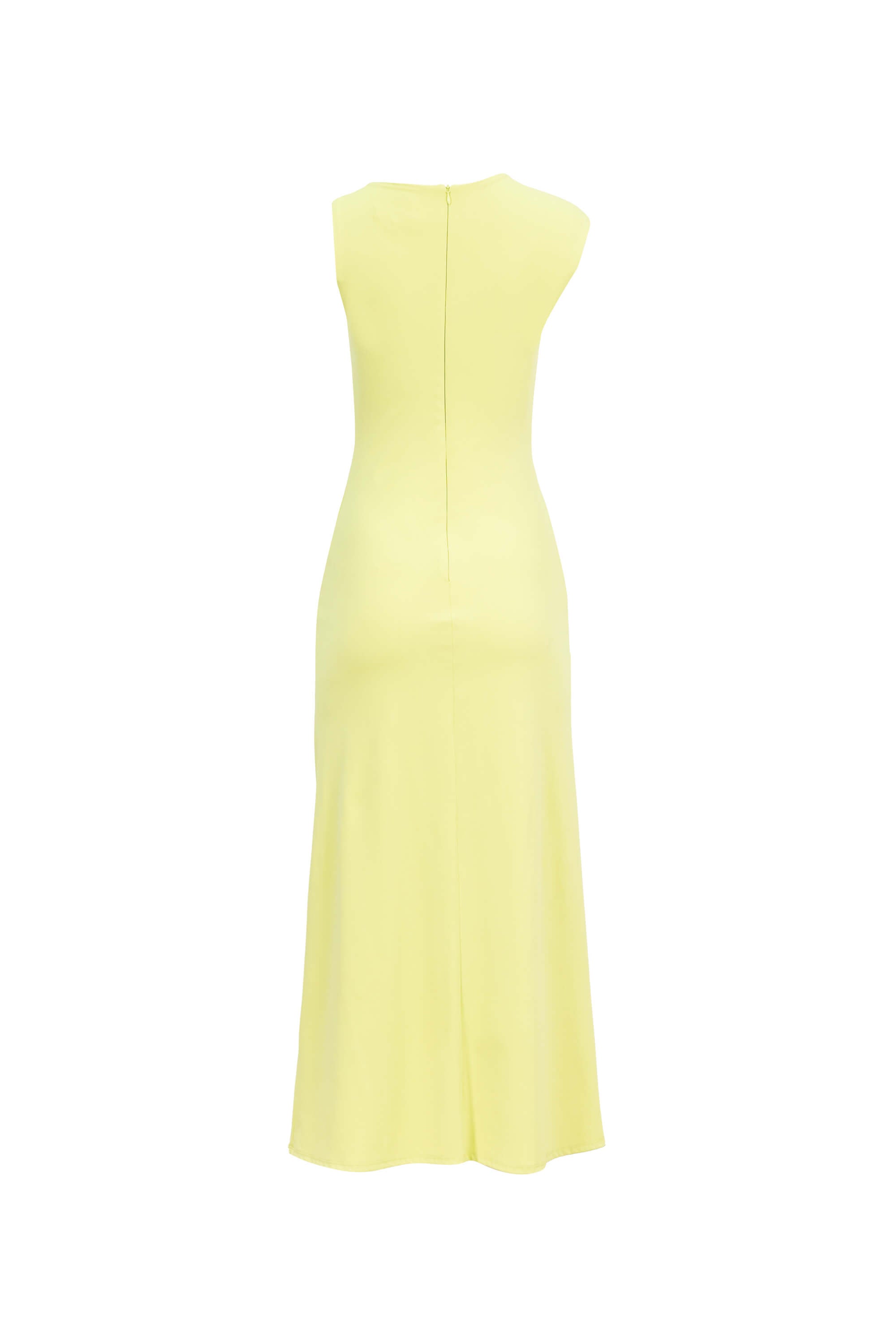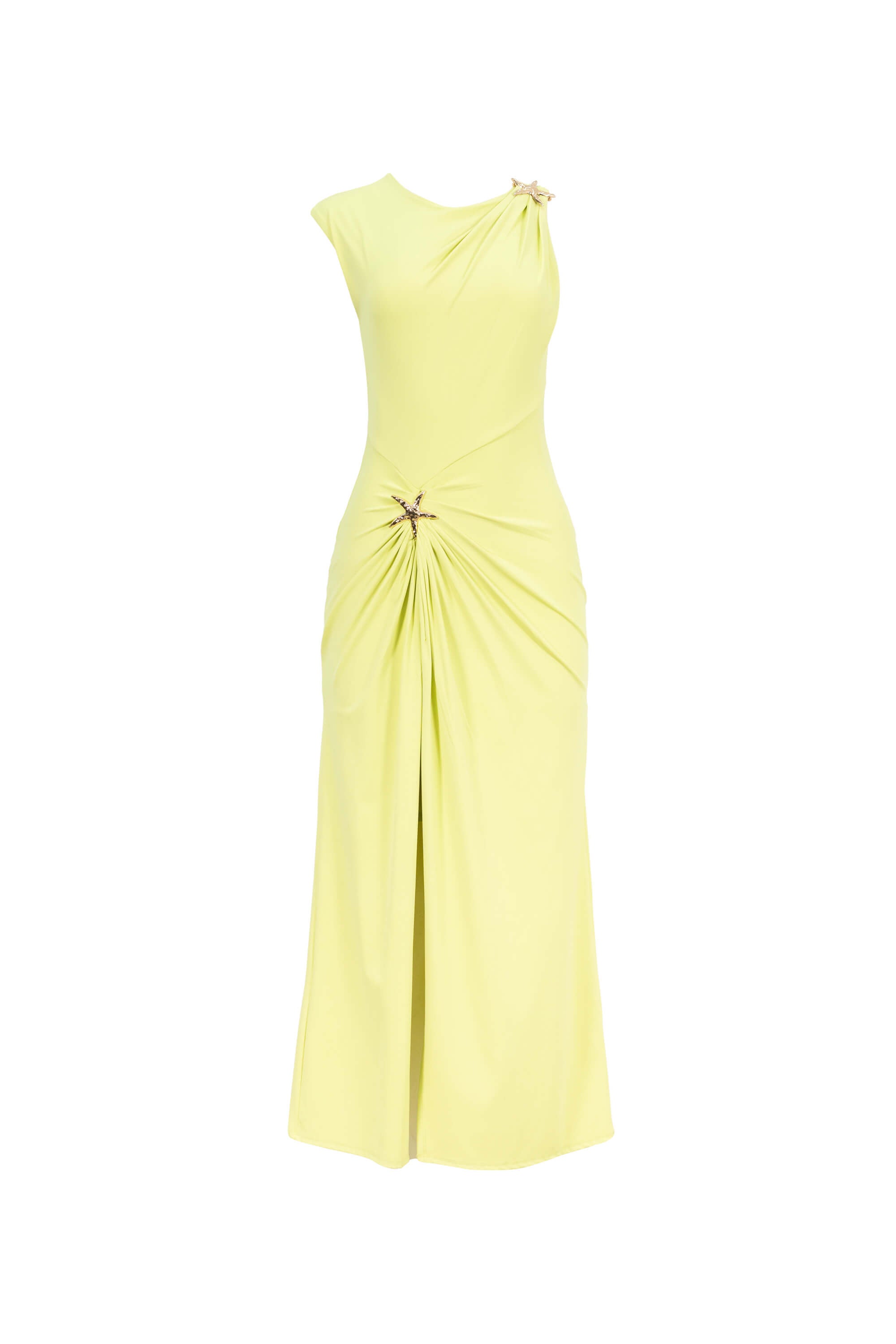 Este vestido largo de licra en color verde redefine el lujo moderno. Su diseño entallado con drapeados estratégicos realza la silueta, mientras los broches dorados en forma de estrella añaden un brillo elegante y contemporáneo.
