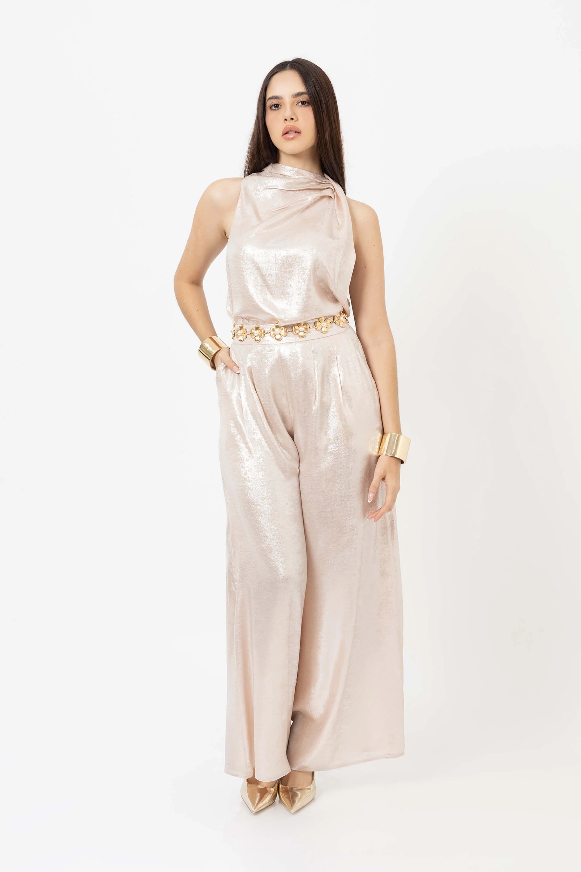 La blusa sin manga con escote columpio y delicados pliegues  es una pieza que destaca por su fluidez y elegancia. Su silueta ligera y femenina aporta un movimiento natural, mientras que el detalle de pliegues en el escote realza la sofisticación del diseño.