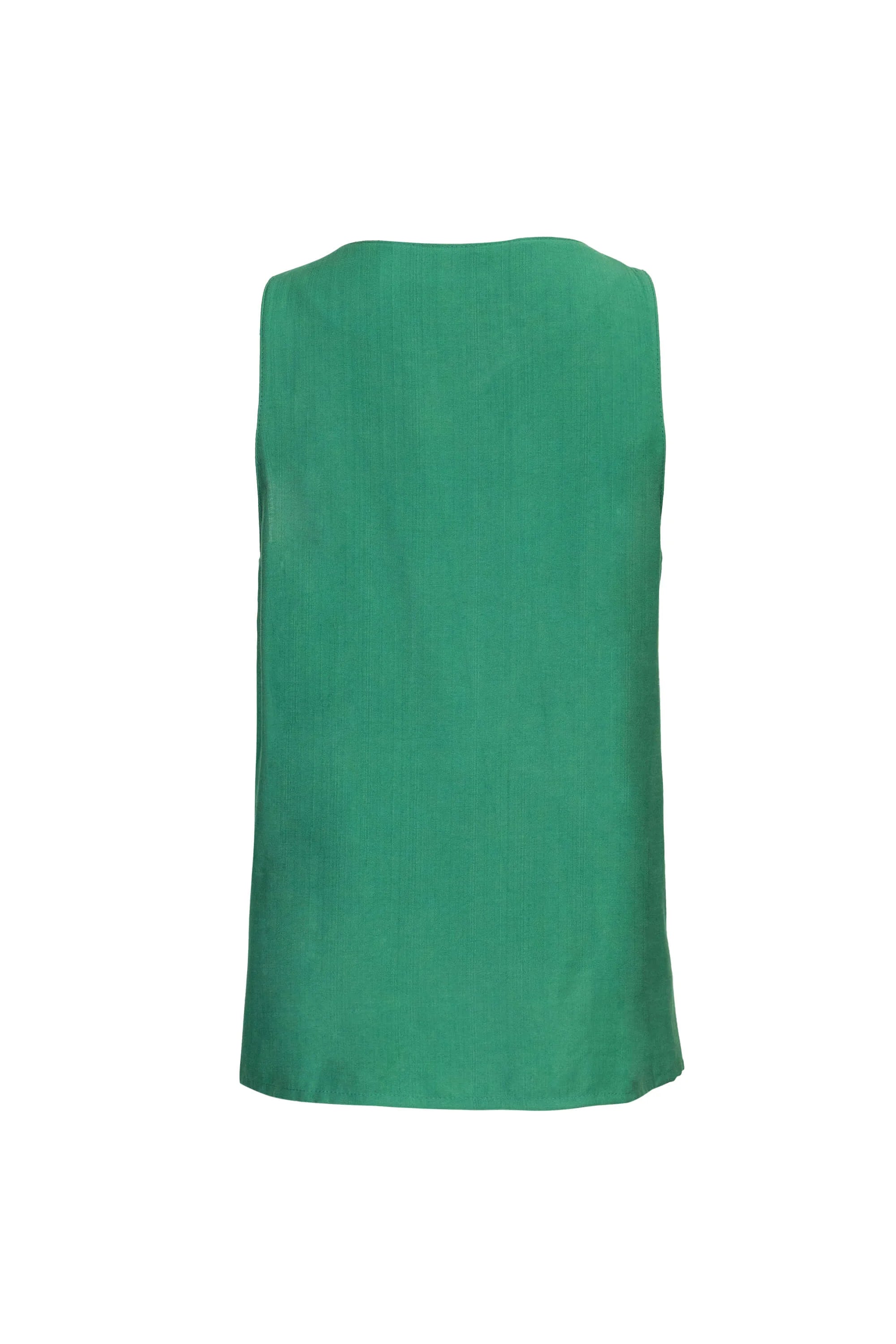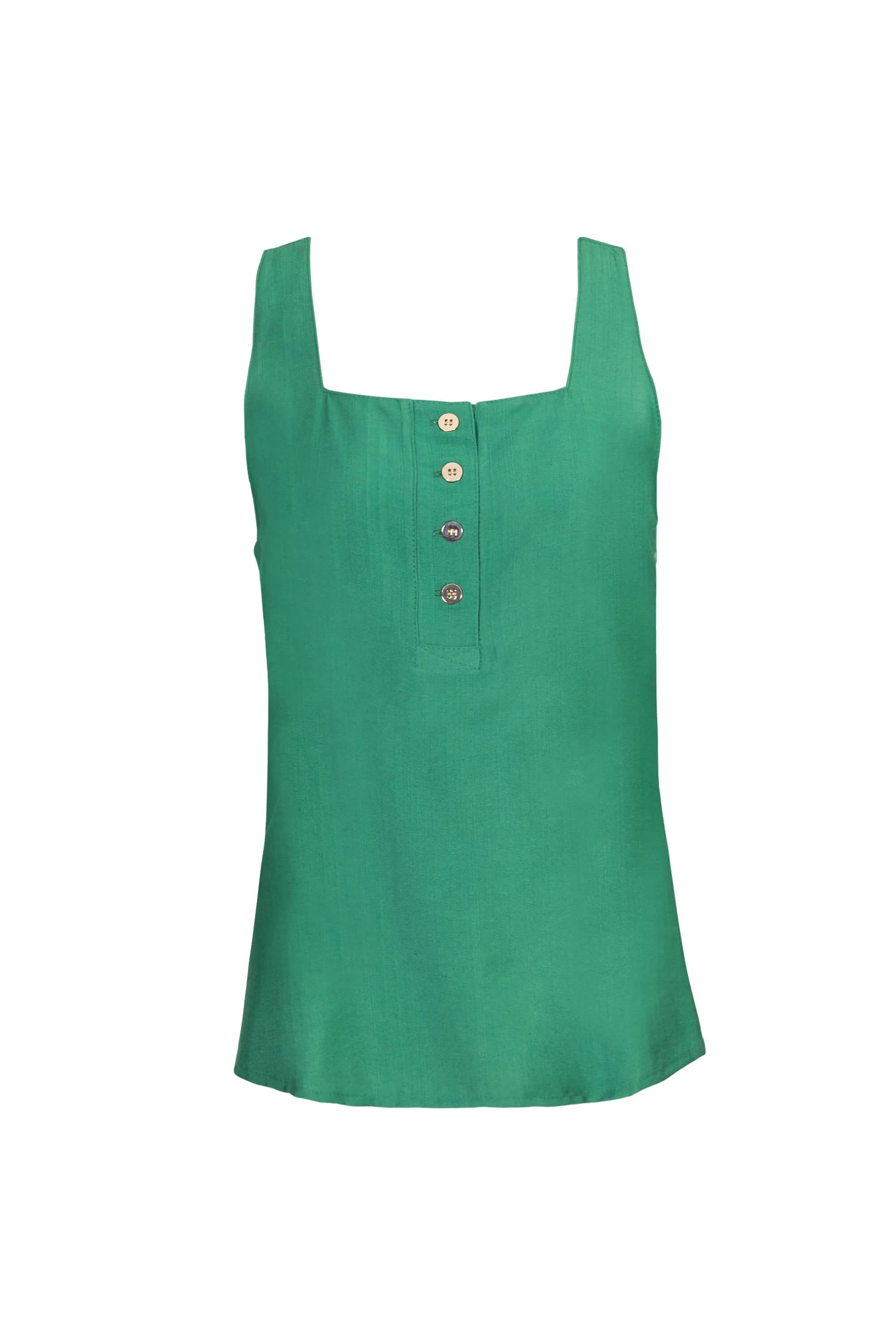 Blusa verde ligera de tirante ancho con aletilla y botones al frente.