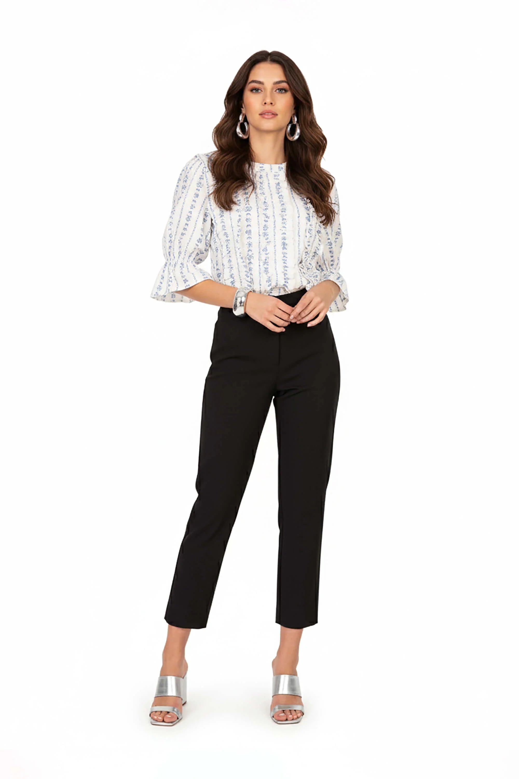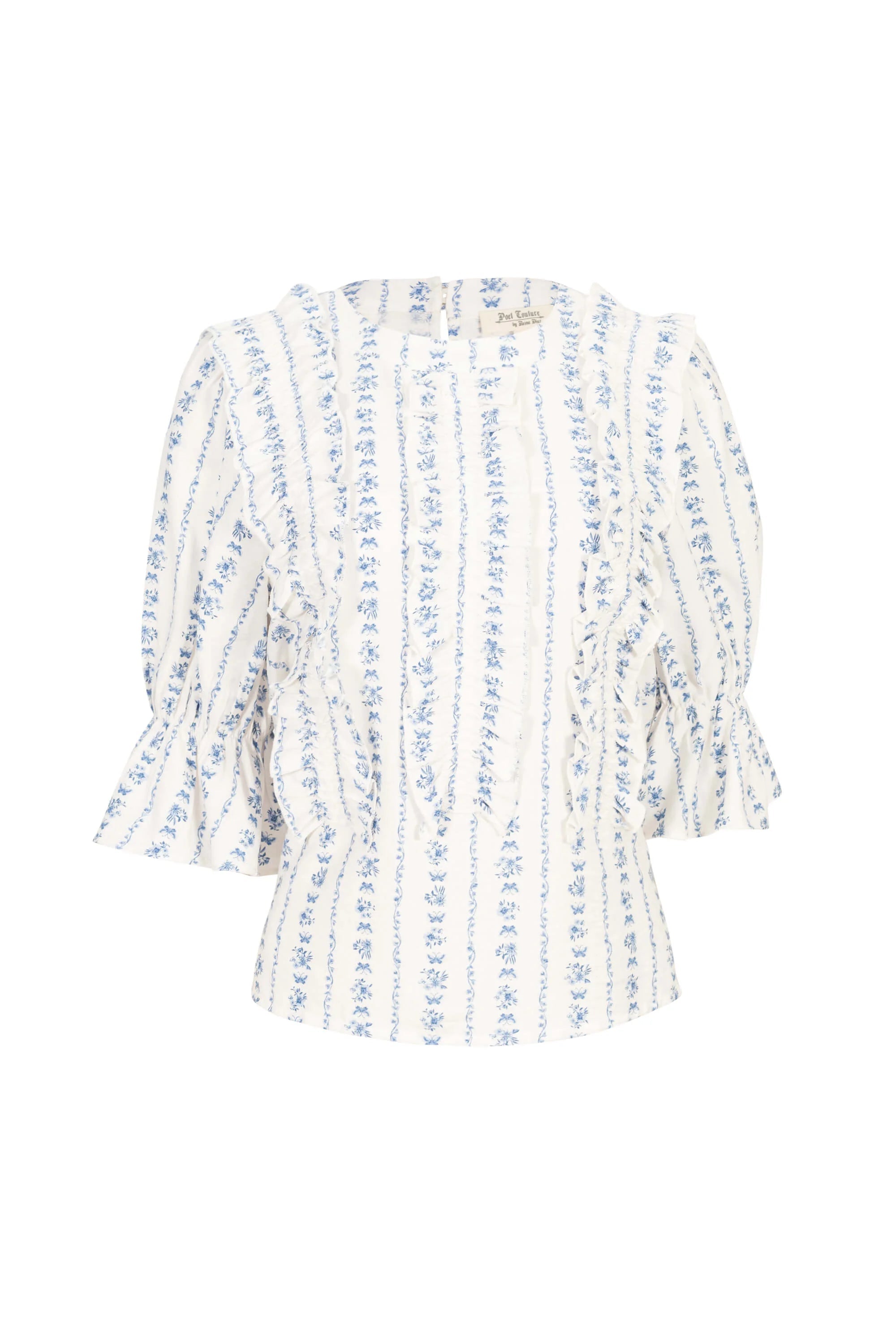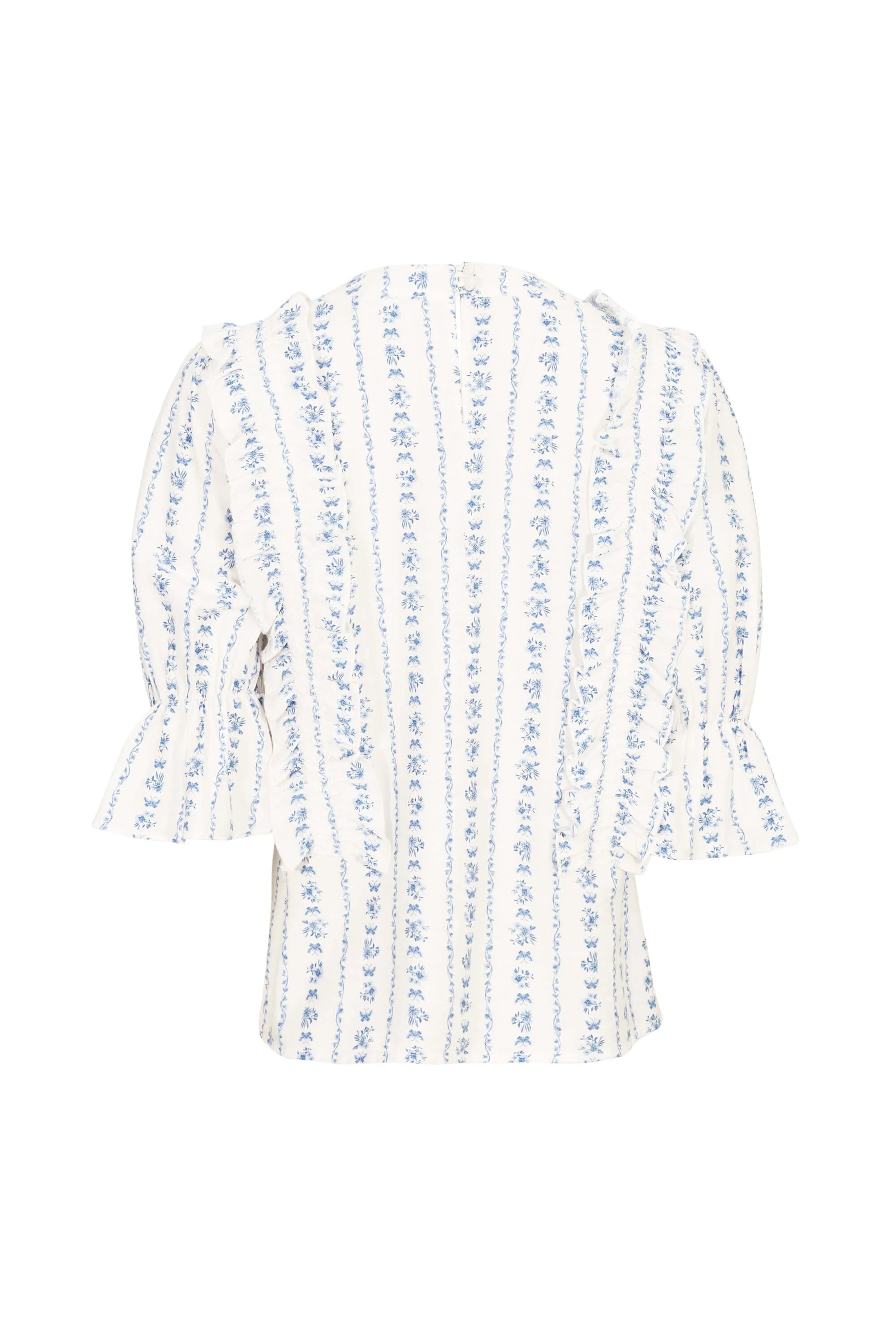 Blusa de algodón con mangas abullonadas y estampado azul. Diseño fresco y artesanal, ideal para looks elegantes de día.