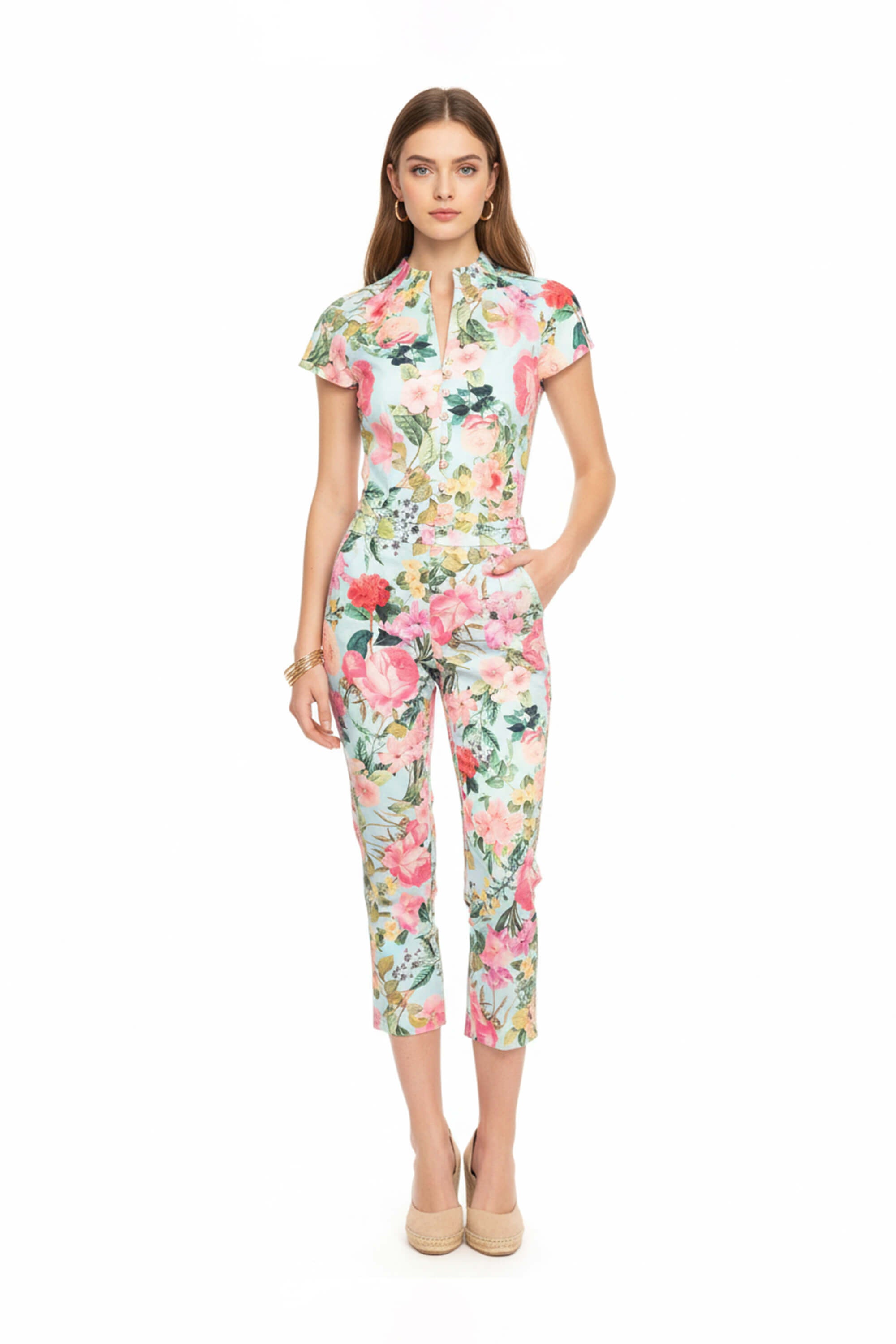 Blusa entallada con estampado floral aqua, cuello cerrado y botones al frente.