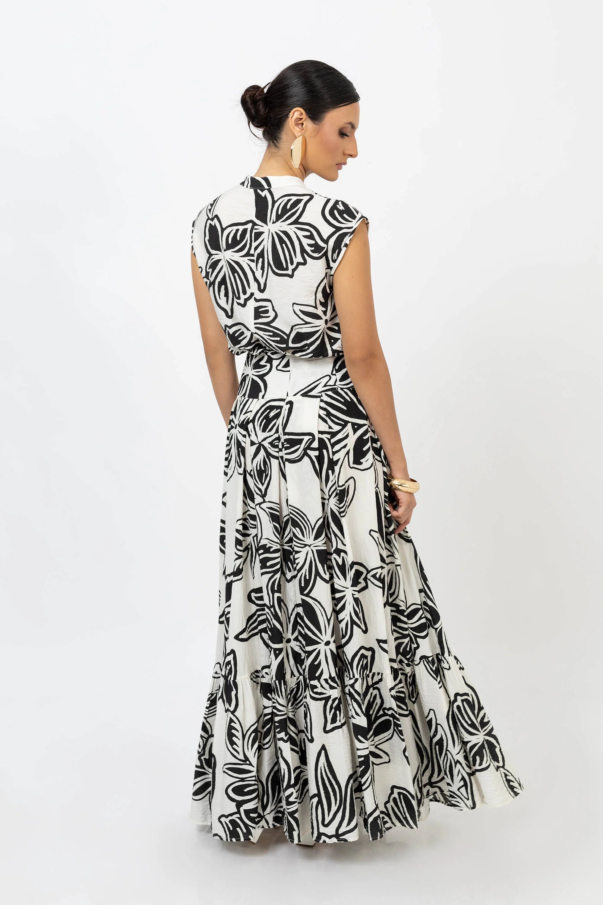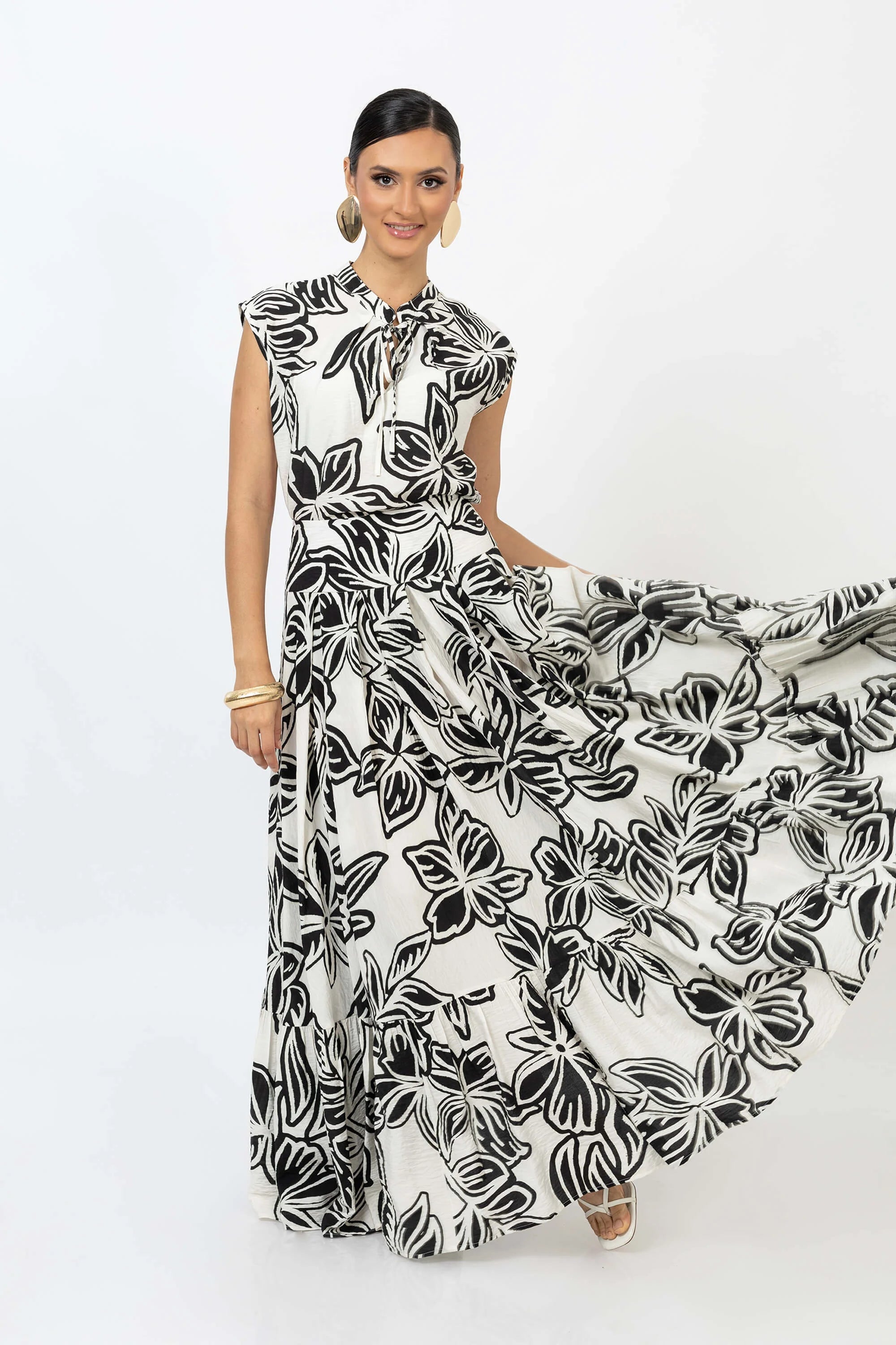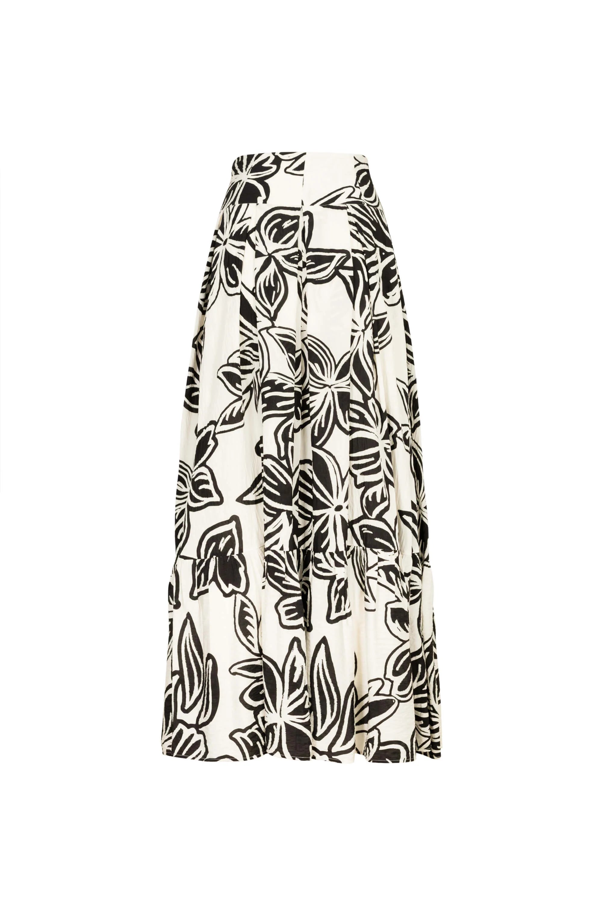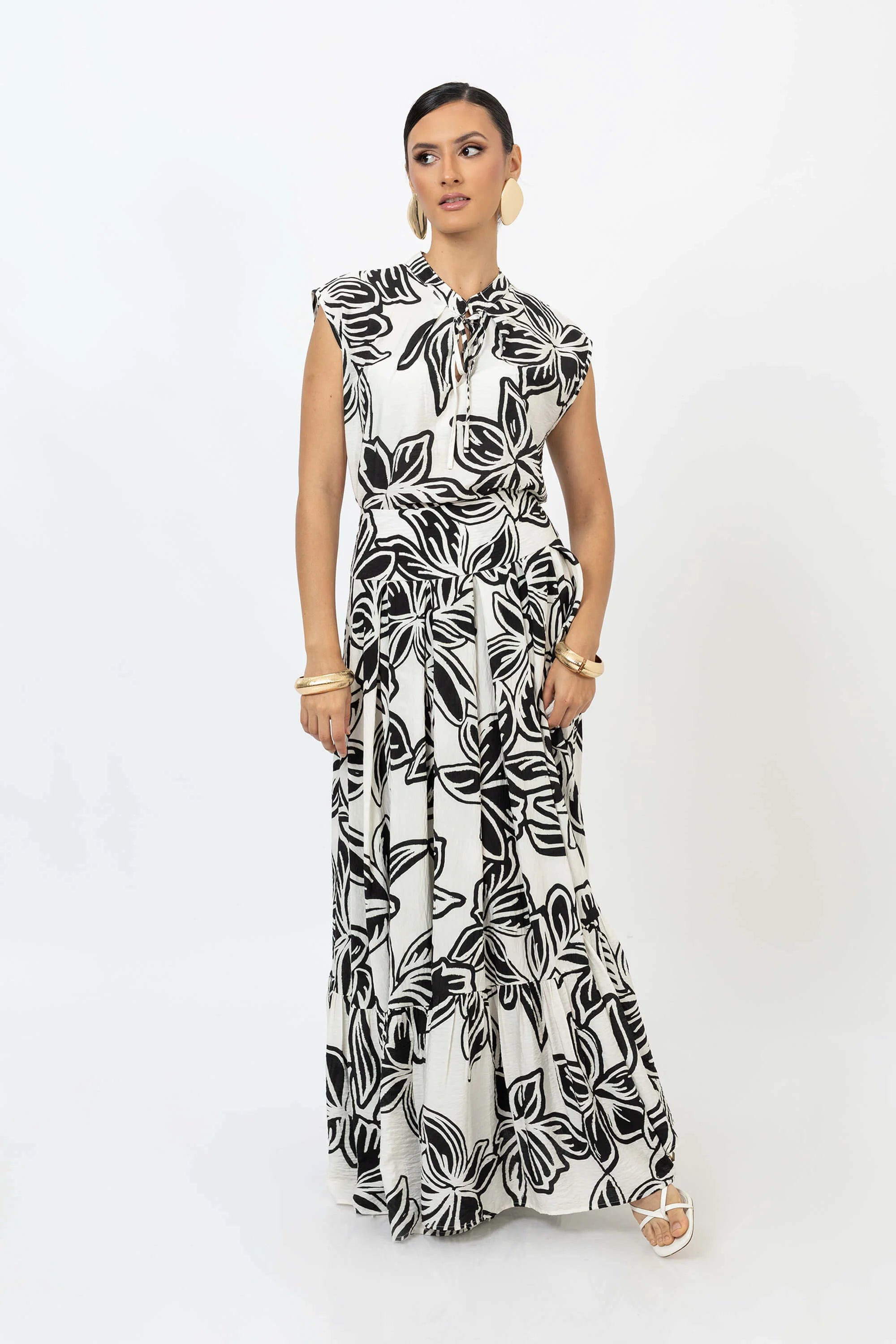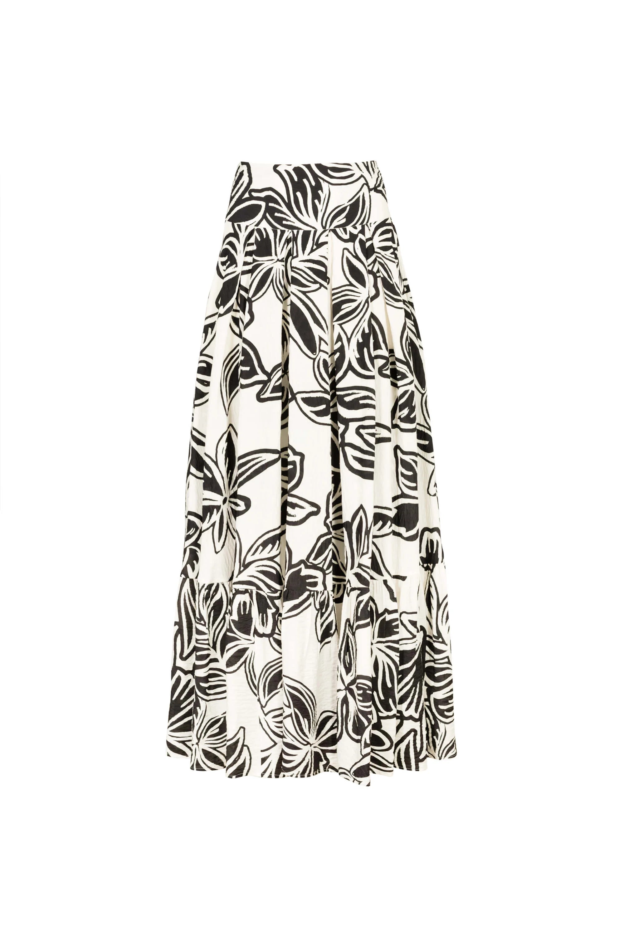 Confeccionada en un textil ligero y de excelente caída, esta falda integra delicados pliegues verticales que estilizan la silueta y permiten que el estampado de flores estilizadas cobre protagonismo. El detalle de olan en el ruedo añade volumen sutil y dinamismo al caminar, creando un efecto envolvente y etéreo.