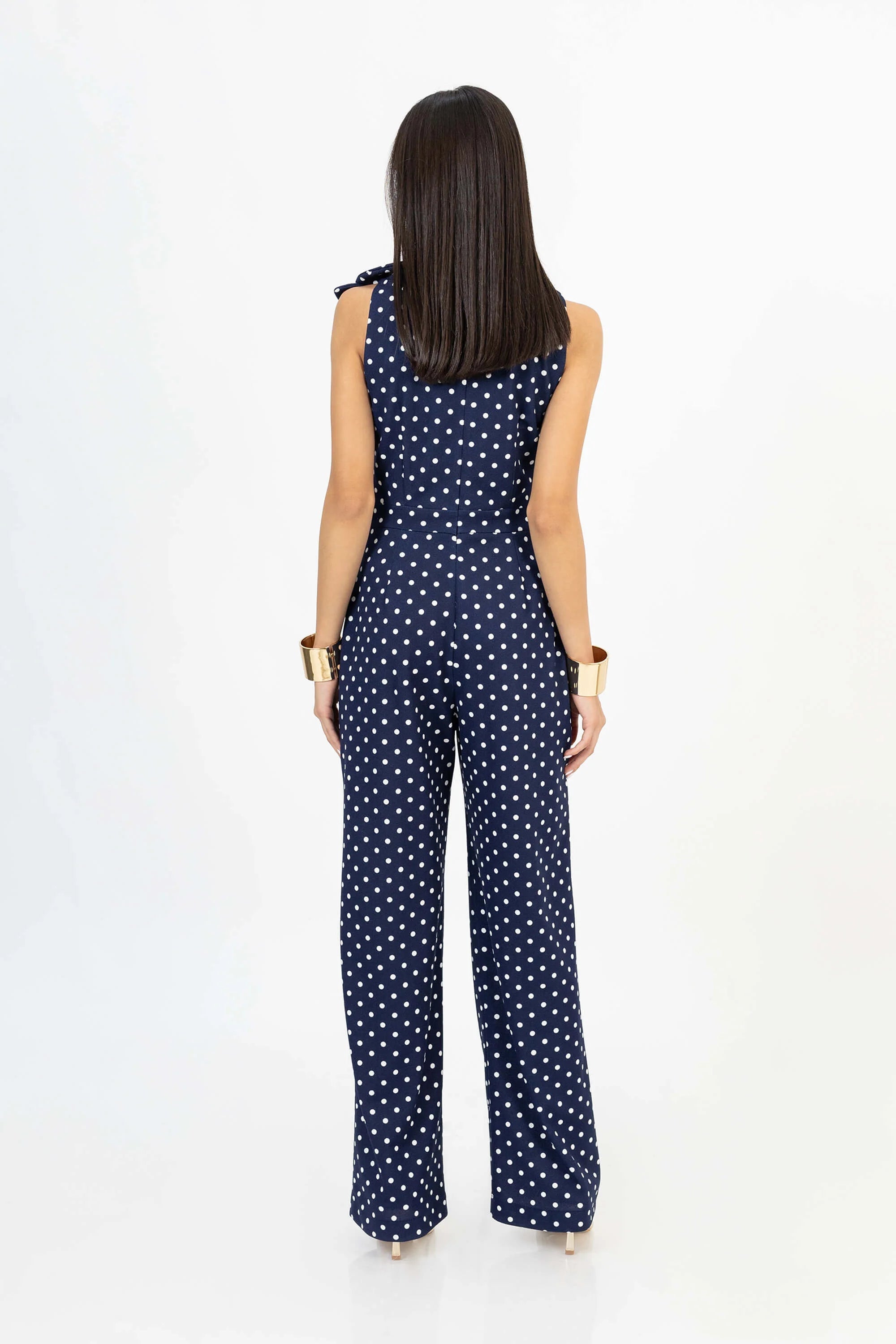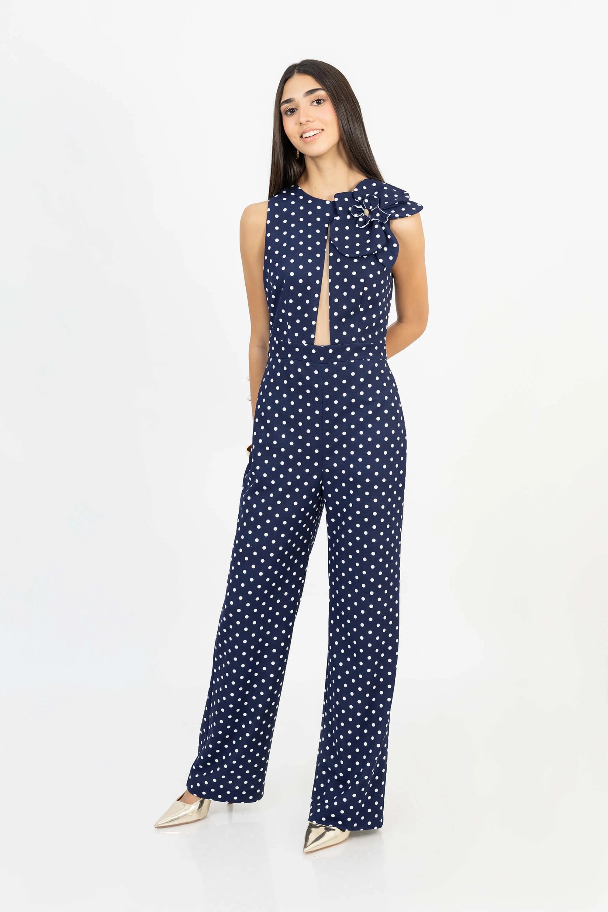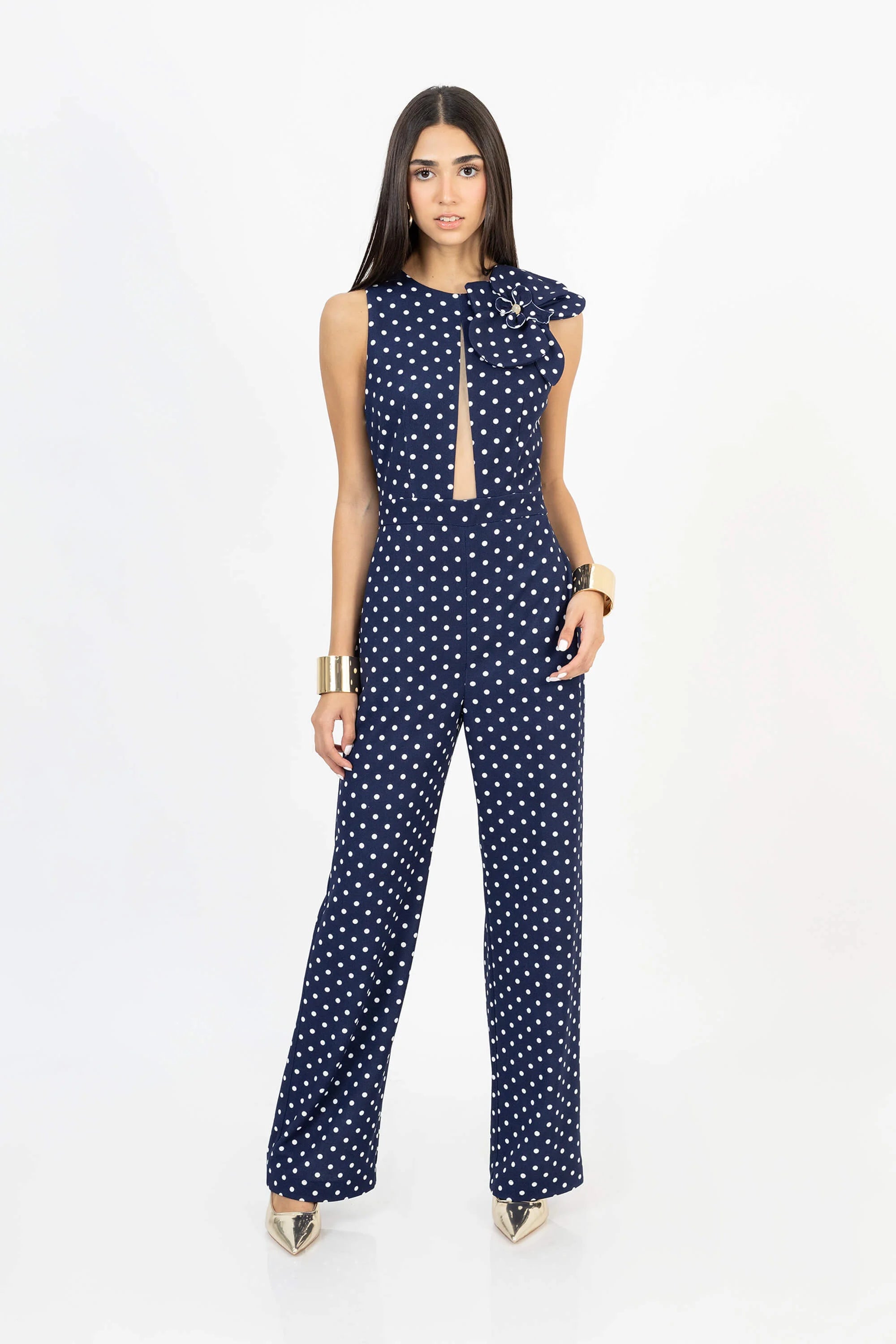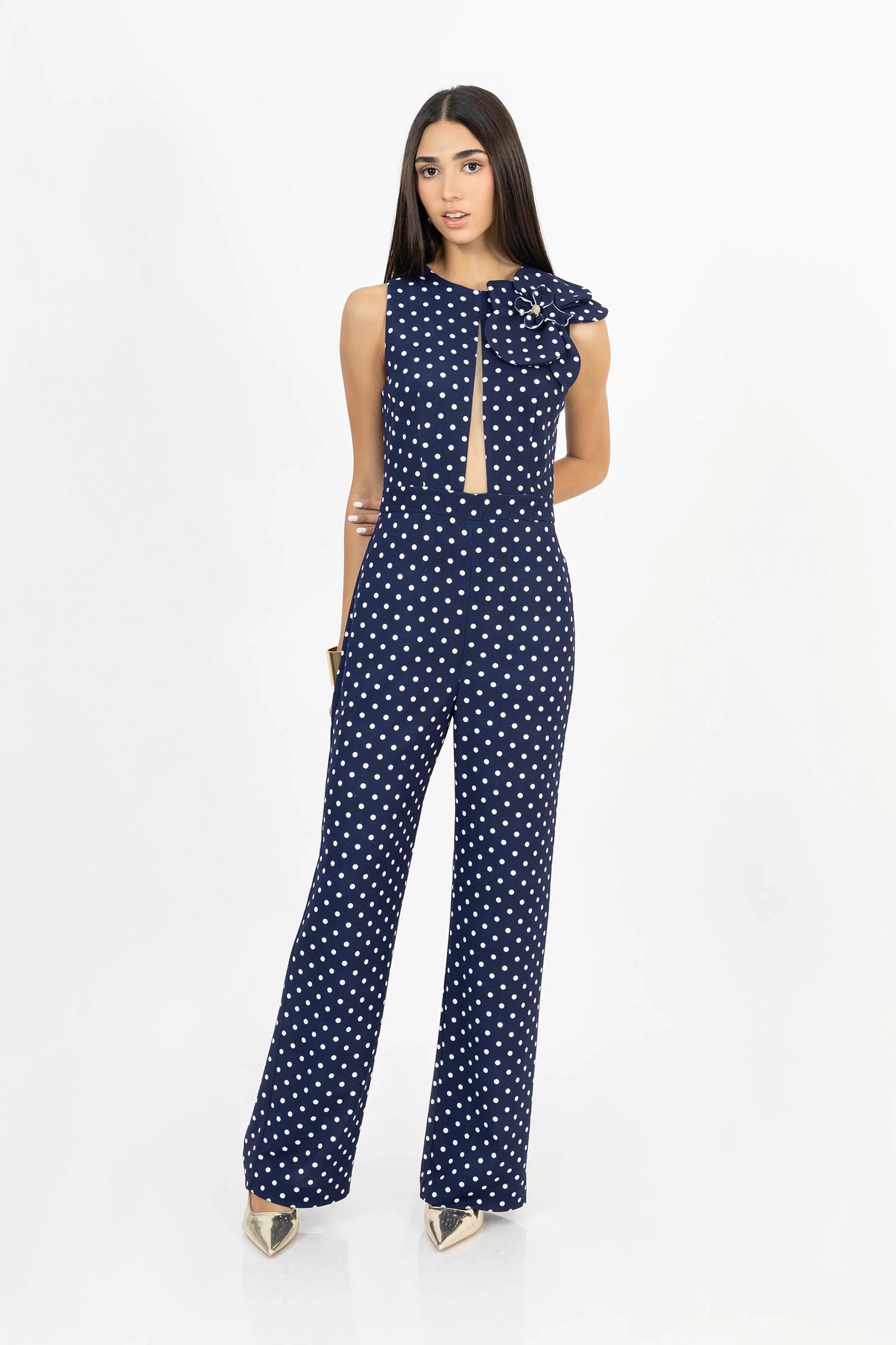 Este pantsuit sin mangas con estampado floral en blanco y azul marino es una declaración de estilo audaz y femenino. La silueta estilizada se equilibra con una caída amplia en el pantalón, mientras que el detalle escultural en el hombro y el cinturón estructurado marcan una figura poderosa, segura y refinada.