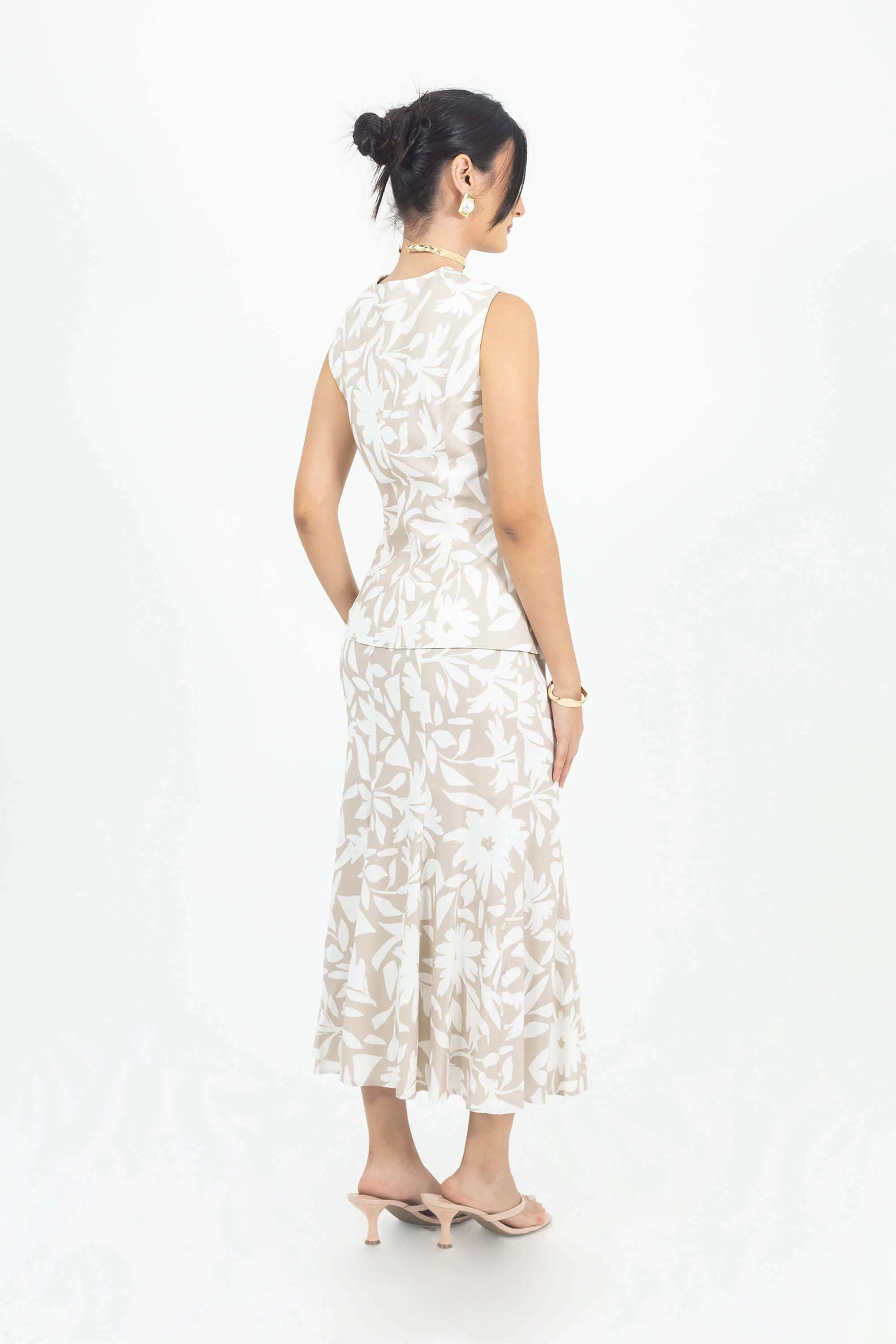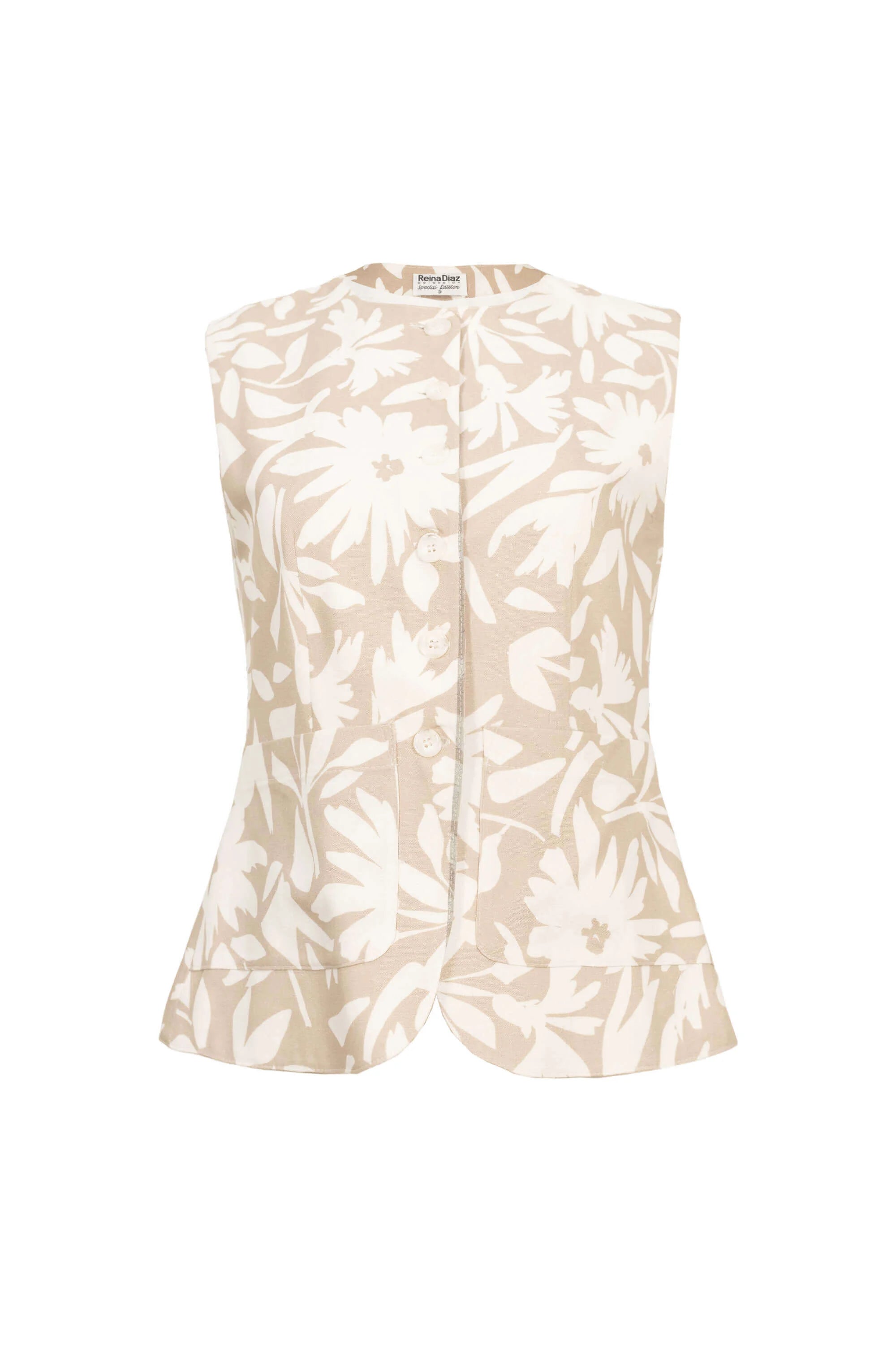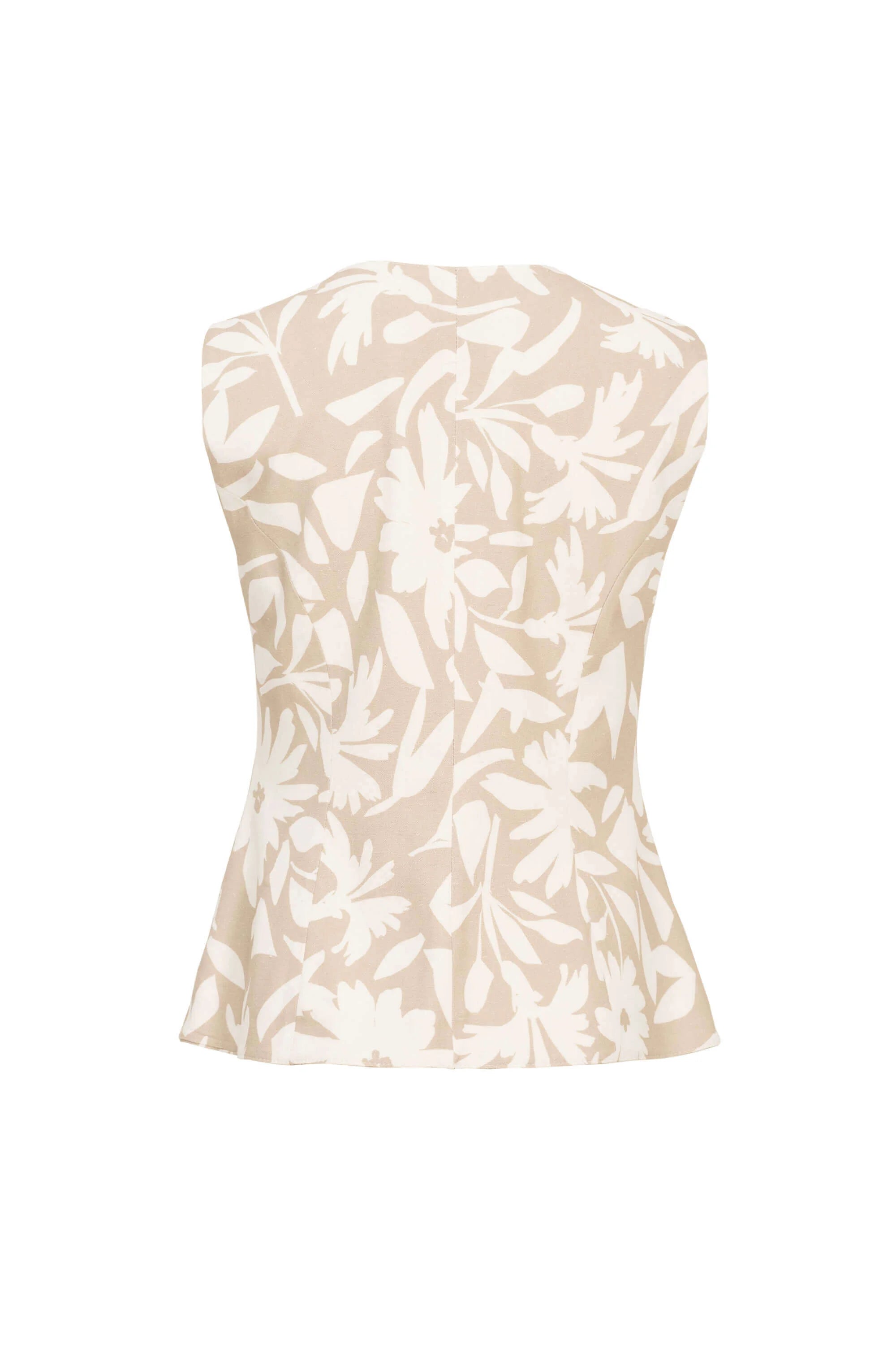Saco sin mangas con corte entallado y estampado floral beige.