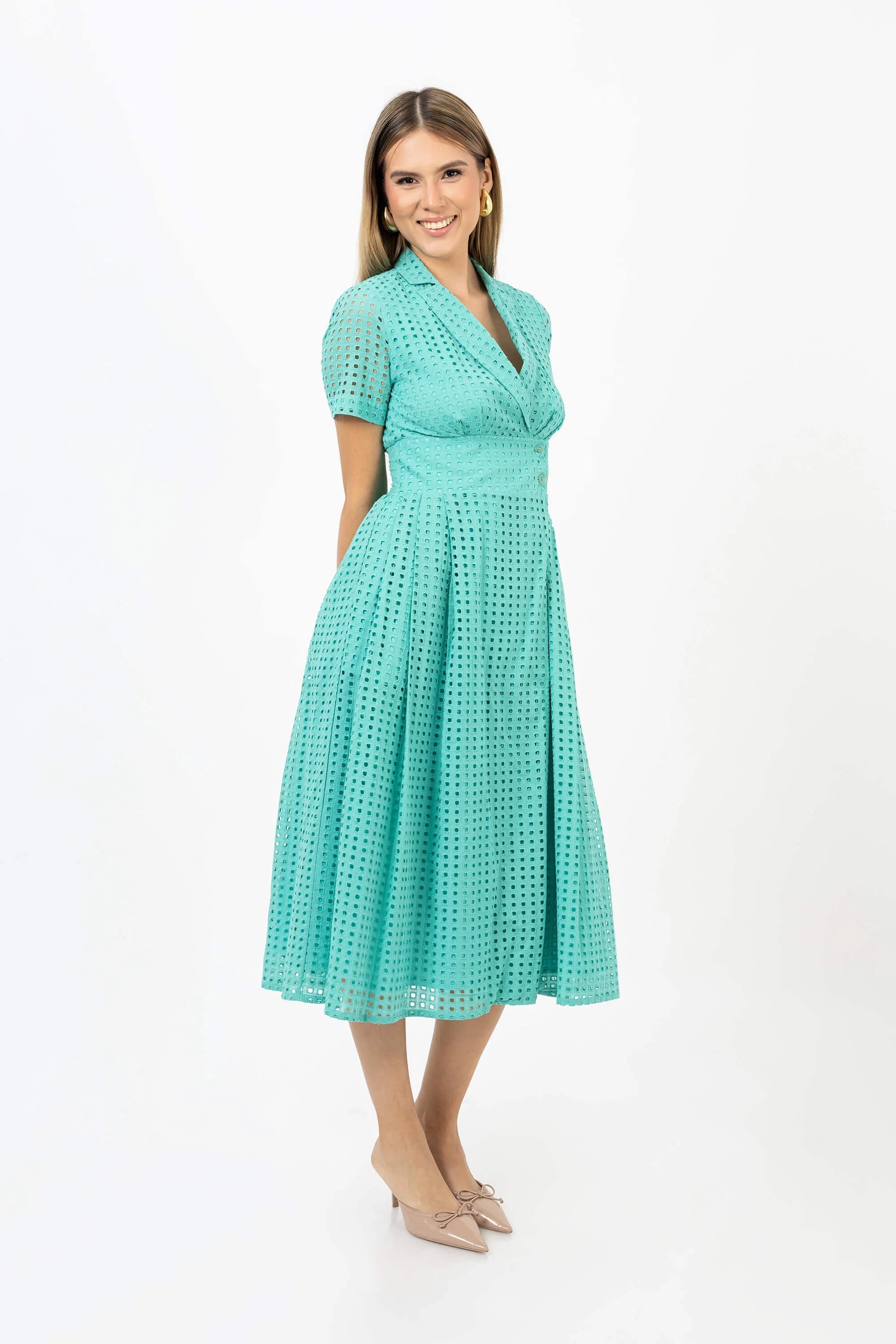 El vestido midi estampado con manga ranglan, solapa cruzada y botones es una prenda que combina comodidad y elegancia con un diseño atemporal. Su silueta midi, favorecedora y versátil, se realza con el cruce al frente que estiliza la cintura y el escote en V con solapa clásica, otorgando un aire refinado y femenino.