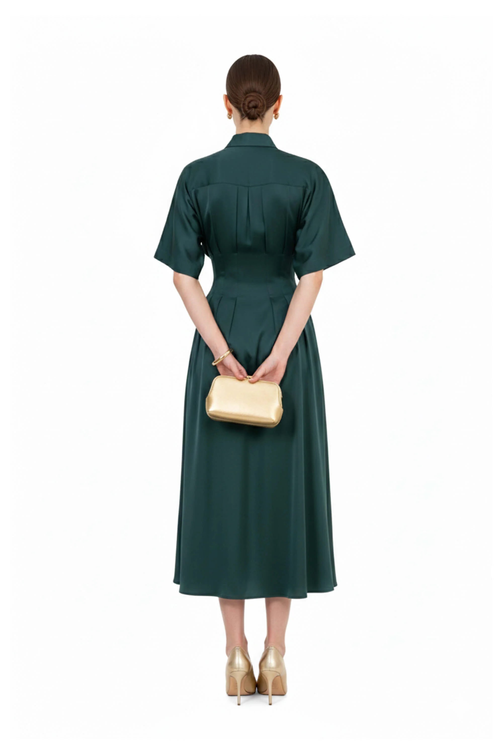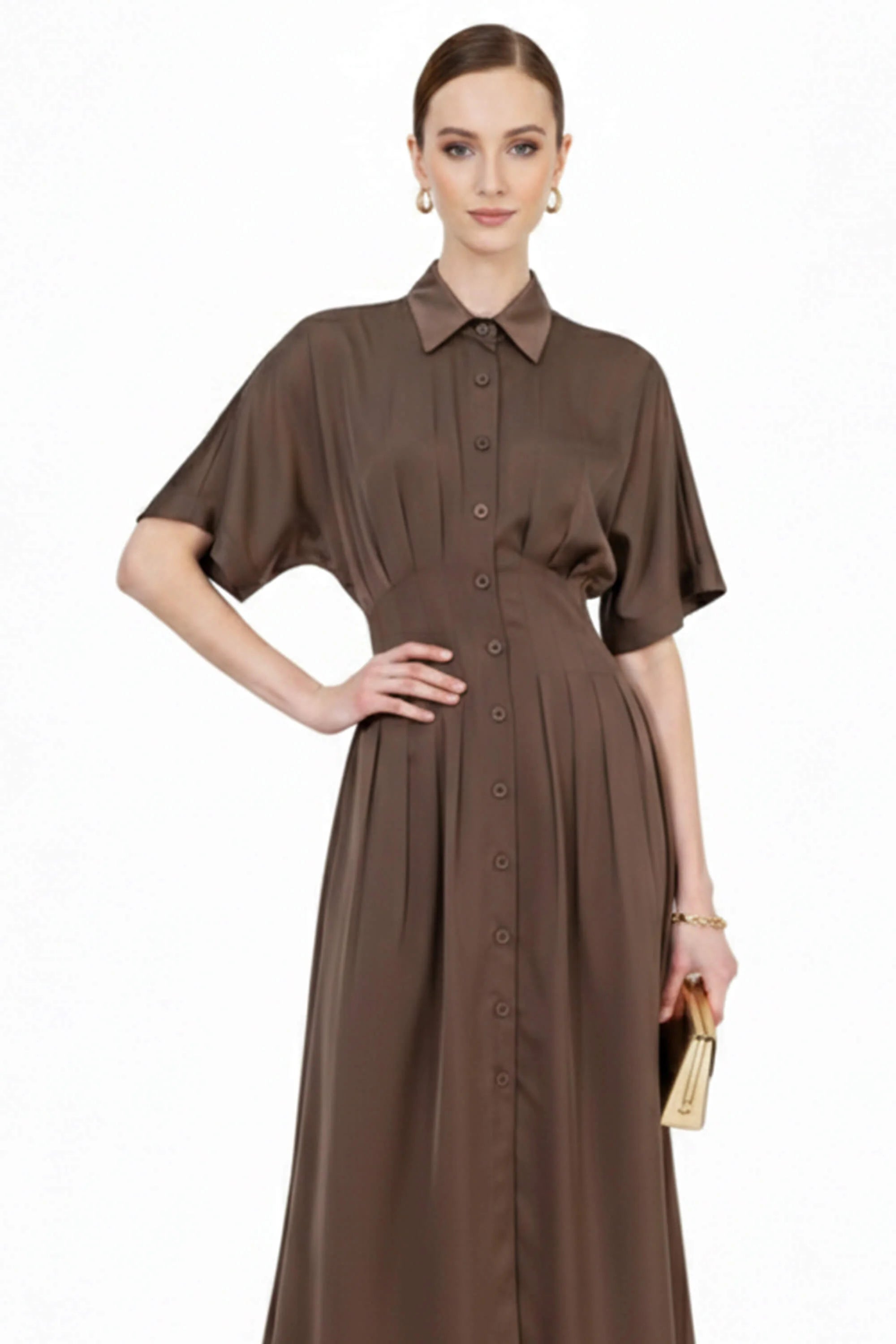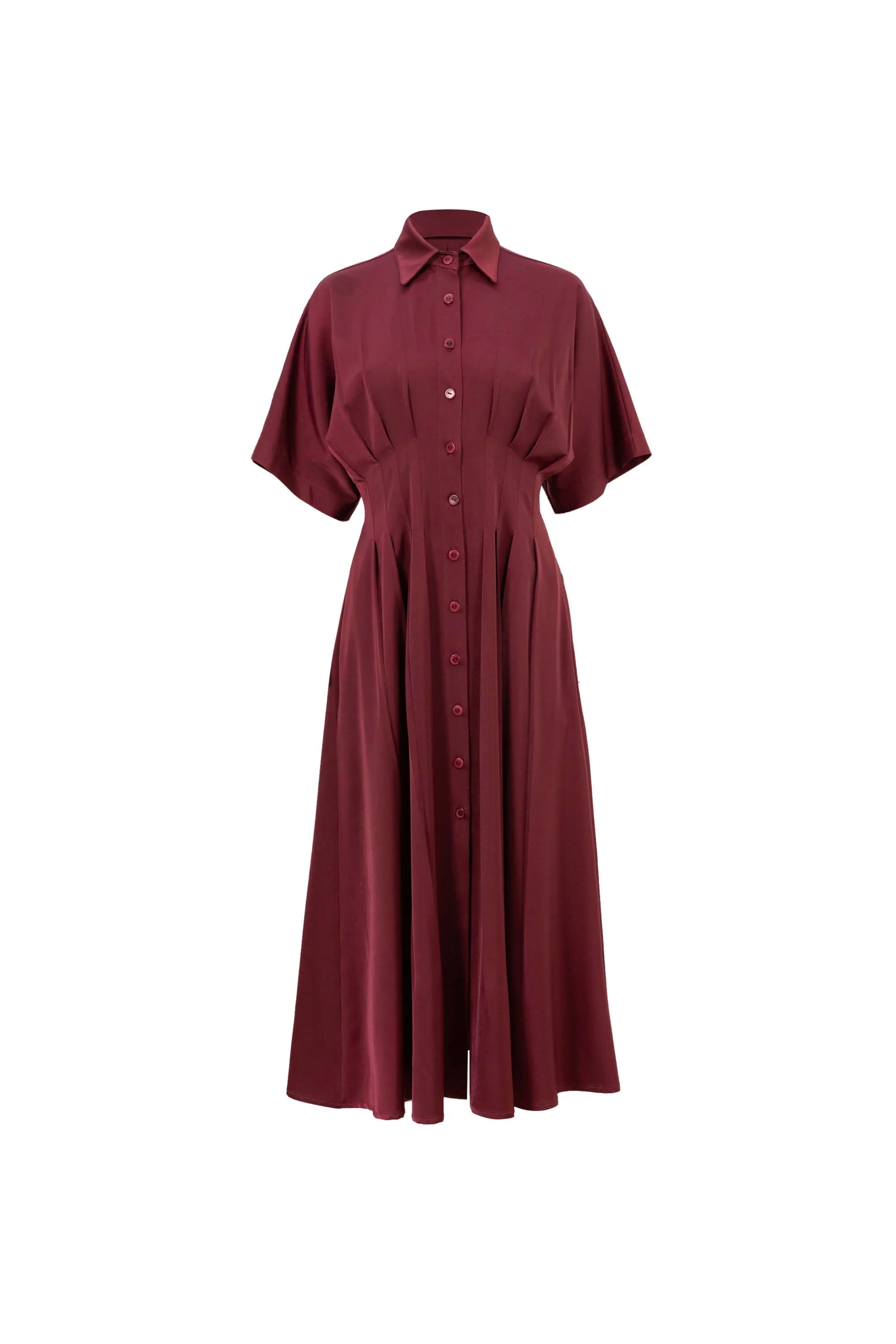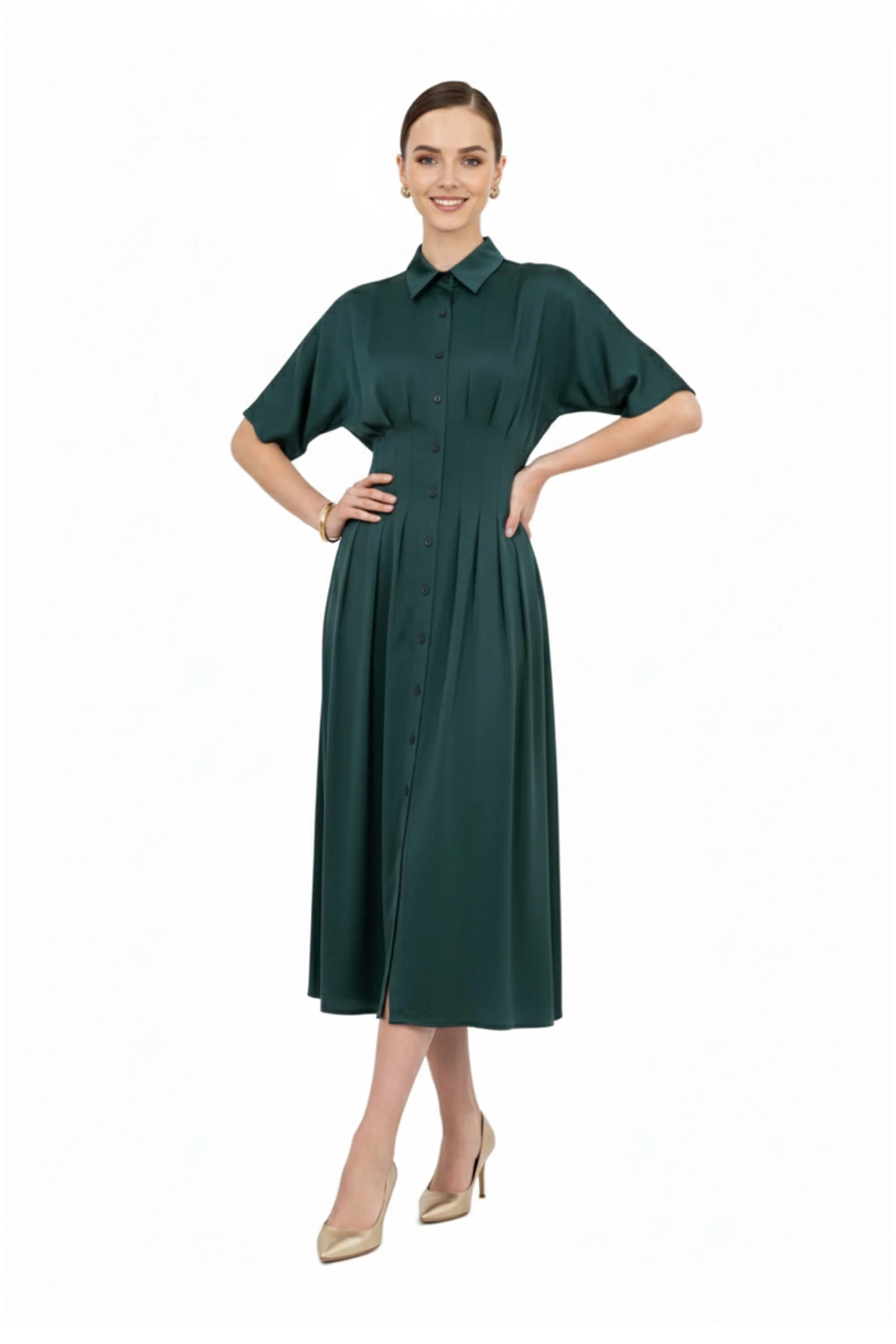 Este vestido destaca por su refinada silueta camisera con cuello de solapa, que aporta una estructura profesional y atemporal a la prenda. El punto focal de diseño es su cintura magistralmente plisada, con pliegues verticales que convergen en el talle para esculpir una figura de reloj de arena antes de abrirse en una falda de corte A de gran movimiento. Presenta una botonadura frontal y mangas cortas de corte fluido que equilibran la sobriedad del cuello con una ligereza moderna.
