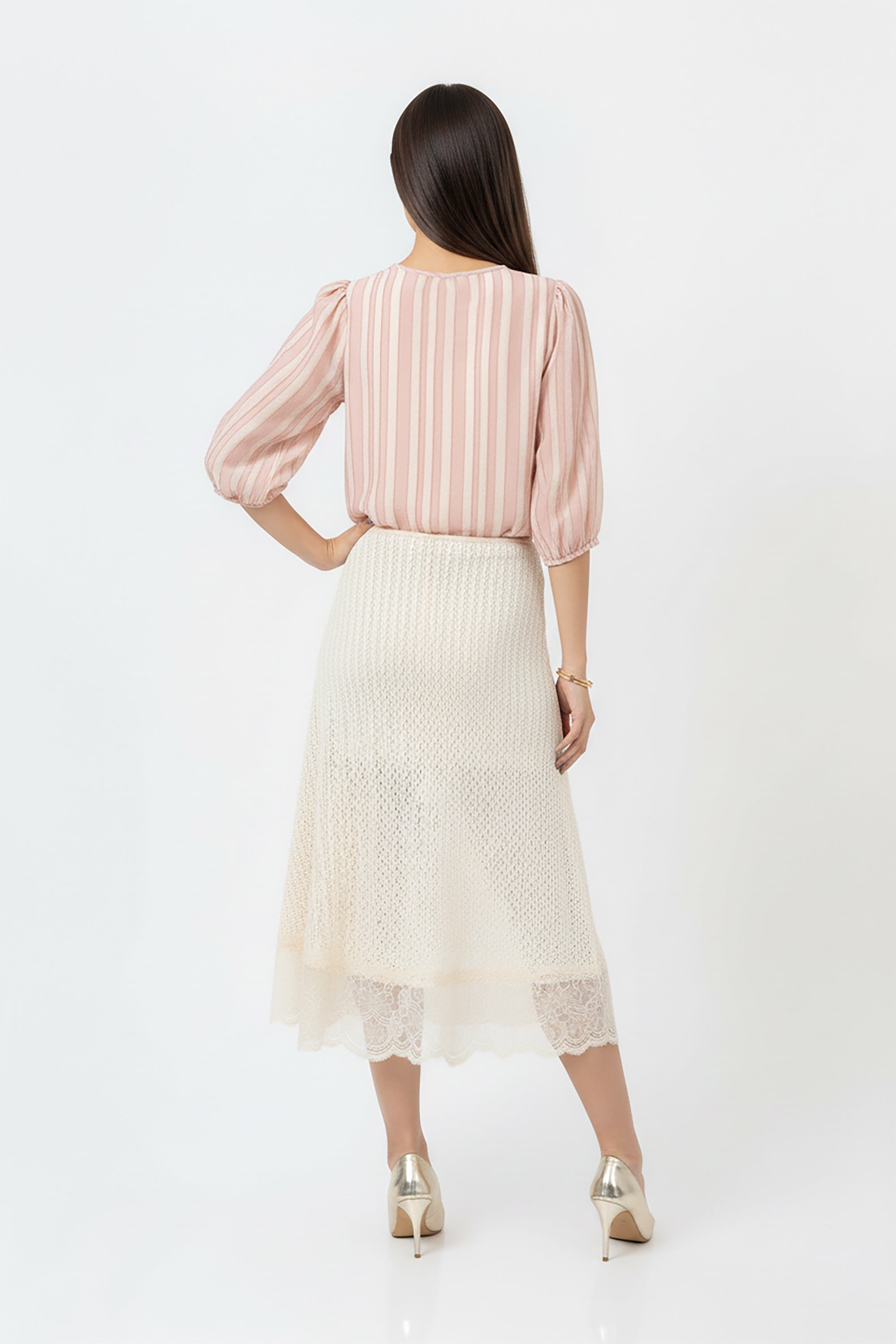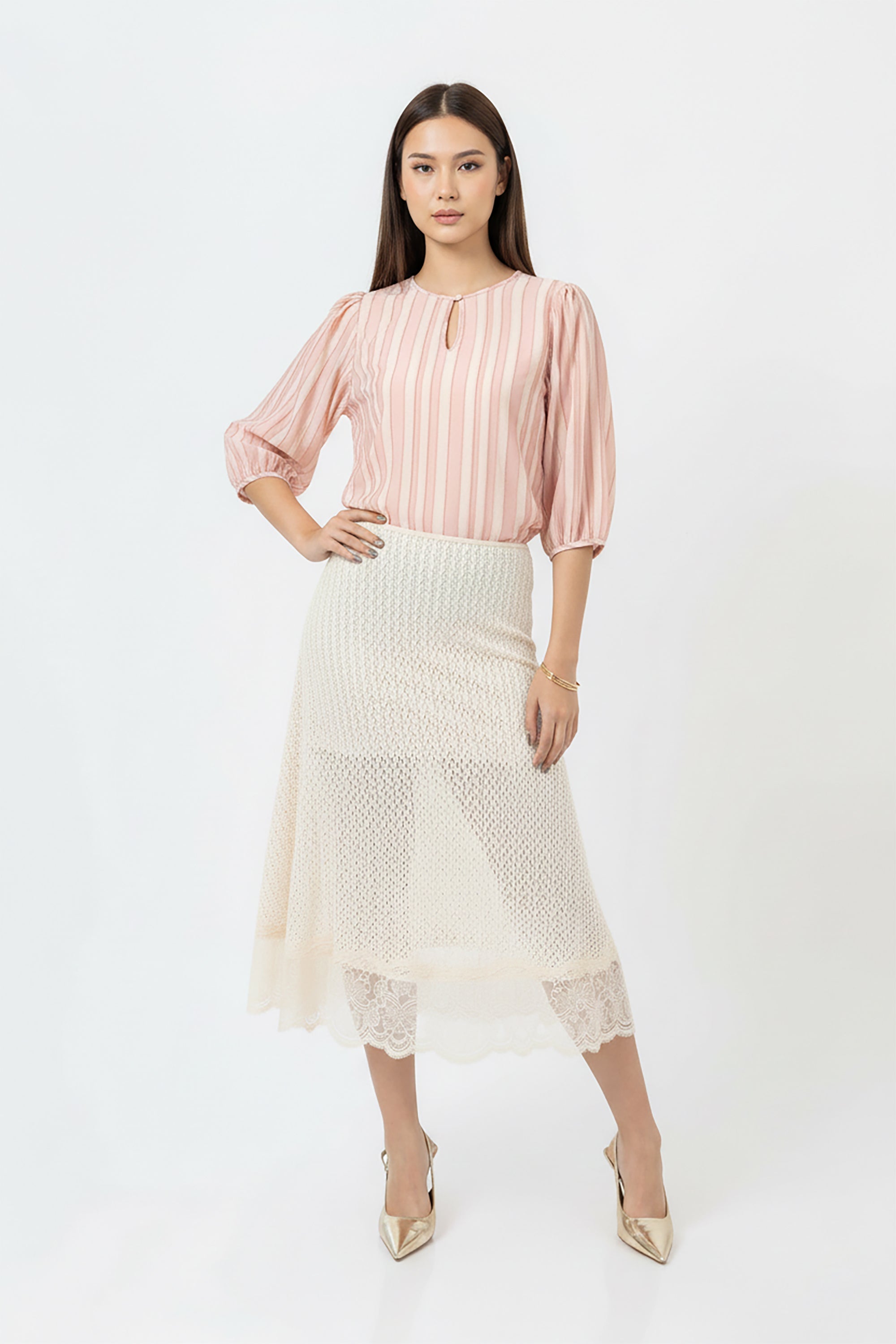 Esta blusa destaca por su refinada silueta de cuello redondo con una sutil abertura frontal en lágrima (keyhole), que aporta un detalle de diseño minimalista y sofisticado. El punto focal absoluto es su exquisita textura de flecos cortos tridimensionales, distribuidos de manera orgánica por toda la prenda para crear un movimiento etéreo y una profundidad visual única. Se caracteriza por sus mangas abullonadas de corte medio, que añaden un volumen romántico y una estructura contemporánea a la silueta.