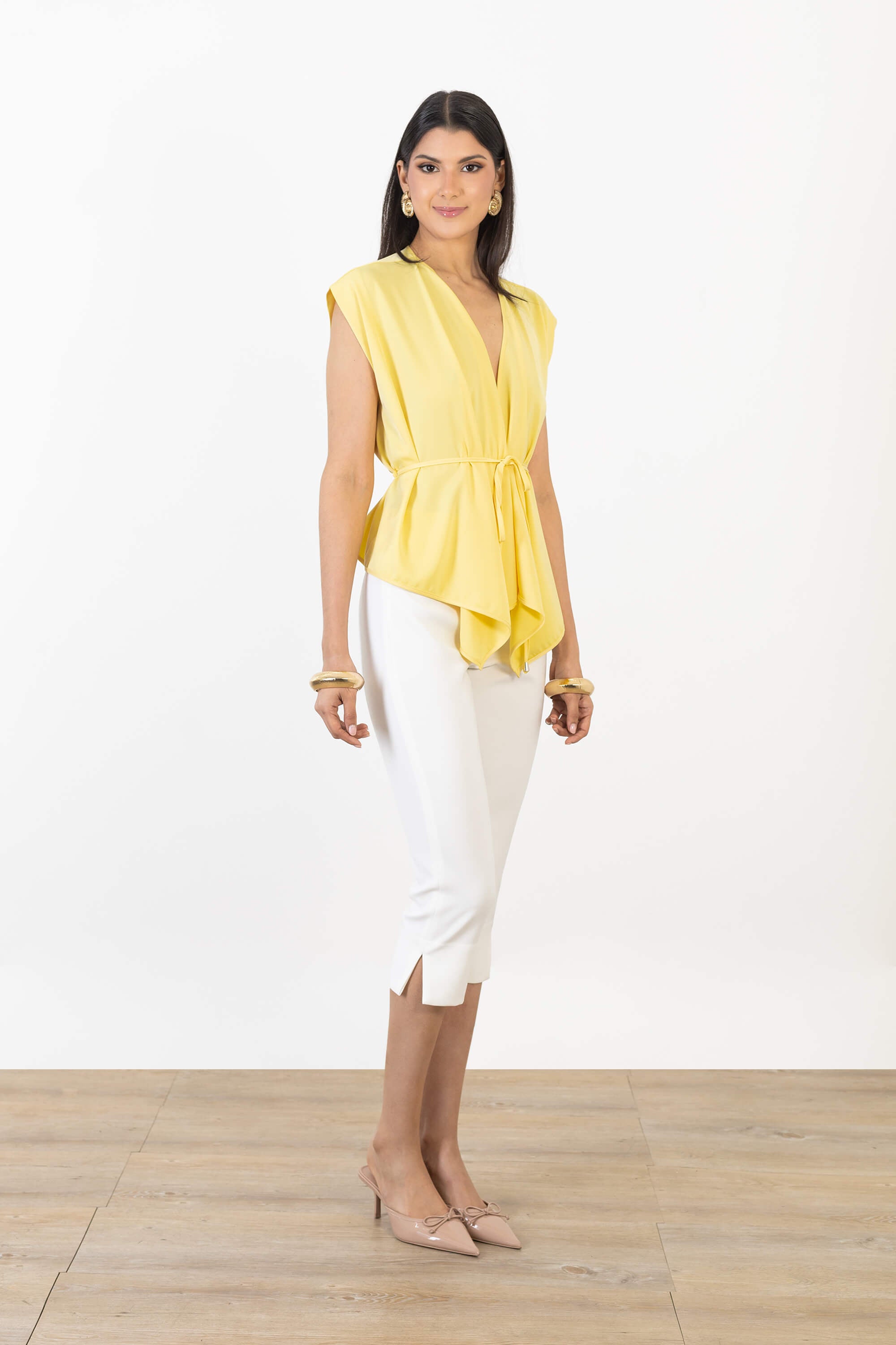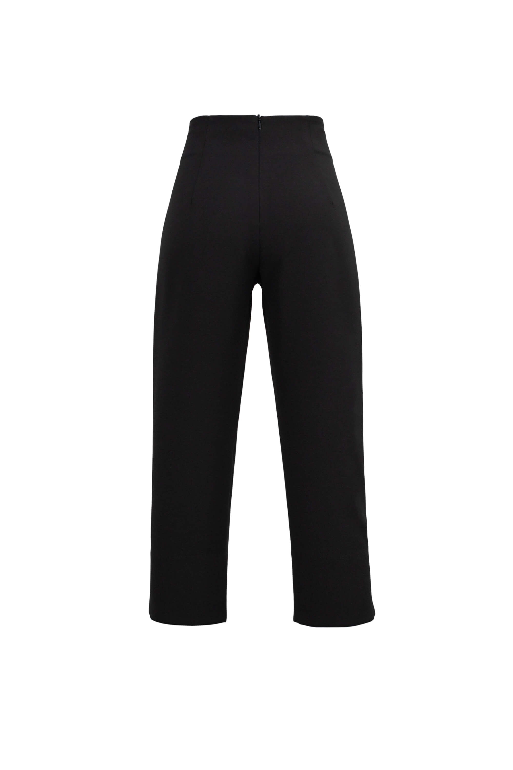 Este pantalón destaca por su impecable silueta de pierna recta y corte cropped, diseñada para estilizar visualmente la figura y proyectar una imagen de frescura sastre contemporánea. El punto focal de diseño es su talle ultra alto con costuras verticales acentuadas, que añaden una estructura arquitectónica y una verticalidad infinita a la parte superior de la prenda. Se caracteriza por incorporar pequeñas aberturas laterales en el bajo, un detalle refinado que aporta movimiento y modernidad al diseño.