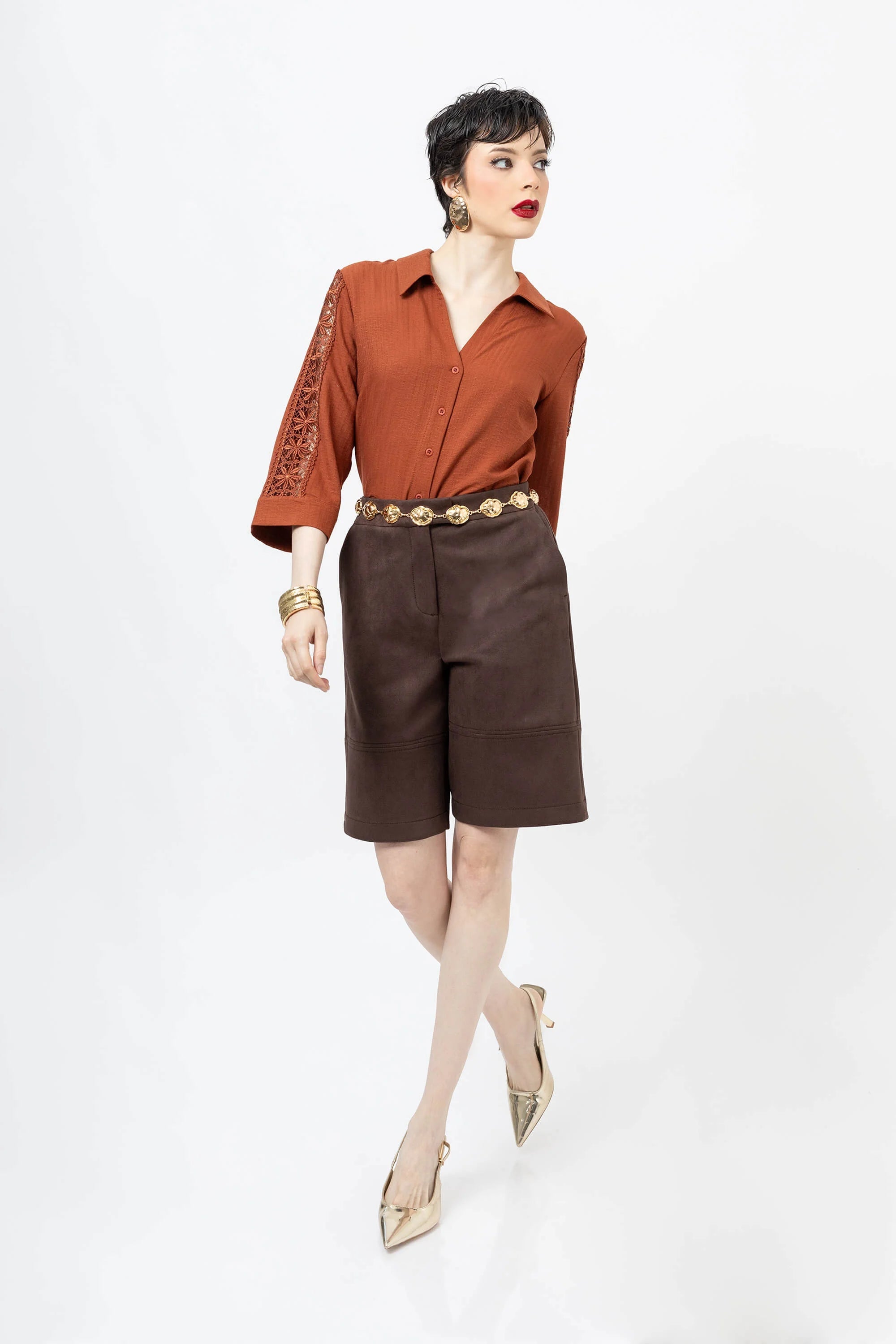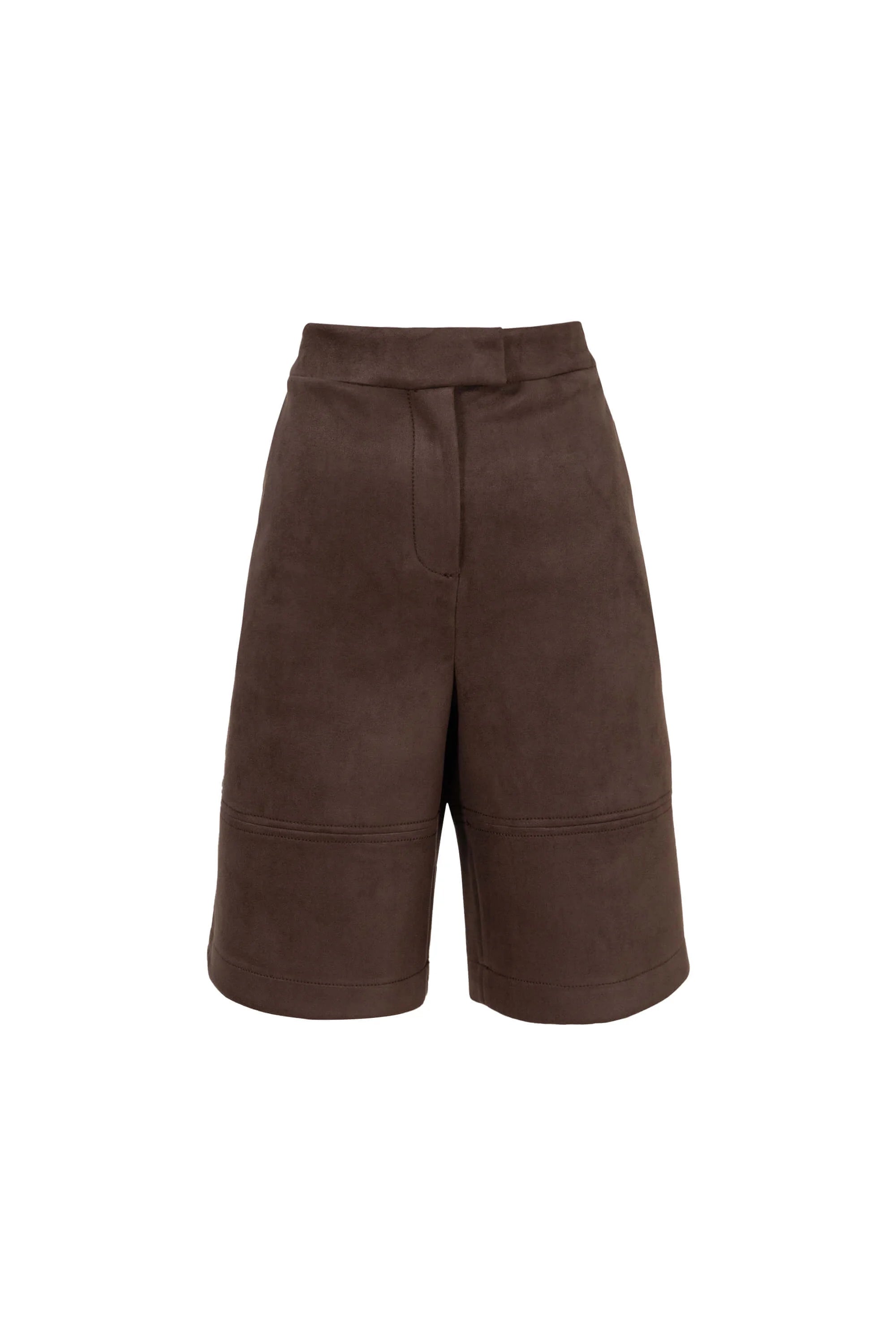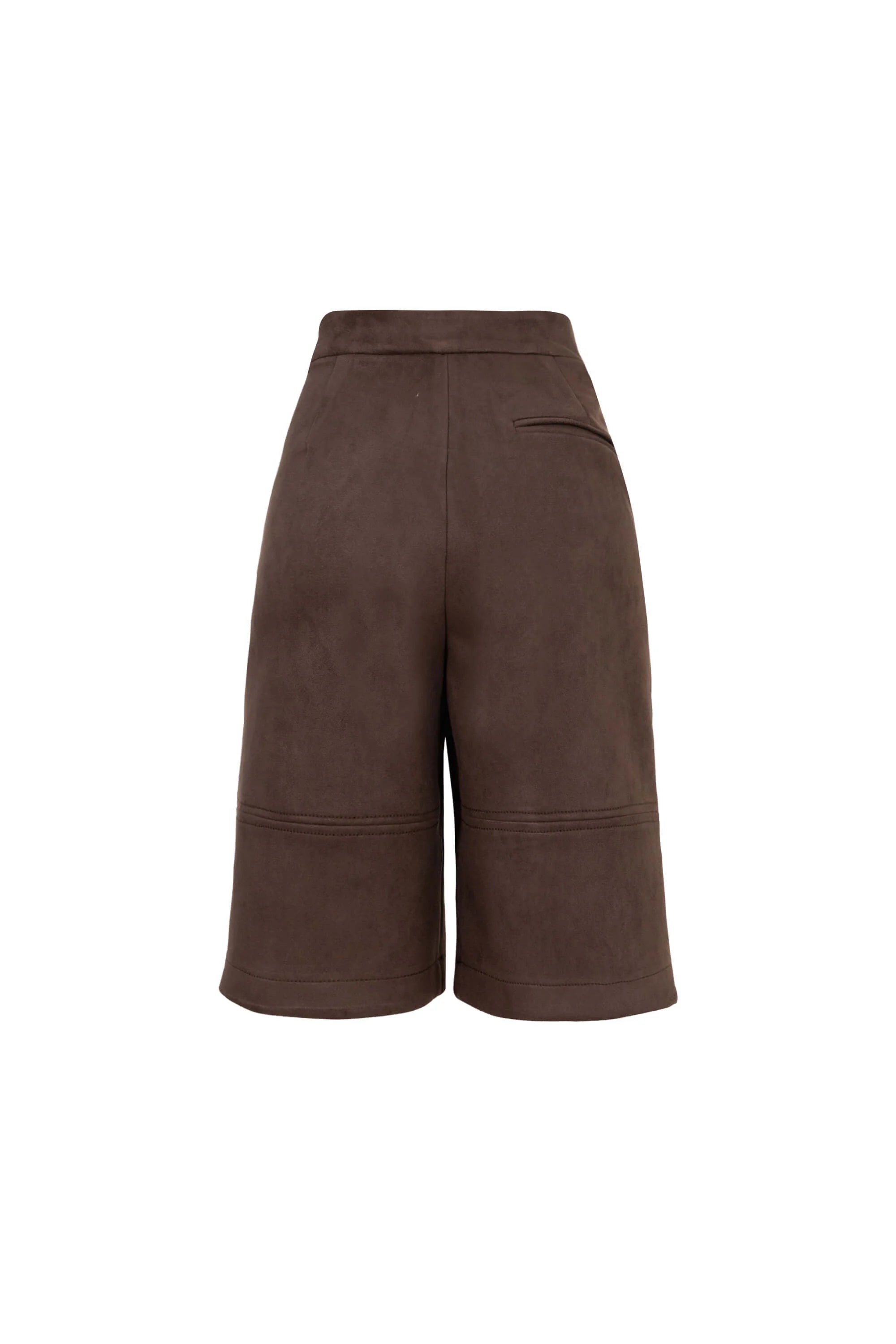 La Bermuda camel de suede de Poet Couture se inspira en los tonos cálidos y naturales. Su corte estructurado y la suavidad del tejido tipo gamuza la convierten en una prenda esencial para crear looks relajados con un aire sofisticado. Perfecta para un estilo effortless-chic de día o de tarde.