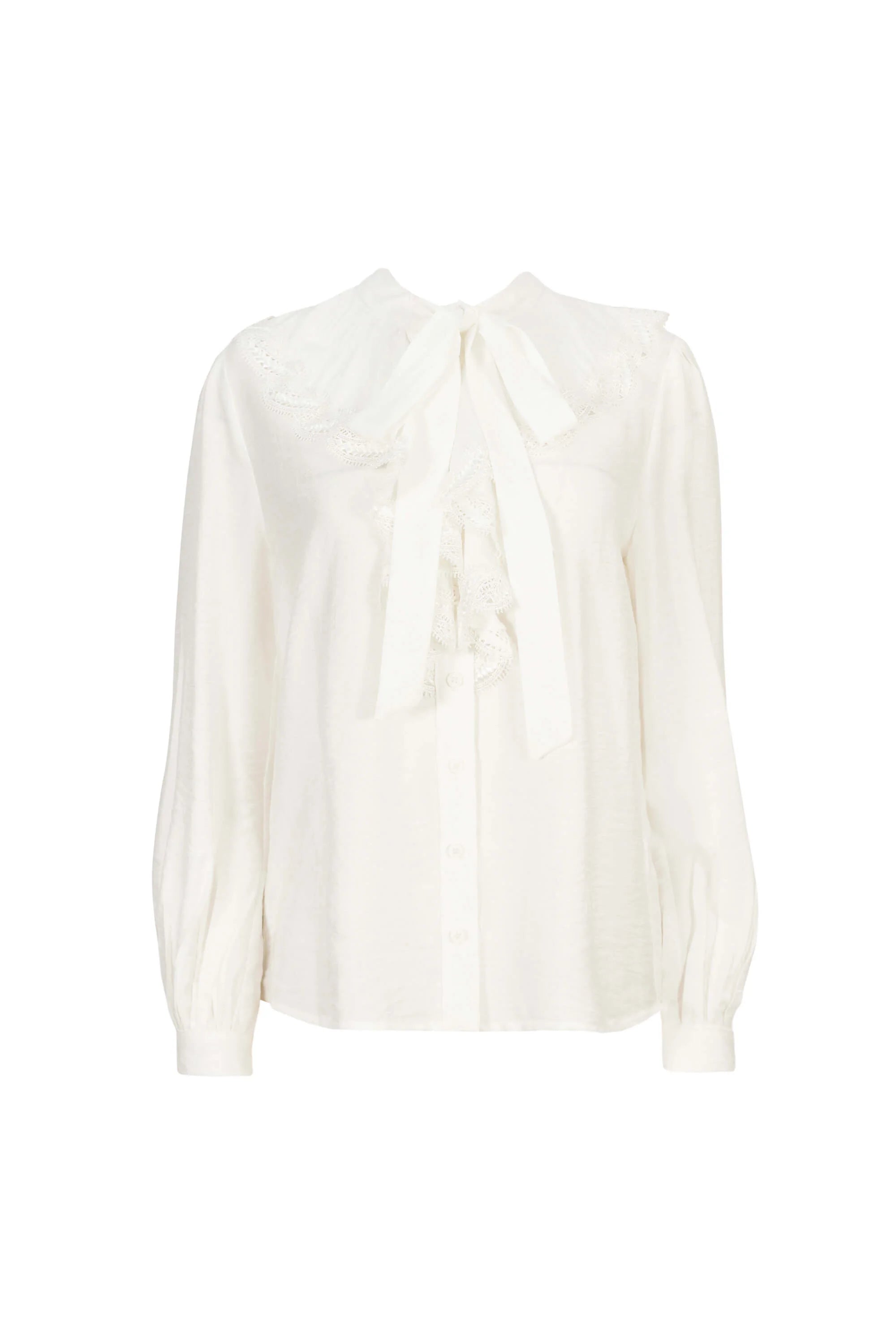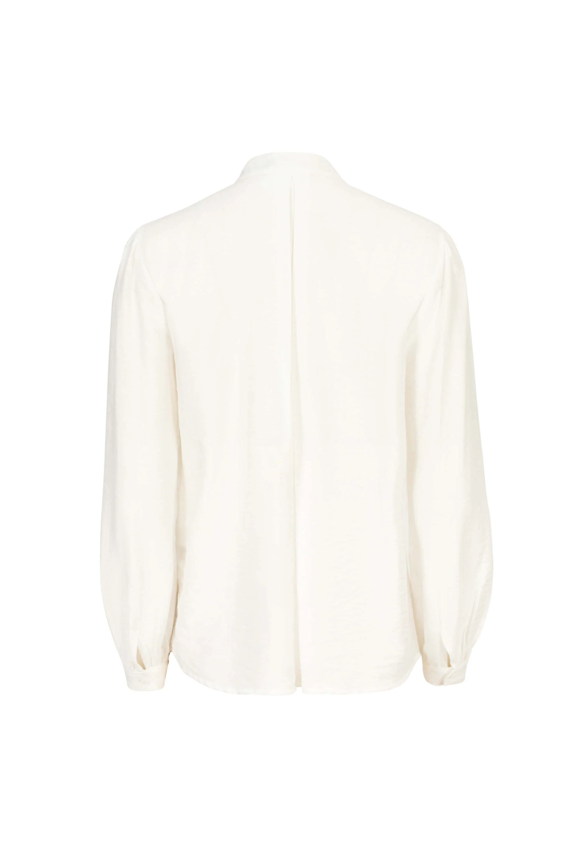Esta blusa hueso combina una silueta clásica con detalles románticos como avíos decorativos en el escote y sutiles olanes. Ideal para crear looks de oficina con un toque femenino y refinado.