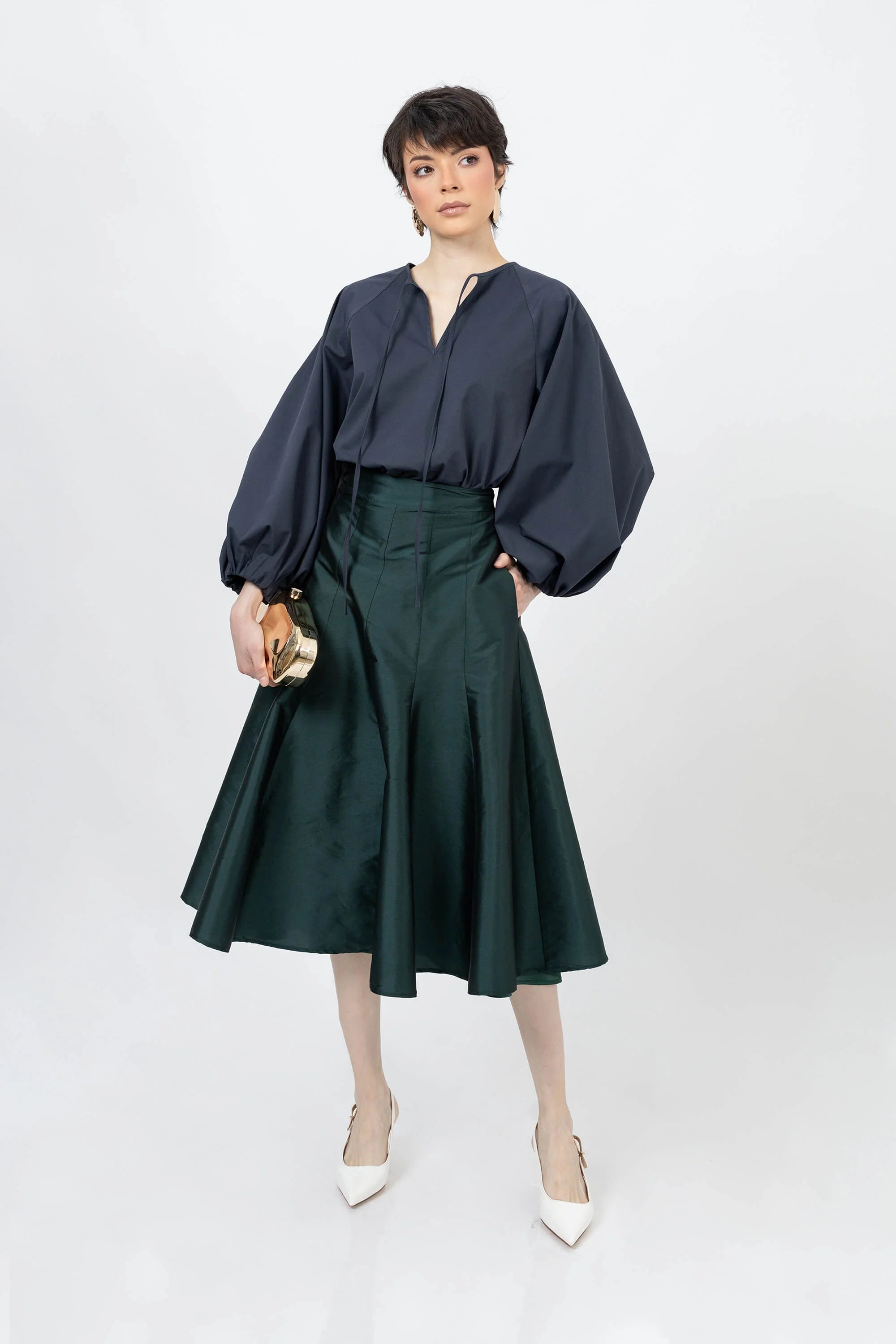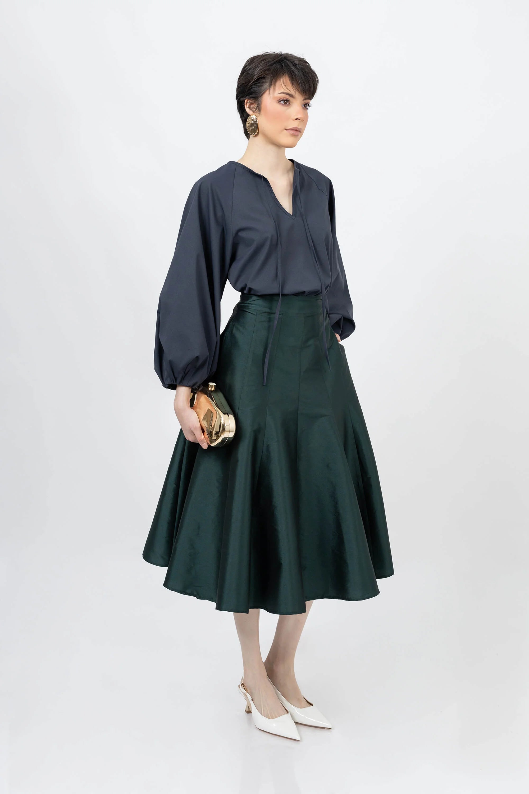 La Blusa manga ranglan bishop con jaretas de Poet Couture combina elegancia relajada y diseño contemporáneo. Su silueta amplia con puños fruncidos y jaretas ajustables crea un efecto fluido y femenino. Confeccionada en tejido ligero y suave al tacto, es ideal para looks casuales con un aire sofisticado. Perfecta para combinar con faldas midi o pantalones de cintura alta, aportando un equilibrio entre comodidad y estilo urbano.
