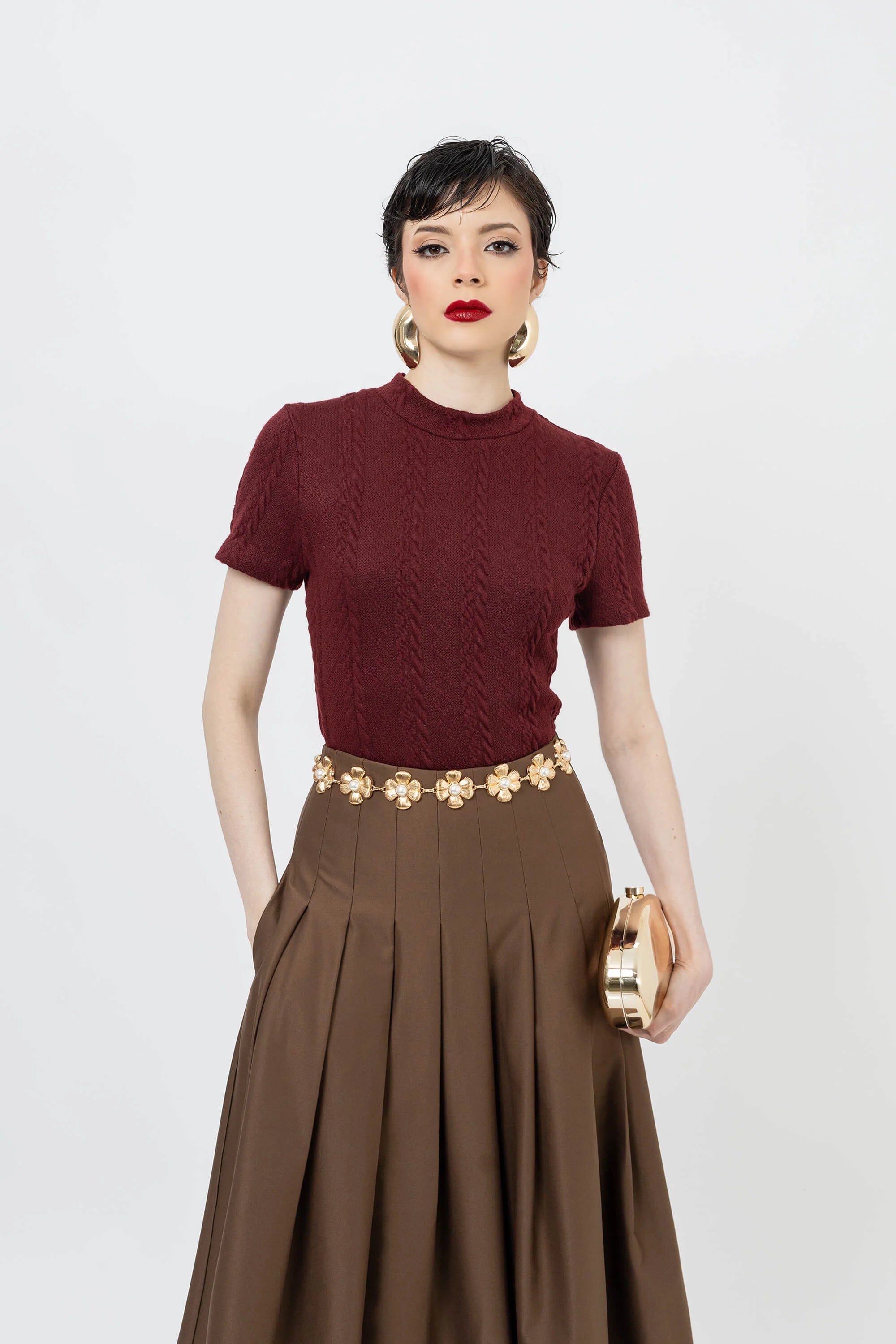 La blusa de manga corta con cuello alto de Poet Couture combina sencillez y refinamiento. Su tejido ligero de punto aporta textura y confort, mientras su diseño ajustado estiliza la silueta con elegancia contemporánea. Ideal para combinar con faldas o pantalones de talle alto.