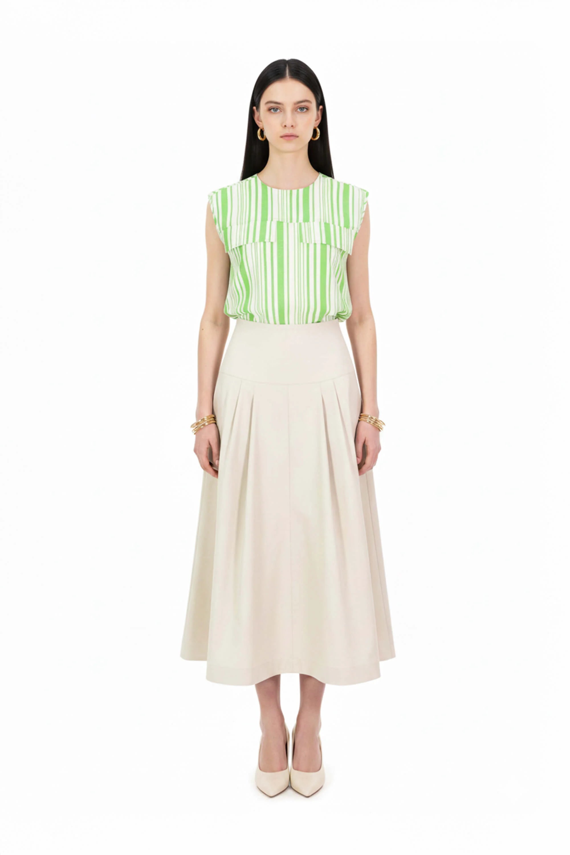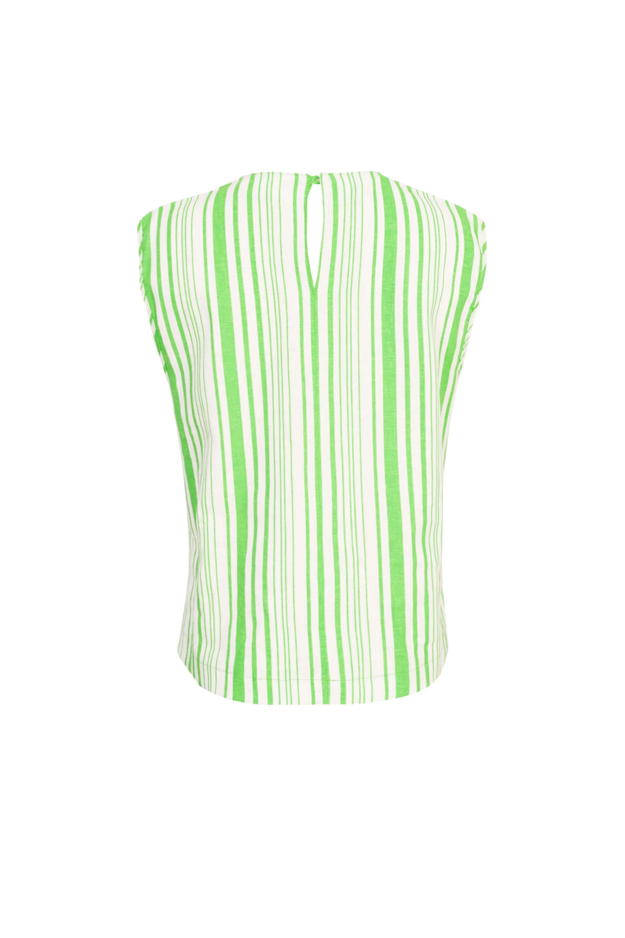 Elaborada en tejido de alta calidad con un patrón de rayas verticales, esta blusa sin mangas presenta un escote básico y una cartera frontal que aporta estructura y estilo contemporáneo. Su corte recto y fresco la convierte en una prenda ideal para combinar con pantalones o faldas de temporada.