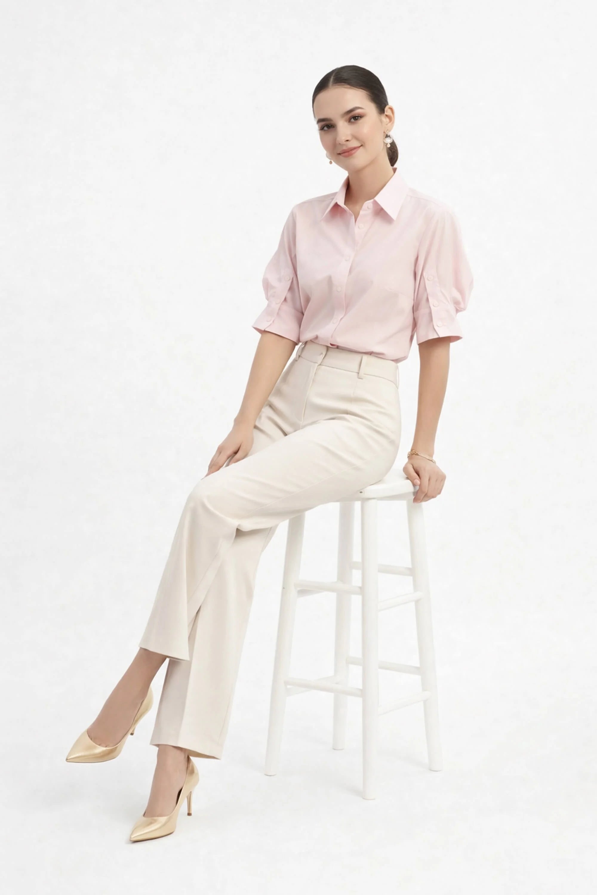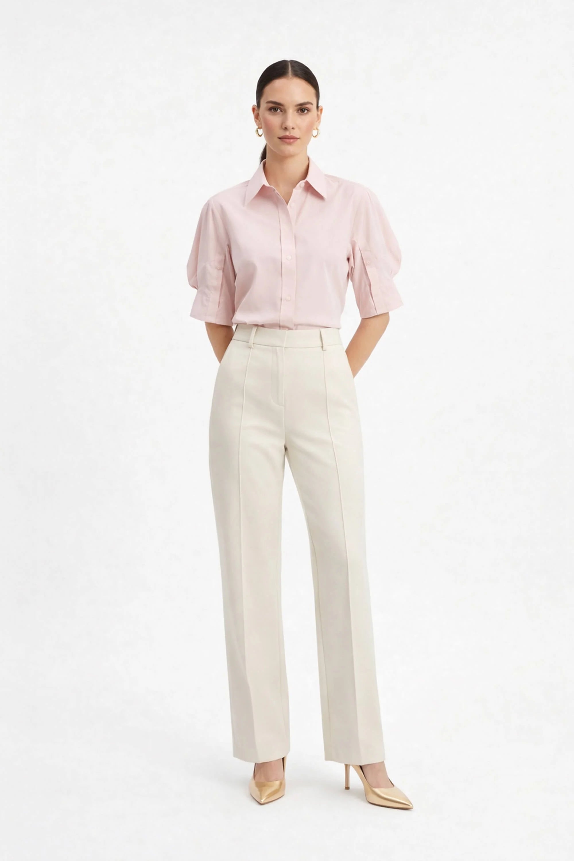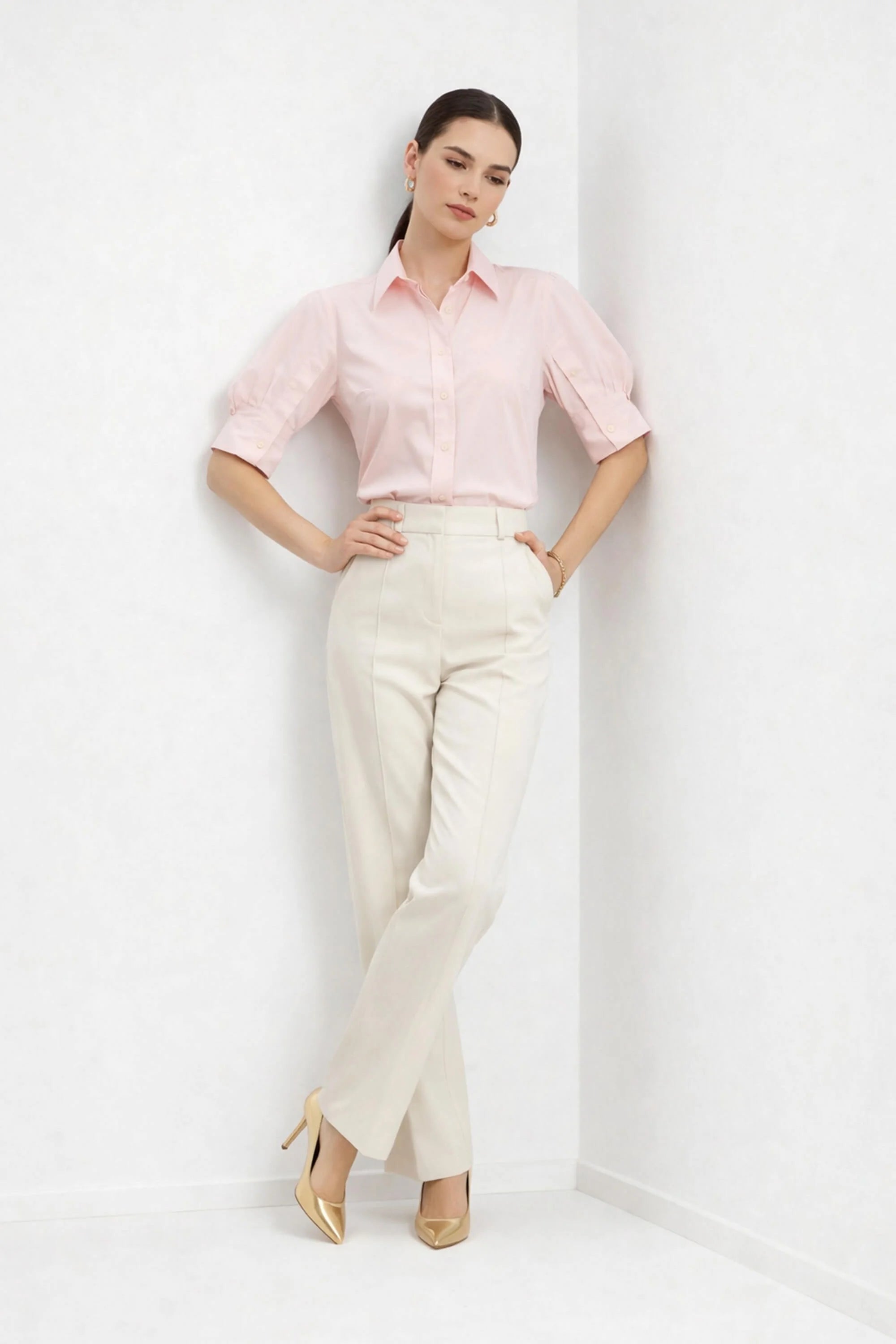 Eleva tus básicos de oficina y de fin de semana con esta camisa de diseño arquitectónico. Esta prenda no es una blusa común; es una pieza de declaración que combina la sastrería clásica con detalles femeninos de vanguardia, como sus volúmenes dramáticos y su espalda plisada.