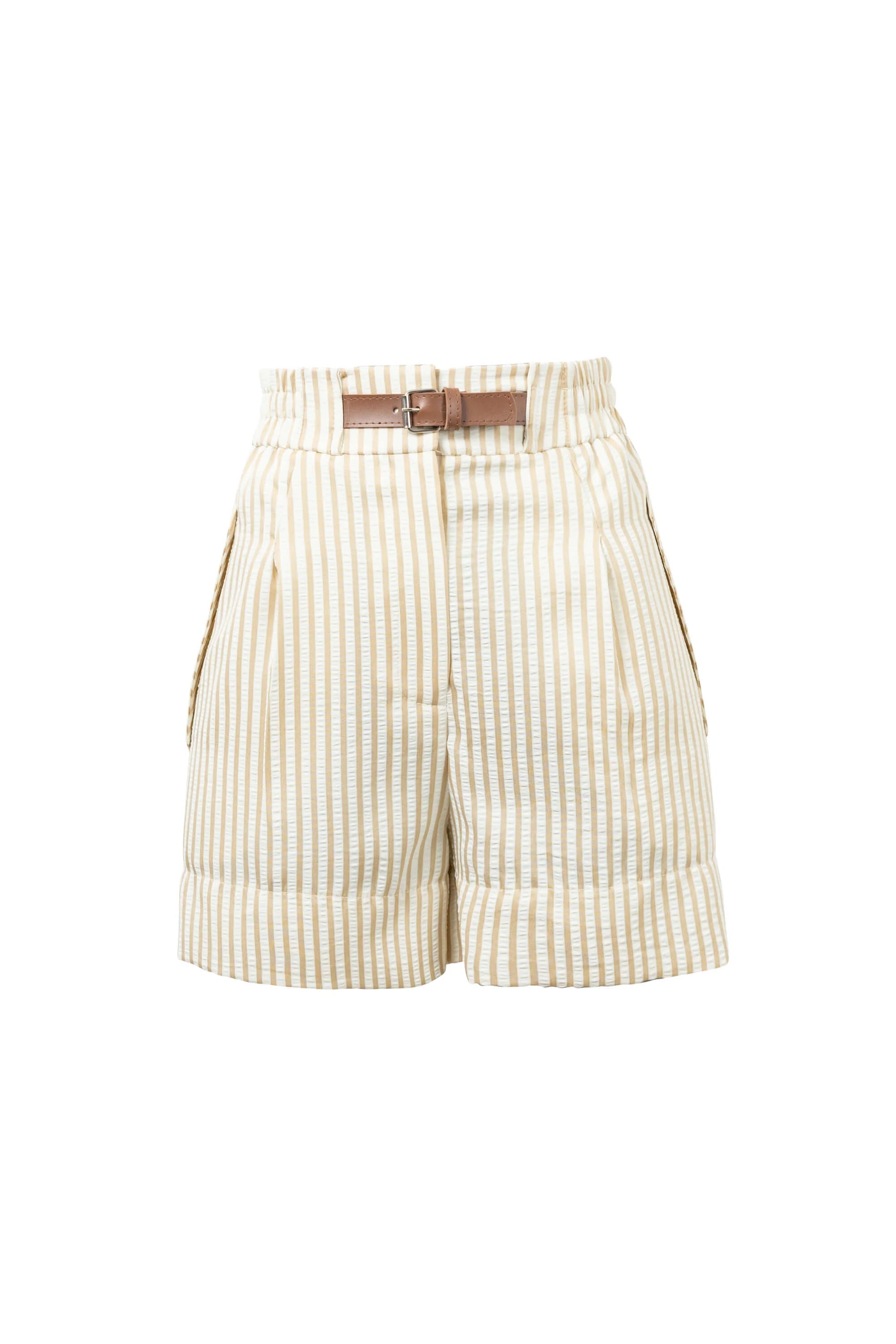 Short de tiro alto con silueta paperbag, diseñado para resaltar la cintura mediante un fruncido elástico en la parte superior. Presenta un patrón de rayas verticales que estiliza la figura y pinzas frontales que aportan un volumen equilibrado. El diseño se complementa con un dobladillo ancho con vuelta y un cinturón delgado de acabado sintético que añade un contraste de texturas elegante y funcional.