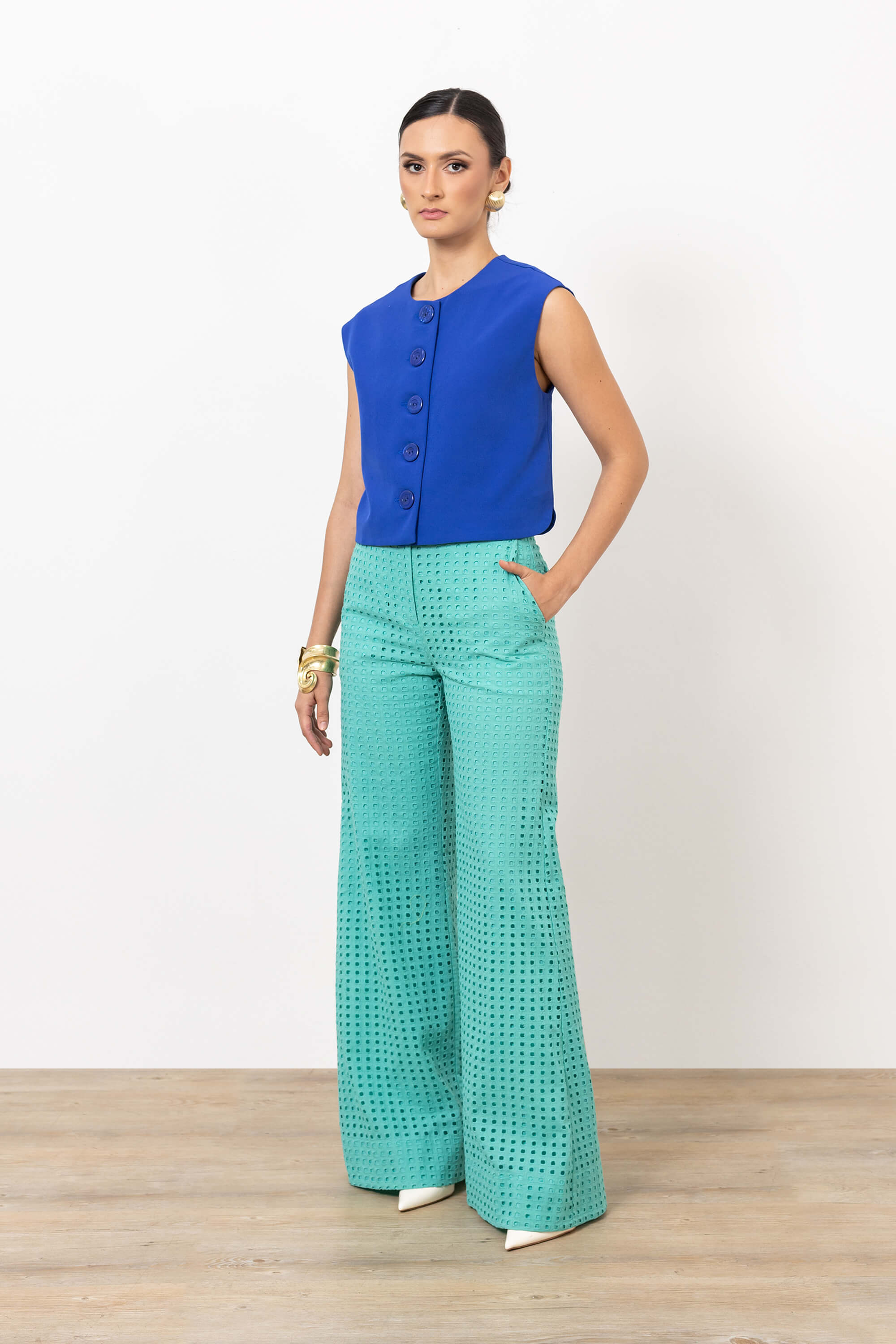 Este pantalón destaca por su impecable silueta de pierna ancha (wide-leg) y talle alto, diseñada para alargar visualmente la figura y proporcionar un movimiento majestuoso y fluido al caminar. El punto focal de diseño es su exclusivo tejido de bordado inglés (eyelet), que presenta una cuadrícula de perforaciones precisas que crean un juego de transparencias sofisticado y moderno. Se caracteriza por una pretina limpia y estructurada que proyecta una imagen de lujo contemporáneo y elegancia artesanal.
