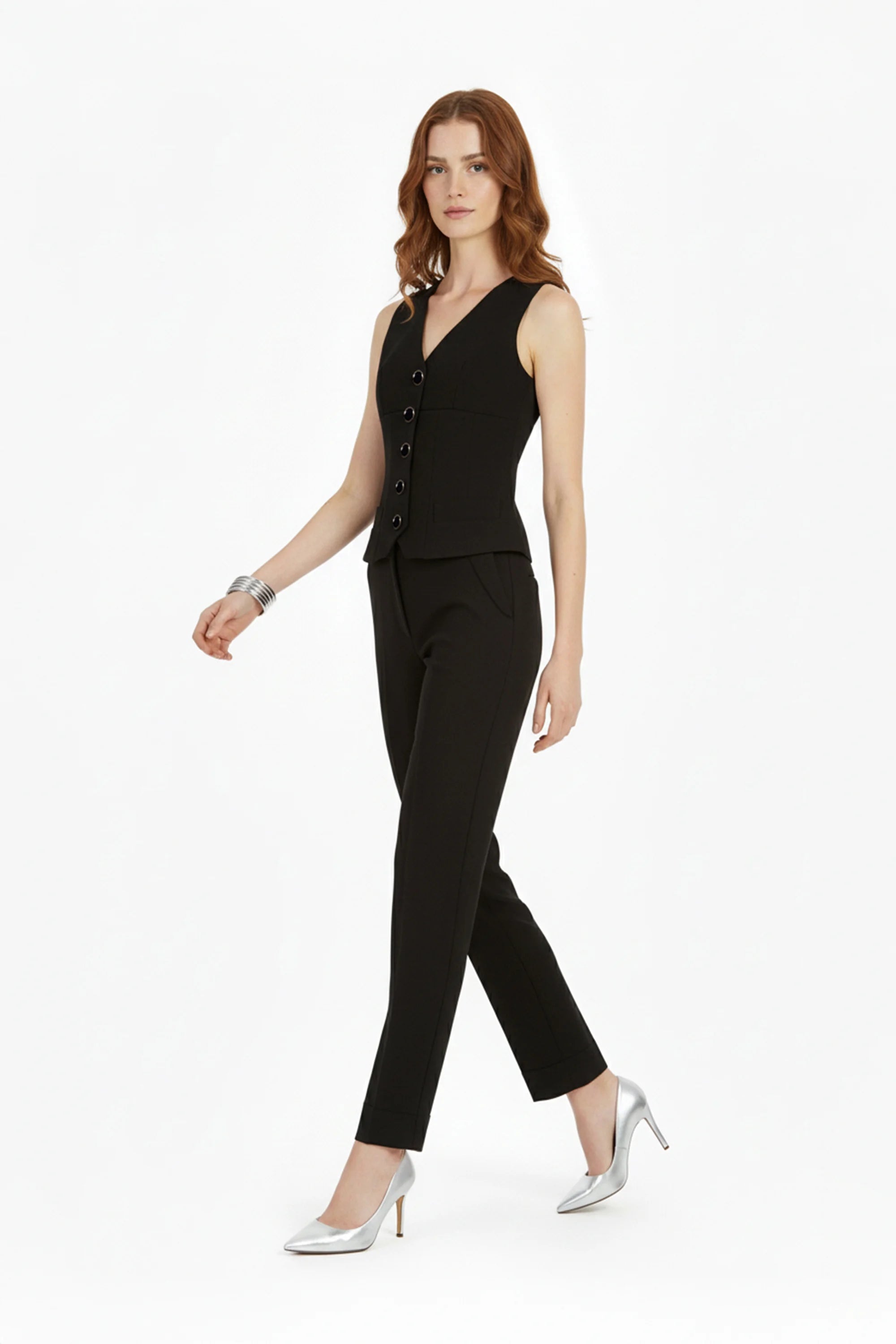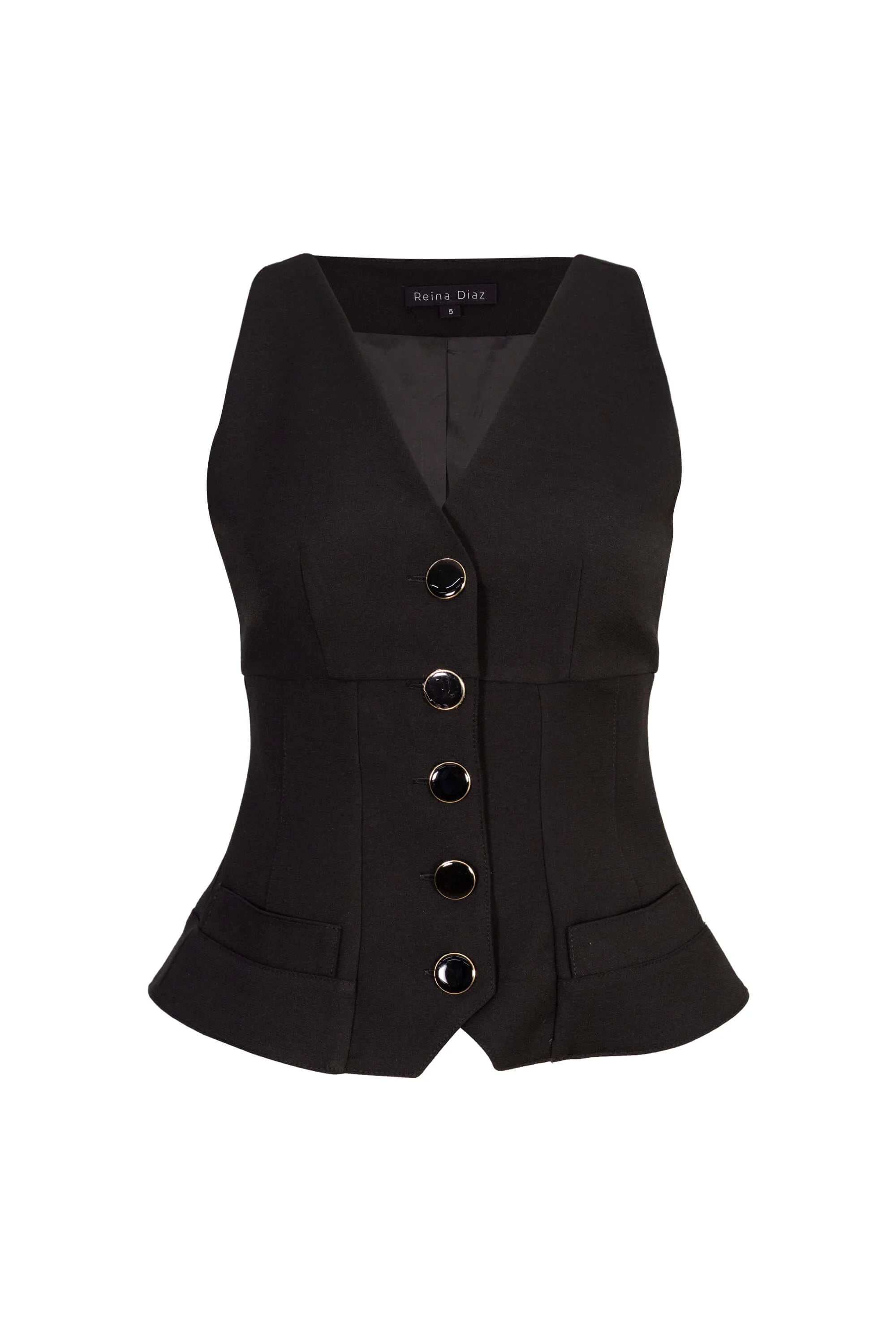Este chaleco sin mangas de Reina Díaz es una declaración de estilo sobrio y refinado. Su corte alargado y entallado en la cintura realza la figura con sutileza, mientras que el escote redondo y la abertura inferior brindan un equilibrio perfecto entre estructura y ligereza.