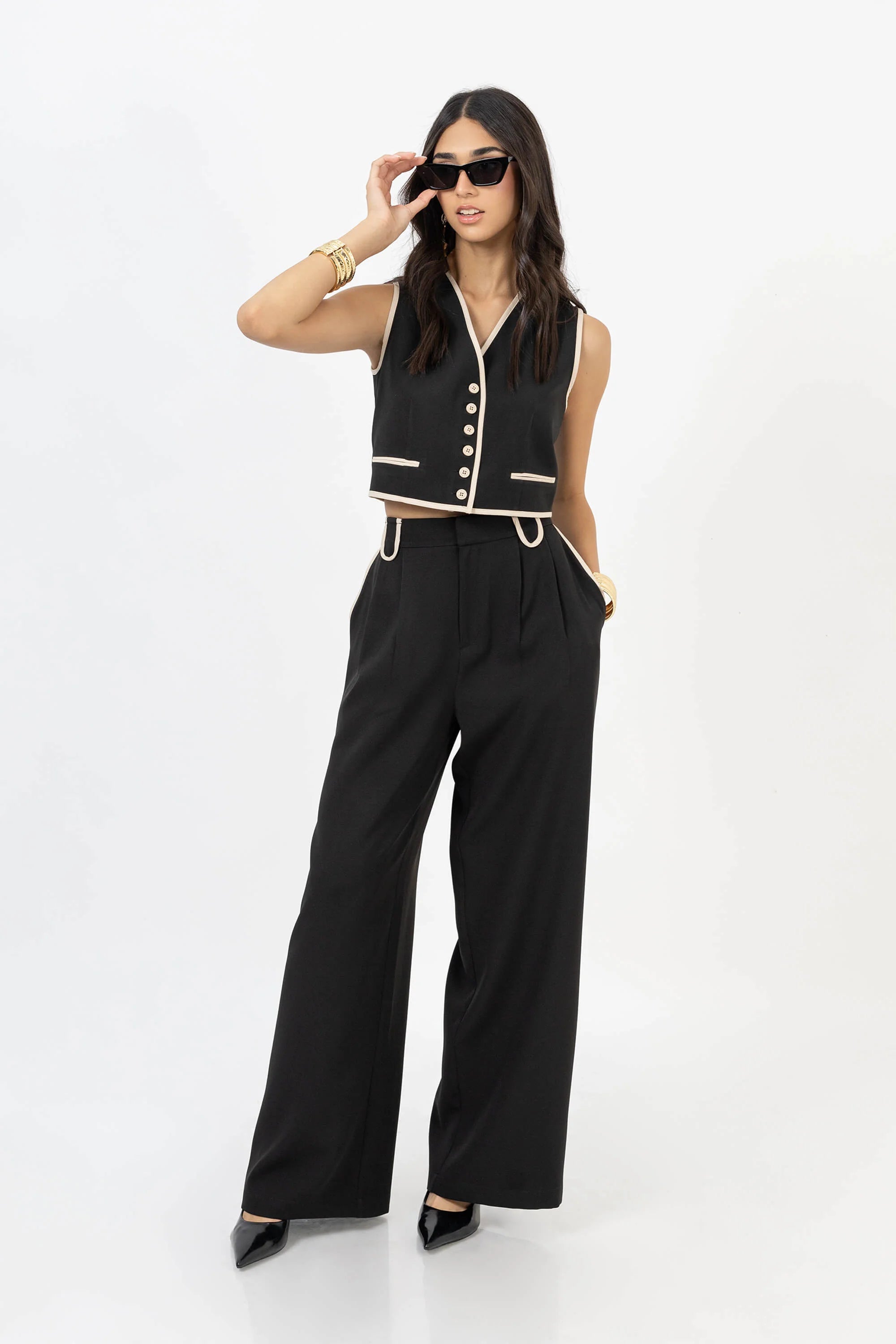 Este chaleco corto de rayas redefine la sastrería femenina con un diseño contemporáneo. Los vivos dobles en contraste en solapas y bolsillos aportan estructura visual y un toque distintivo.