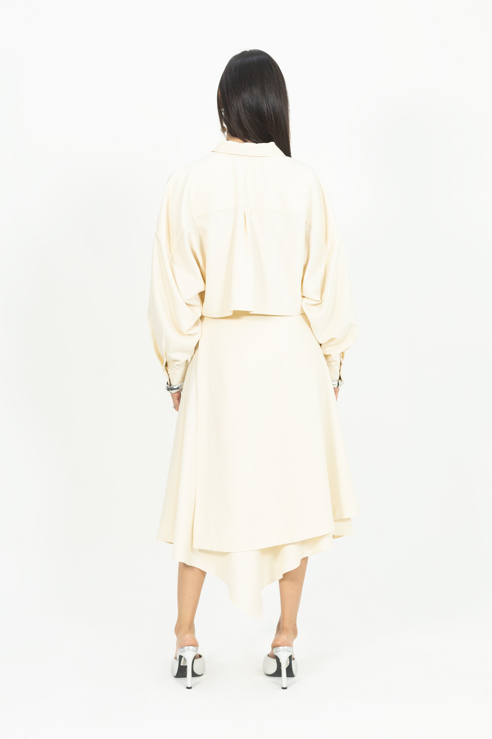 Confeccionada en un tejido ligero y de alta calidad en tono Ivory, esta chaqueta es perfecta para complementar conjuntos de día o noche, añadiendo un toque de sofisticación atemporal.