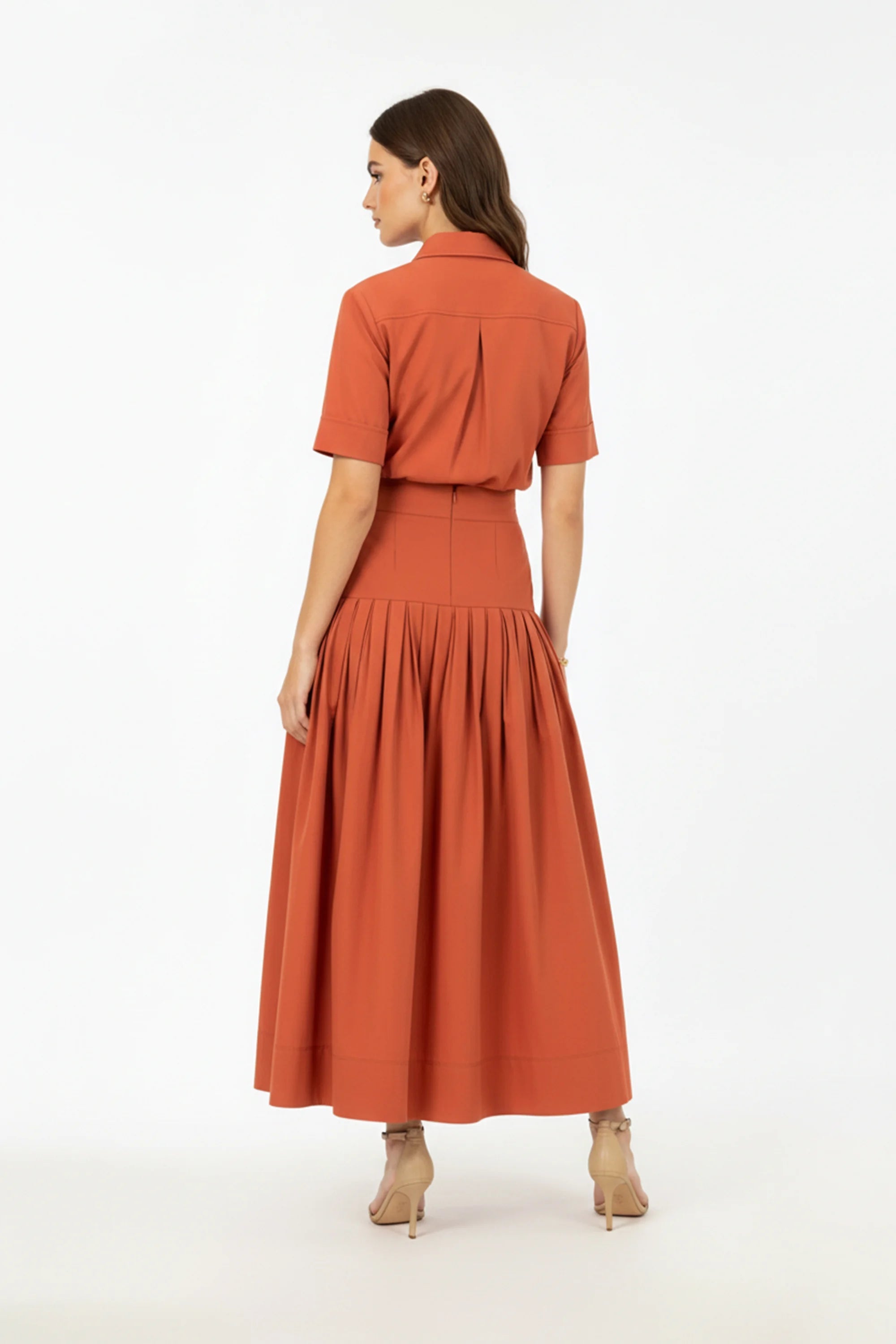Esta falda destaca por su magistral silueta de corte midi y talle alto, diseñada para esculpir la cintura y alargar la figura con una elegancia arquitectónica. El punto focal de diseño es su exclusivo canesú alargado y liso, del cual nace una cascada de tablas anchas de precisión sastre que aportan un volumen controlado y un movimiento rítmico de gran impacto visual. Se caracteriza por un bajo con doble costura reforzada que mantiene la estructura acampanada de la prenda, proyectando una imagen de lujo contemporáneo y feminidad empoderada.