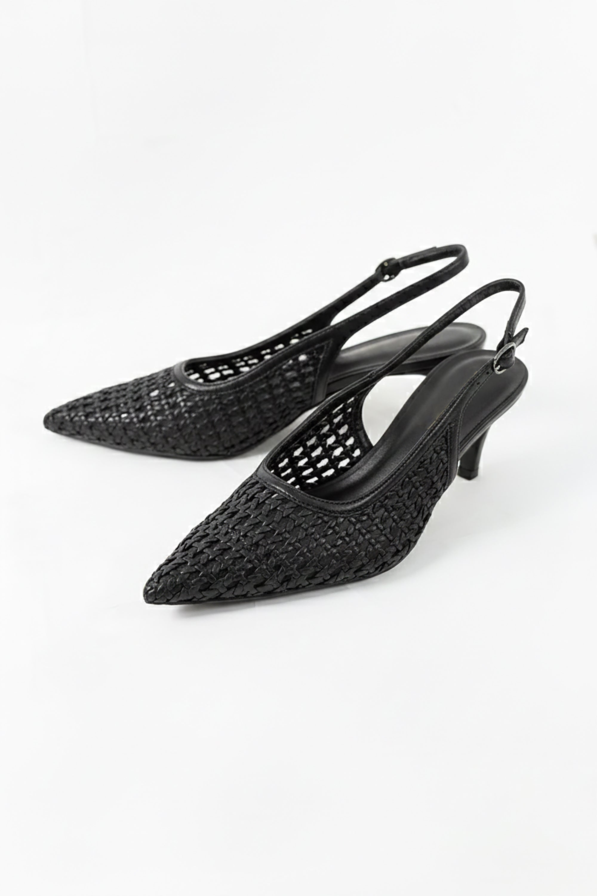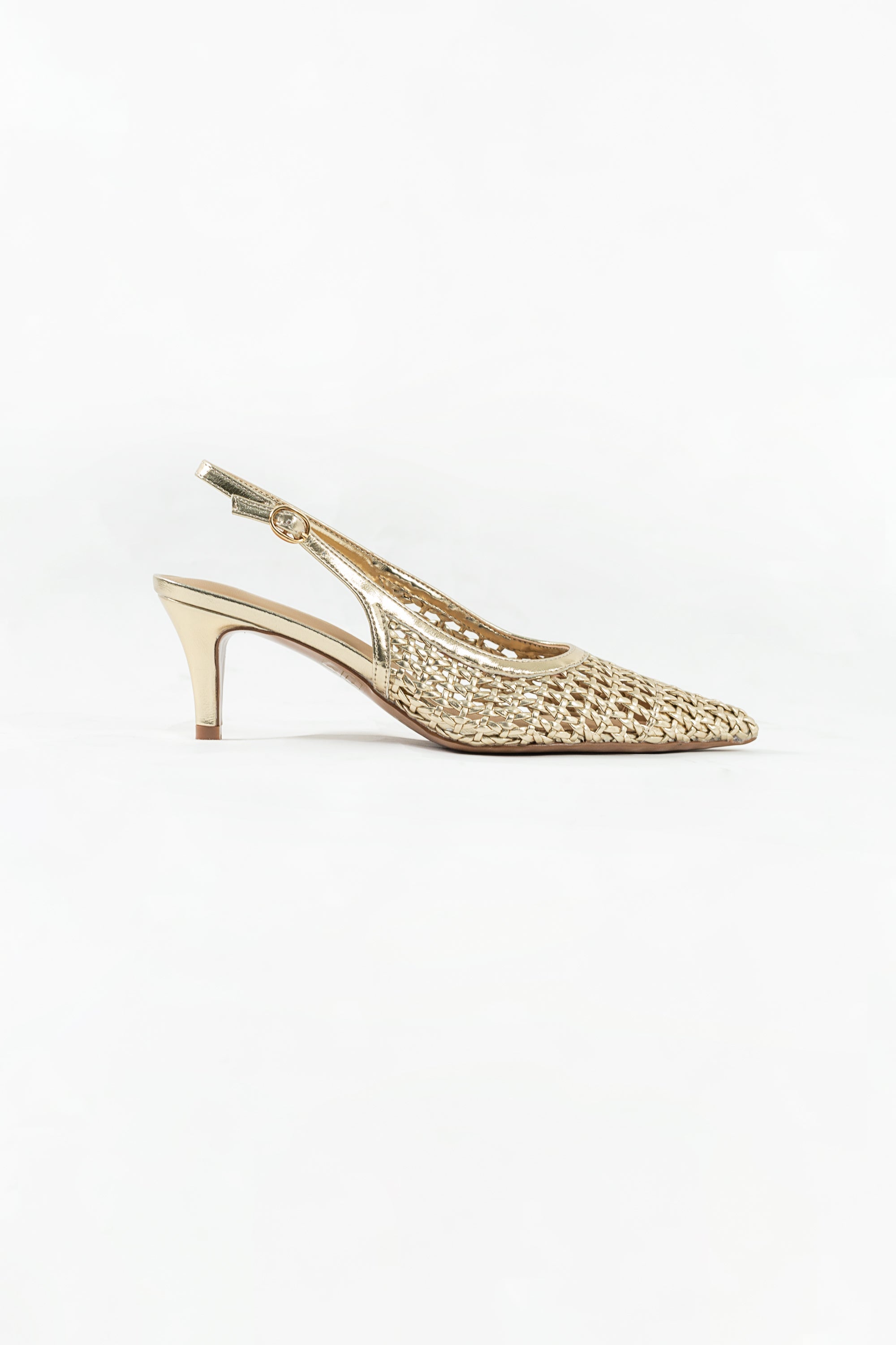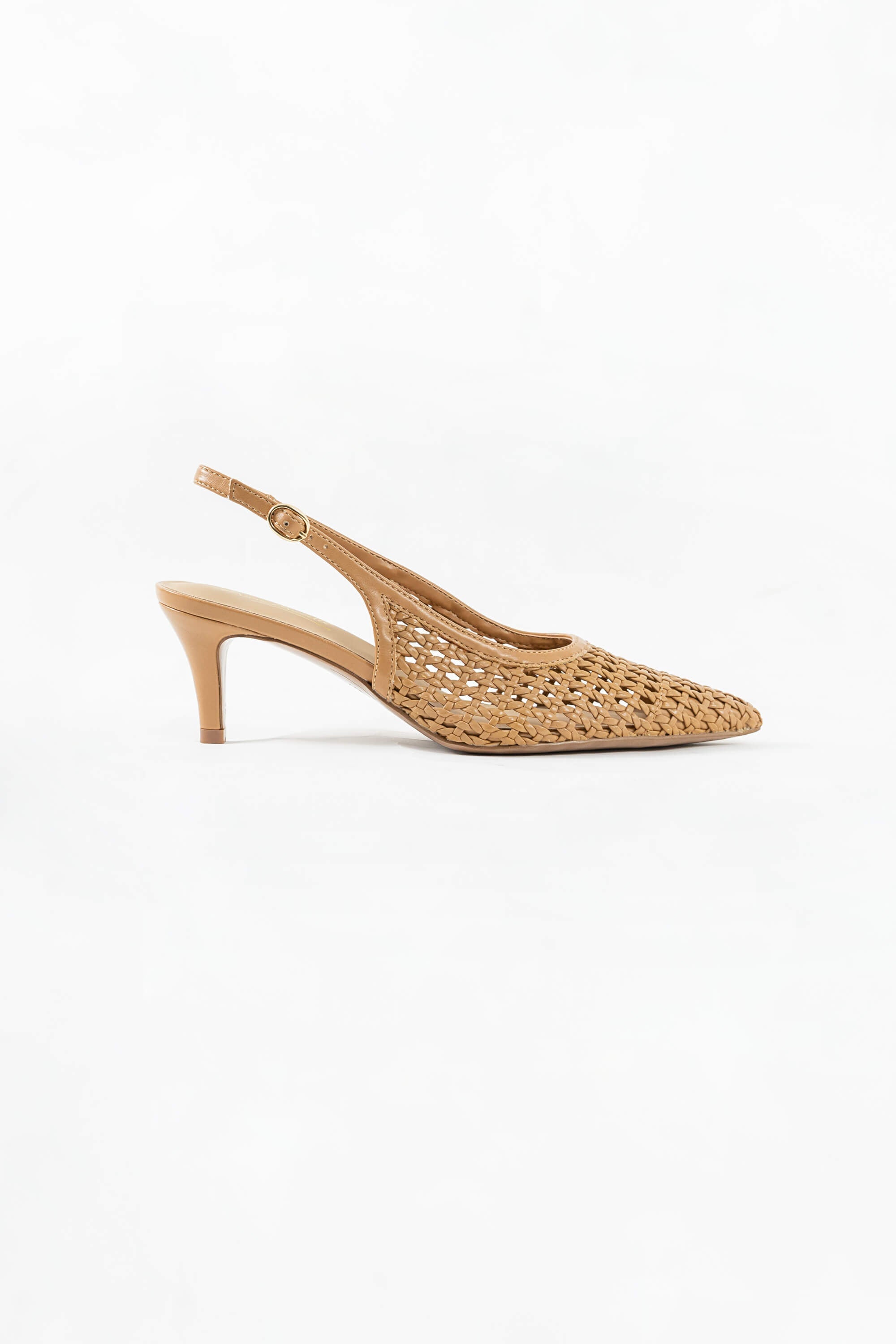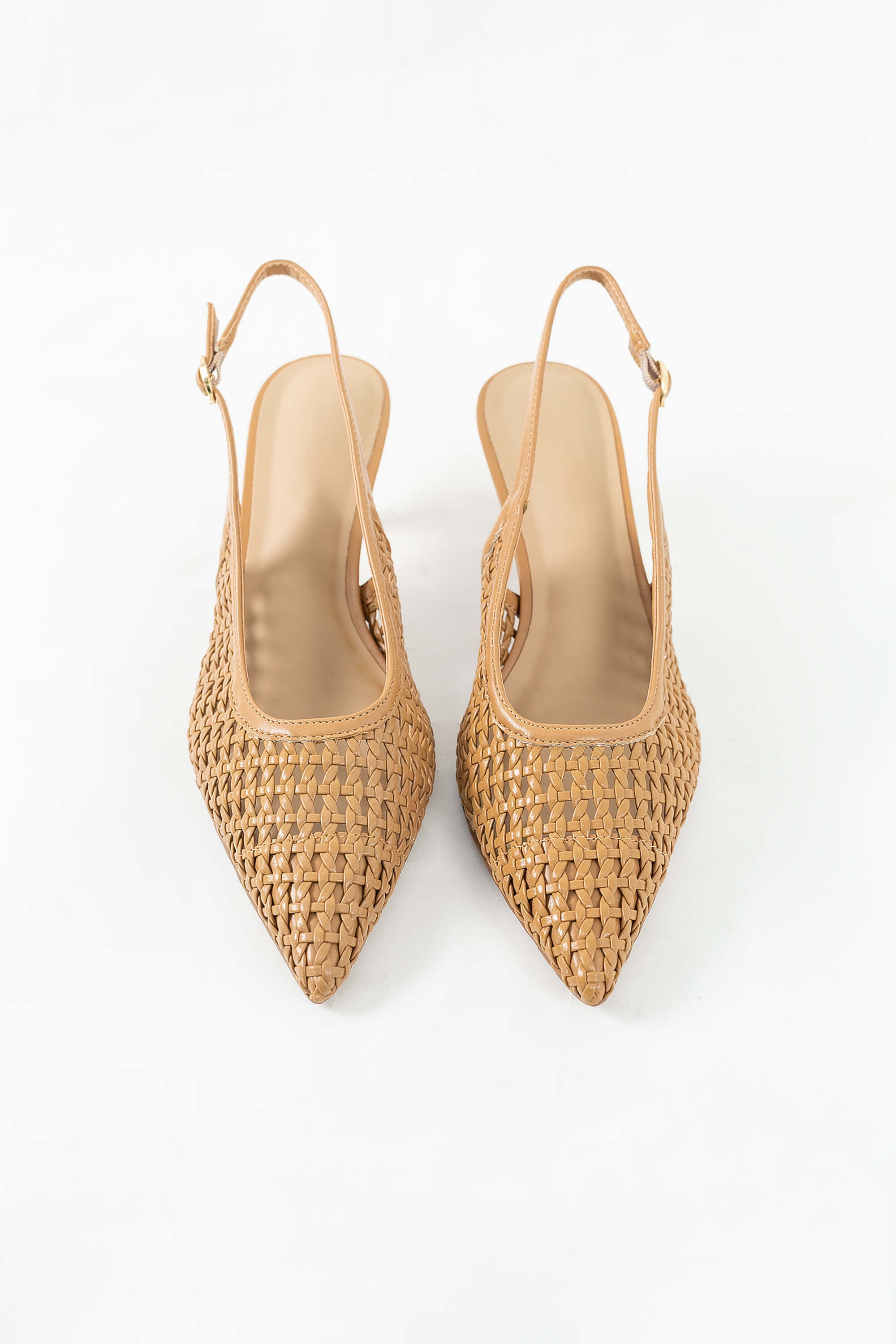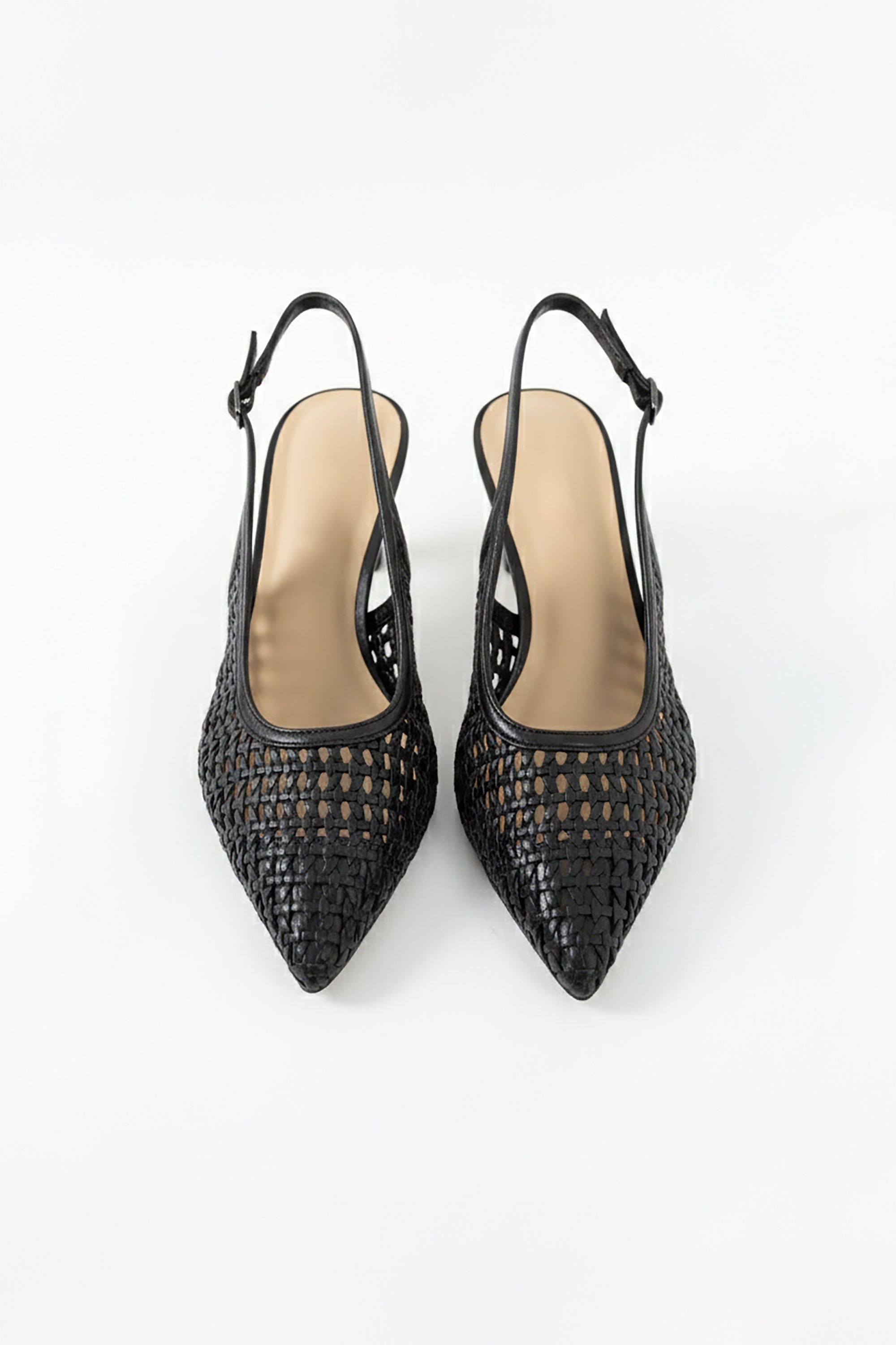 Estos zapatos representan la sofisticación orgánica en su máxima expresión. El modelo es un Slingback (talón abierto) que destaca por su intrincado cuerpo de cuero trenzado artesanalmente, creando un patrón de red que permite la transpirabilidad y aporta una textura visual rica. Su silueta de punta afilada (pointed toe) estiliza el pie, mientras que el tono proporciona una versatilidad absoluta para combinar con paletas neutras o vibrantes.