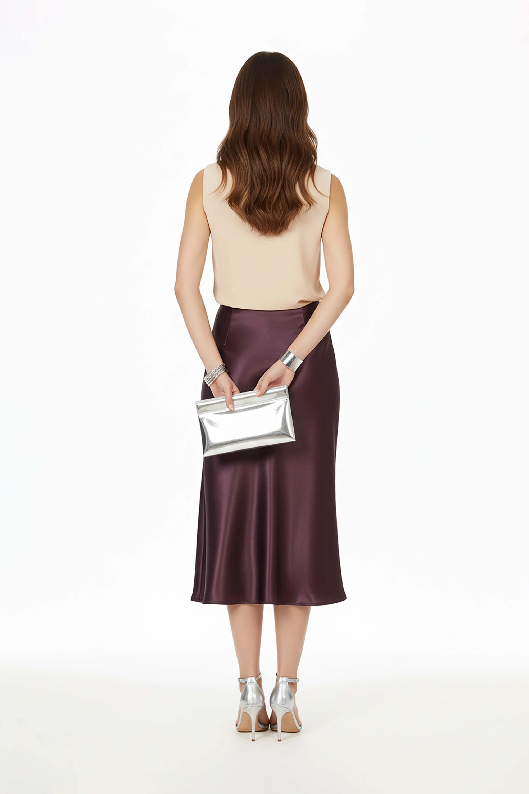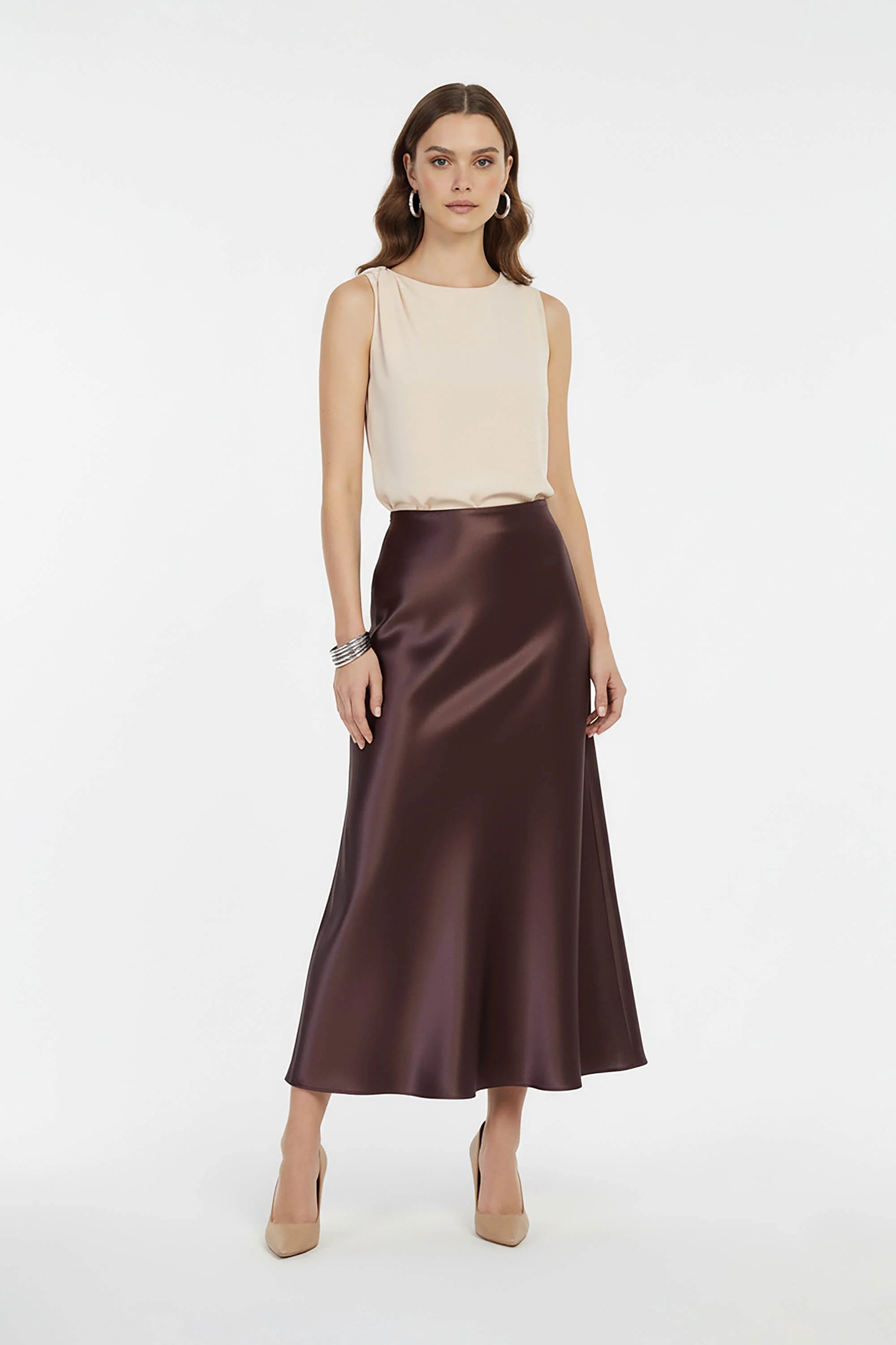 Esta falda en línea A de satin . Su silueta estructurada al cuerpo y sutilmente amplia hacia el ruedo estiliza la figura con naturalidad y libertad de movimiento.